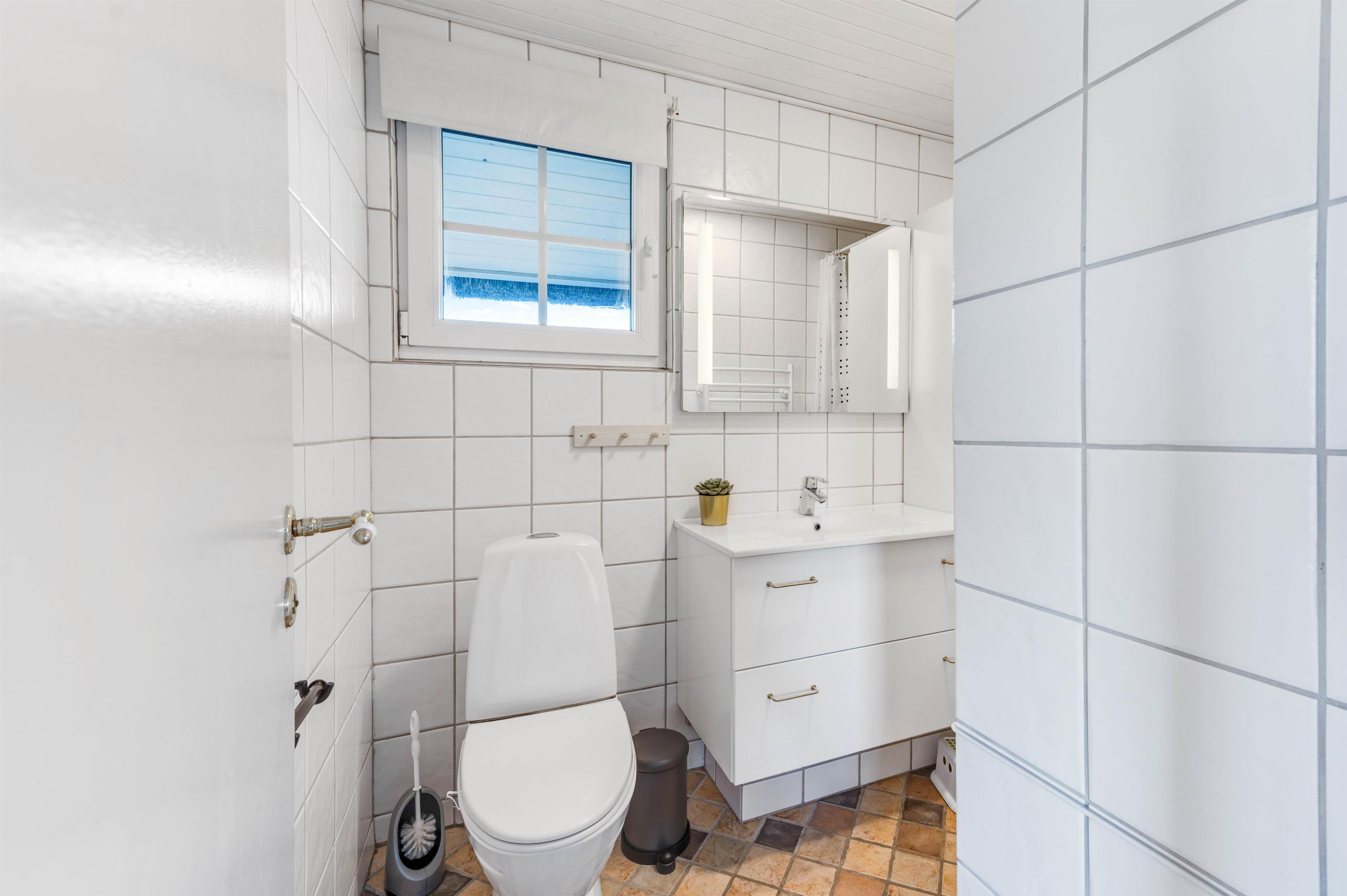 Badeværelset er lyst og praktisk indrettet med fliser fra gulv til loft. En energibesparende varmepumpe sørger, sammen med brændeovnen, for at holde energiforbruget på passende niveau.