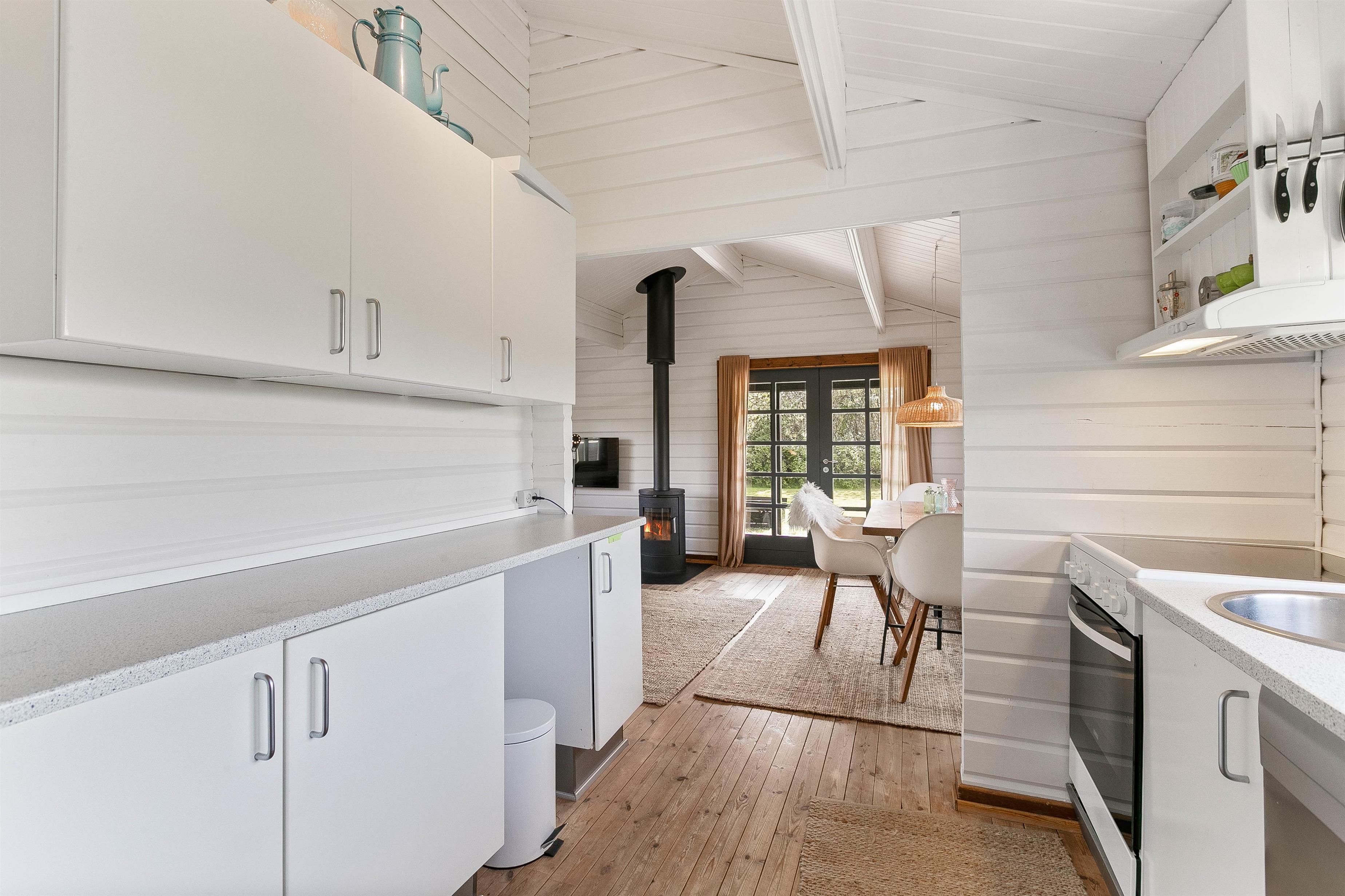 Det enkle køkken med opvaskemaskine, ligger lige ved siden af den hyggelige spiseplads – som samtidig er integreret i stuen. Derved, kan I under tilberedningen af aftensmaden både snakke med de små køkkenhjælpere ved spisebordet, og dem der slapper af i sofaen om de næste dages udflugter. Den knitrende ild i brændeovnen giver Jer også en hyggelig varme, især på de lidt køligere aftener.