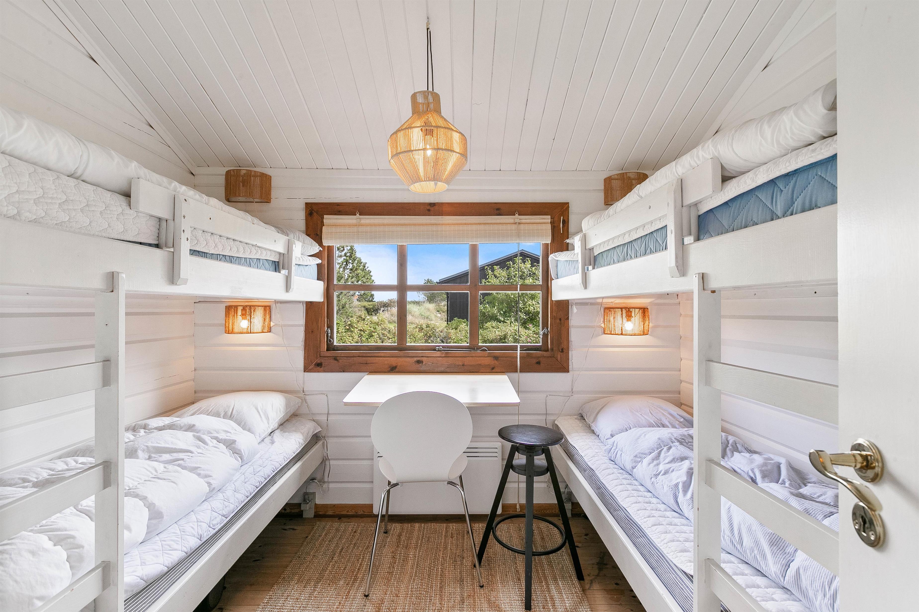 Huset har 2 soveværelser – et med dobbeltseng og et med 2 køjesenge til i alt 6 personer. Omkring huset er en fin træterrasse, så du i løbet af hele dagen kan finde et solrigt sted med læ for vestenvinden. Nye stilheden med vindens raslen i trætoppene, fuglesang og lad dine tanker få frit løb.