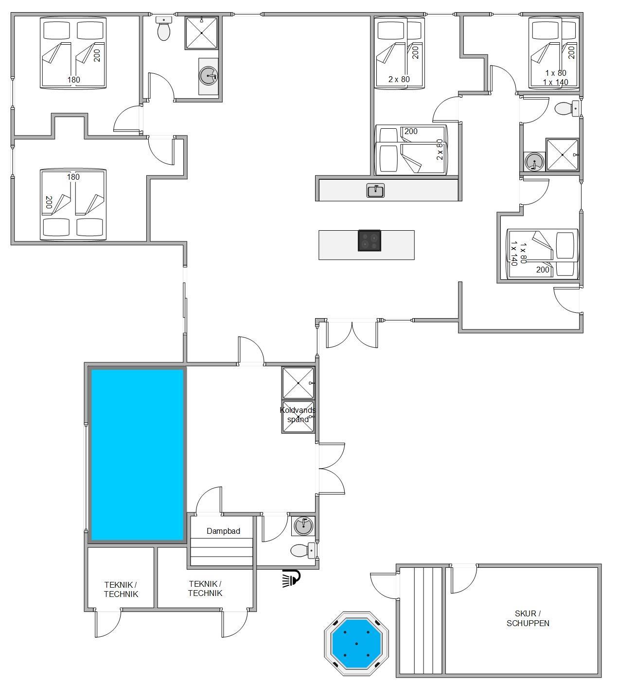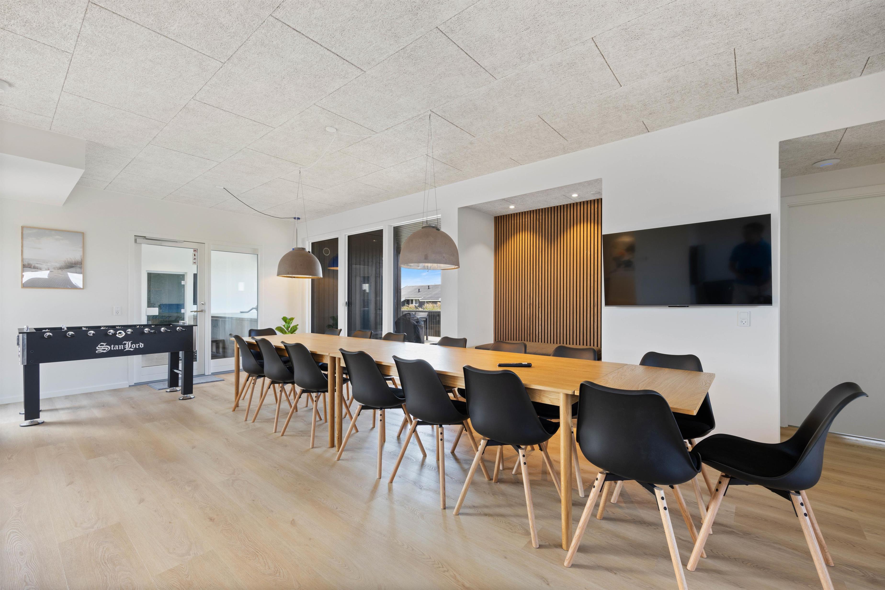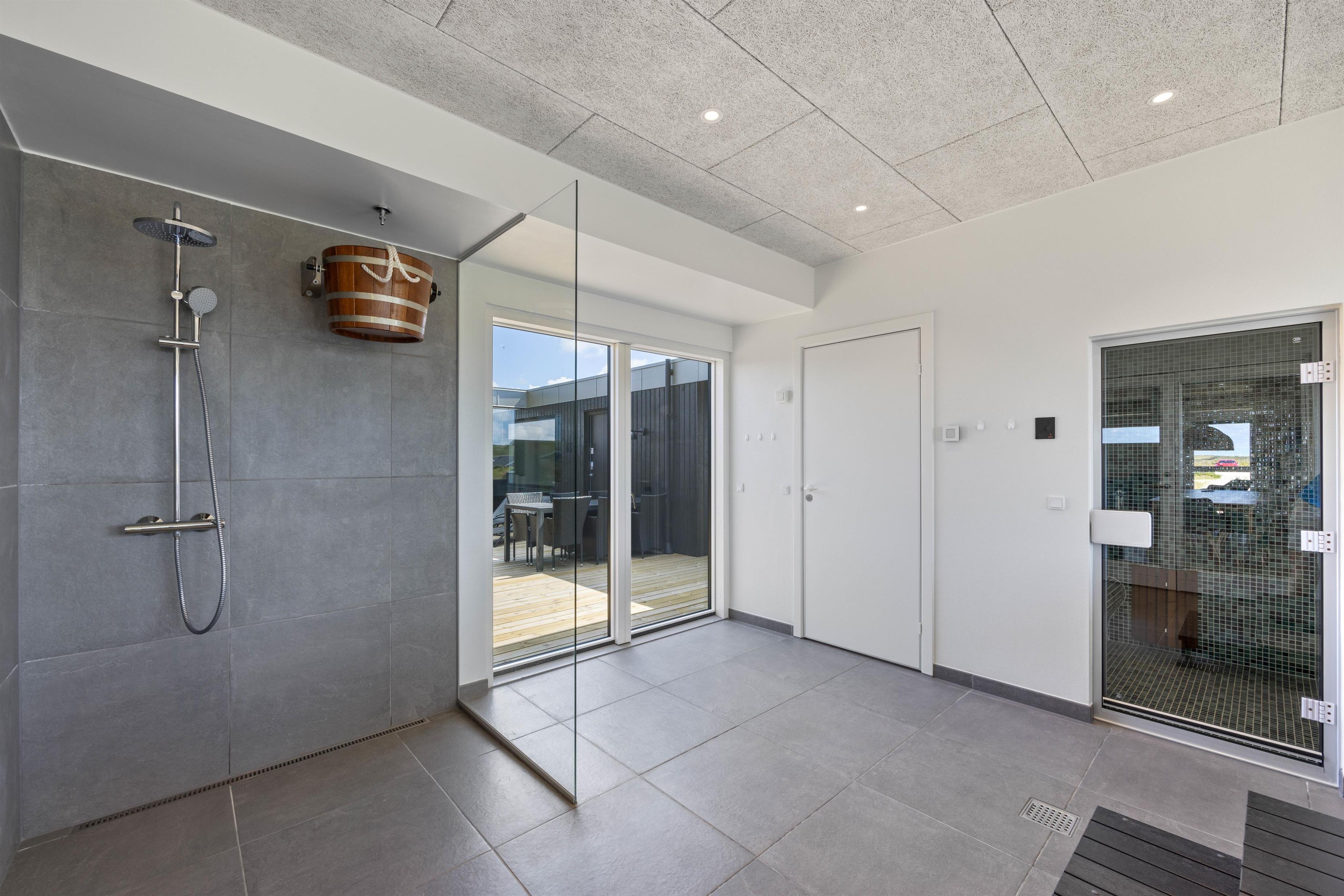 I dagens løb har I mulighed for at dyrke wellness og sidde i poolen, nyde udsigten til sandklitterne om dagen og solnedgangen om aftenen gennem de store panoramavinduer. Poolen har en dybde på 50 cm og er derfor ideel til afslapning eller til at plaske rundt med børnene. Derudover er der dampkabine, koldvandsspand samt udesauna, -bruser og -spa, og har I brug for at brænde mere energi af, kan I tage et slag bordtennis. Der er 2 badeværelser og 1 gæstetoilet til rådighed for jer, så I behøver ikke kødannelse der.