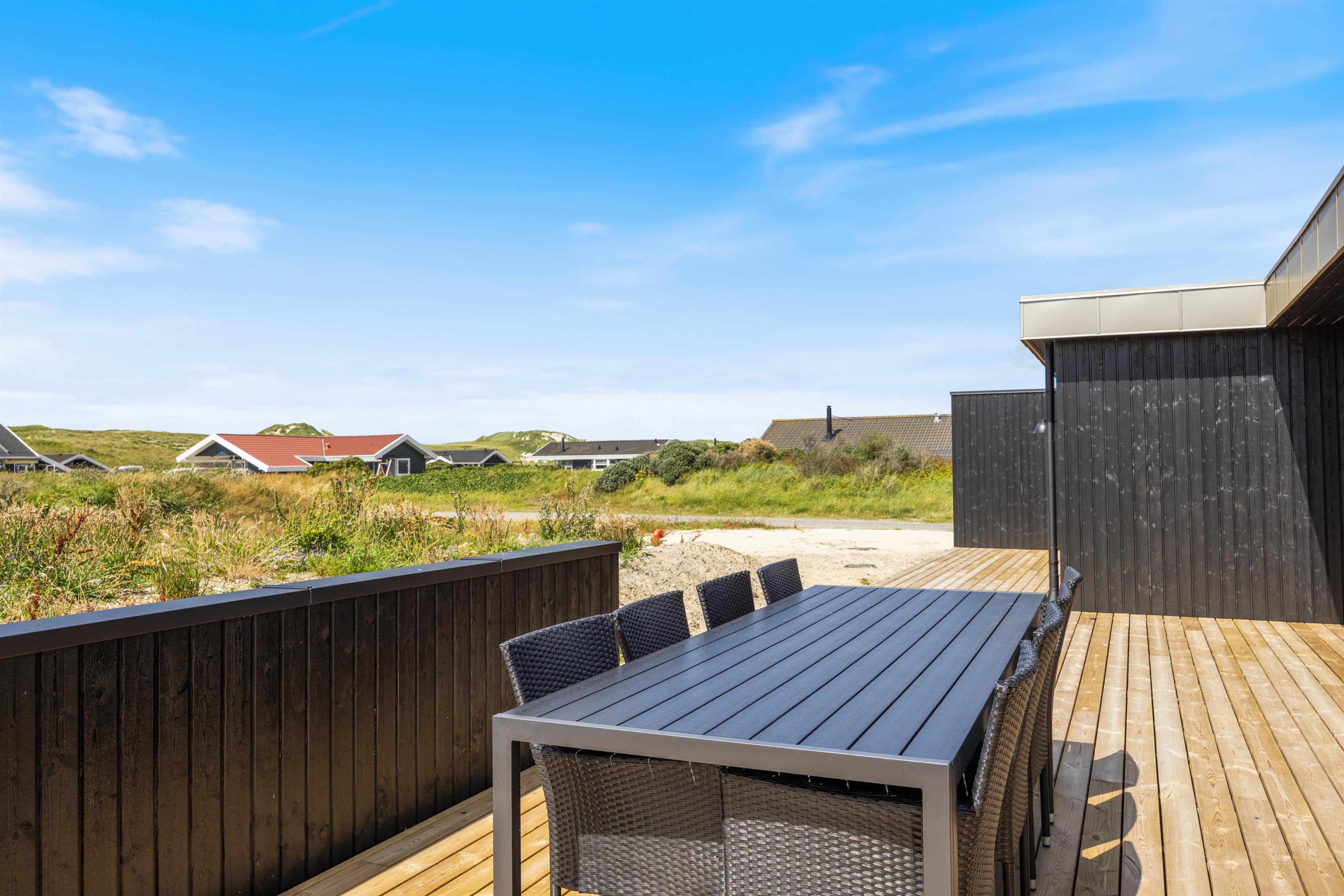 På den åbne terrasse kan I slikke sol i de komfortable liggestole. Bliver solen for stærk, kan I køle af i havemøblerne på den overdækkede del af terrassen, imens børnene udforsker naturgrunden. Med kun 300 meter til havet er det oplagt at gå en tur langs den kilometer lange sandstrand. Er vejret til det, kan I også tage en hurtig dukkert i Vesterhavet, før I går tilbage til feriehuset og bliver skyllet af under udebruseren, som kan benyttes fra april til november. Slut dagen af med at tænde op i grillen og nyd et lækkert grillmåltid sammen, imens skyggerne bliver lange. I kan nå at nyde solnedgangen i Vesterhavet, det er altid en oplevelse.