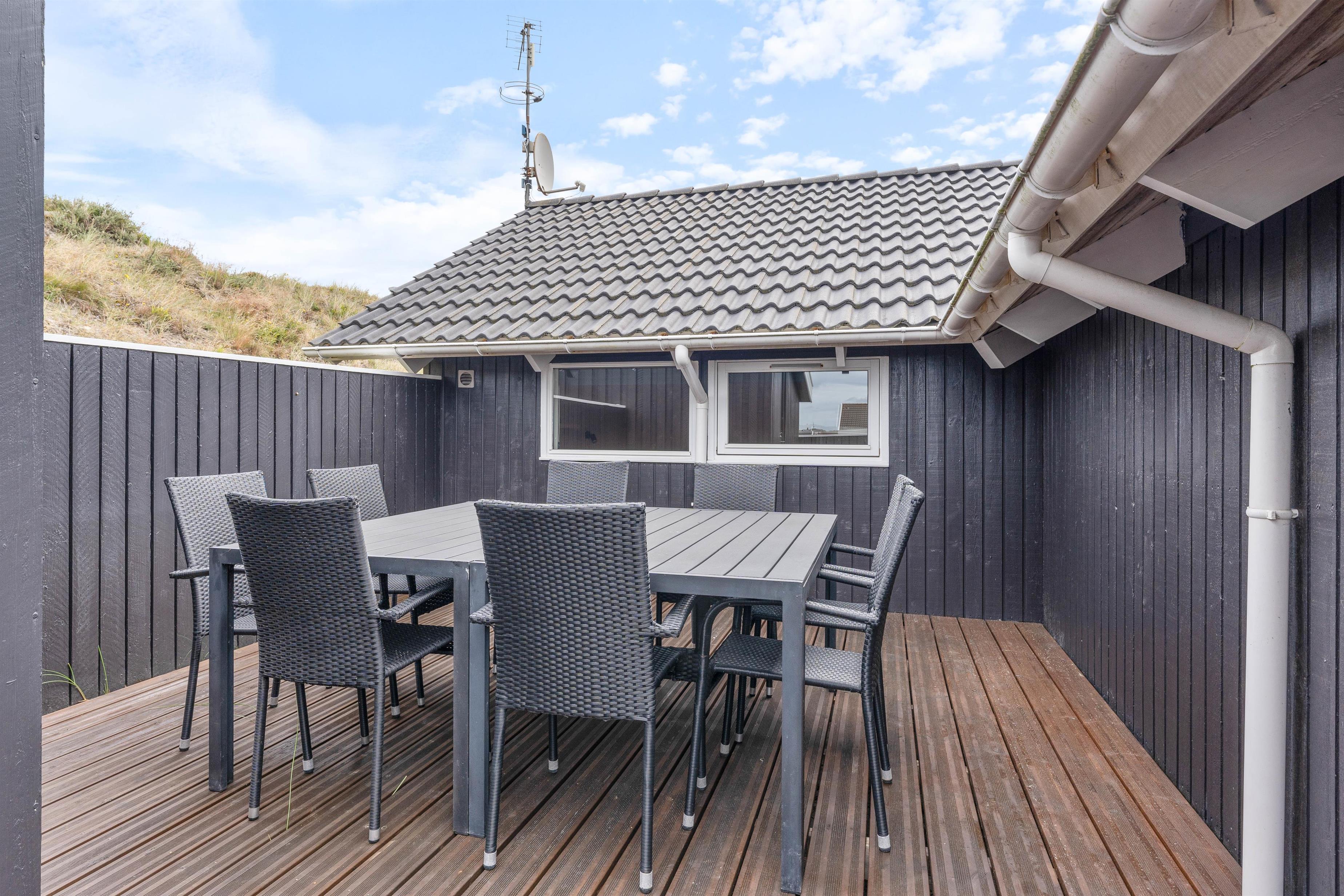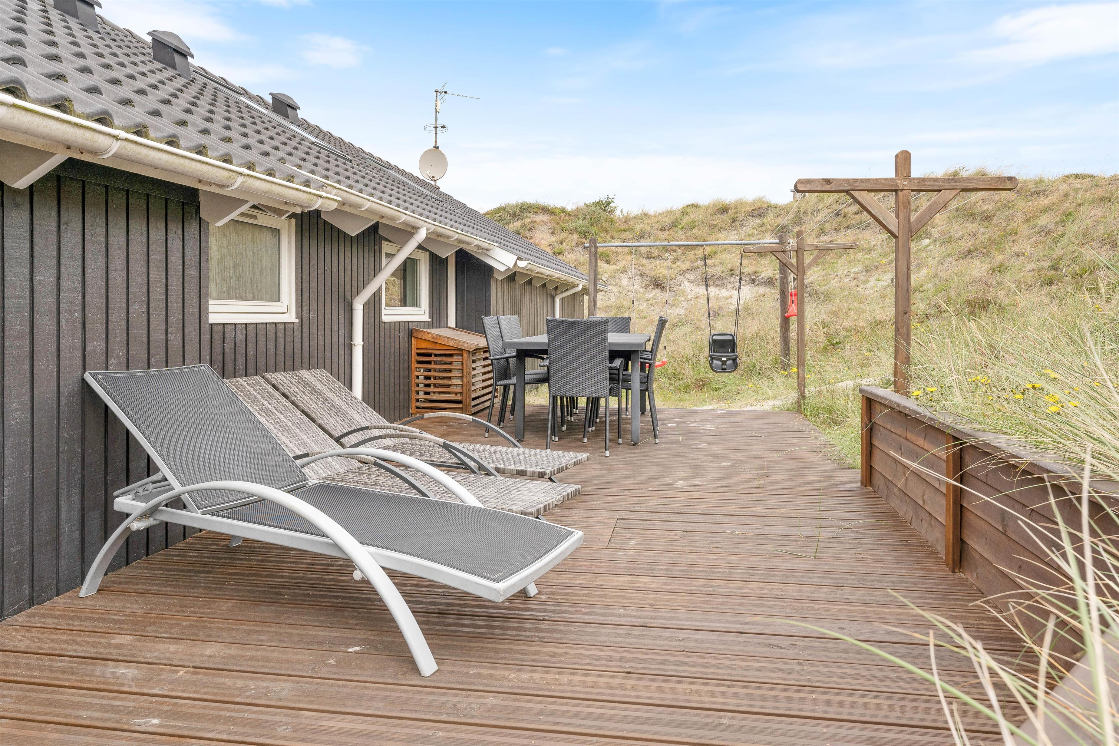 Omkring feriehuset har du flere gode terrasser, så du næsten altid kan finde en plads med sol og læ. Her kan du dase i liggestolen med en god bog, mens børnene leger lige ved siden af. Terrasserne er naturligvis også helt perfekte til måltider, og i huset er der en el-grill til rådighed.