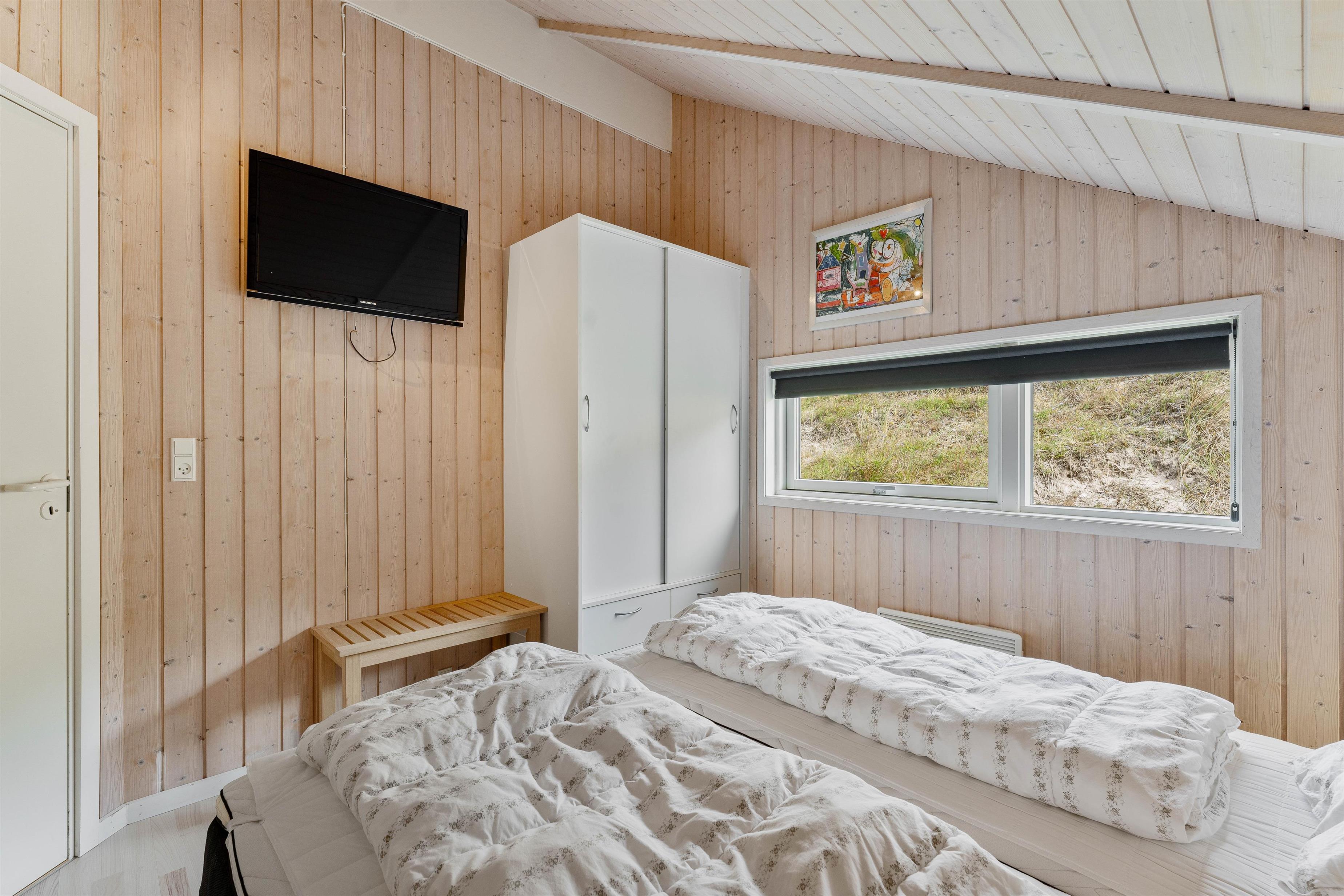 På hver side af opholdsrummet har du to soverum og et badeværelse. Denne fordeling er især god, hvis I er to familier, der holder ferie sammen. I det ene badeværelse har du et dejligt spabad og en god sauna, der står klar, når du trænger til et par stunders wellness og selvforkælelse.