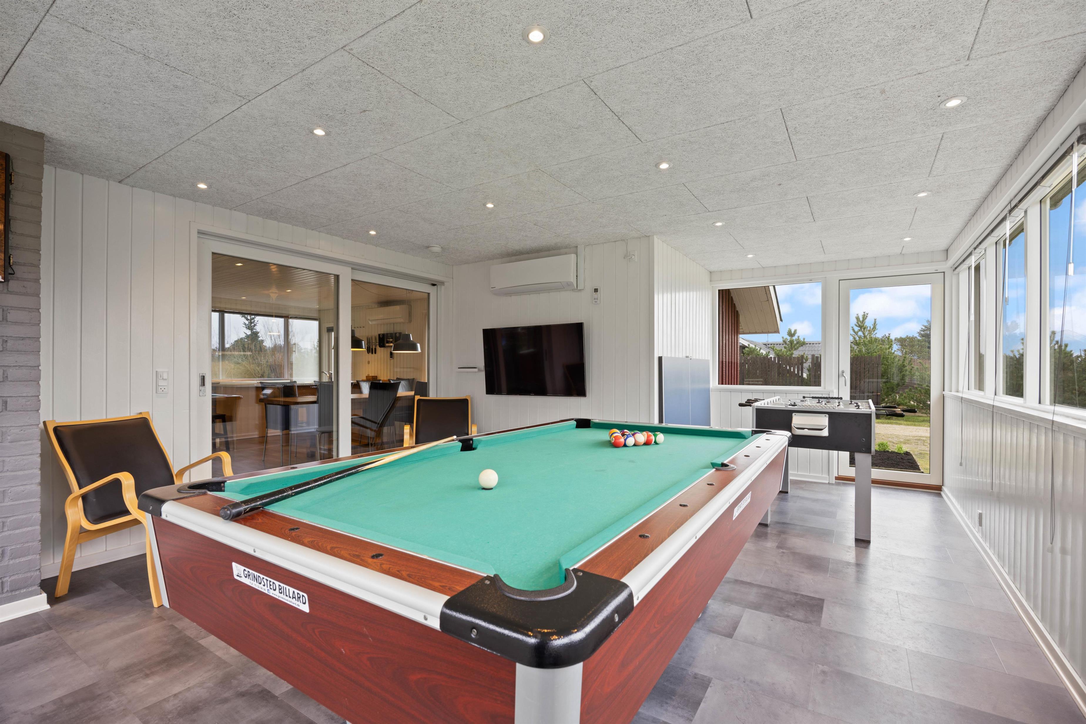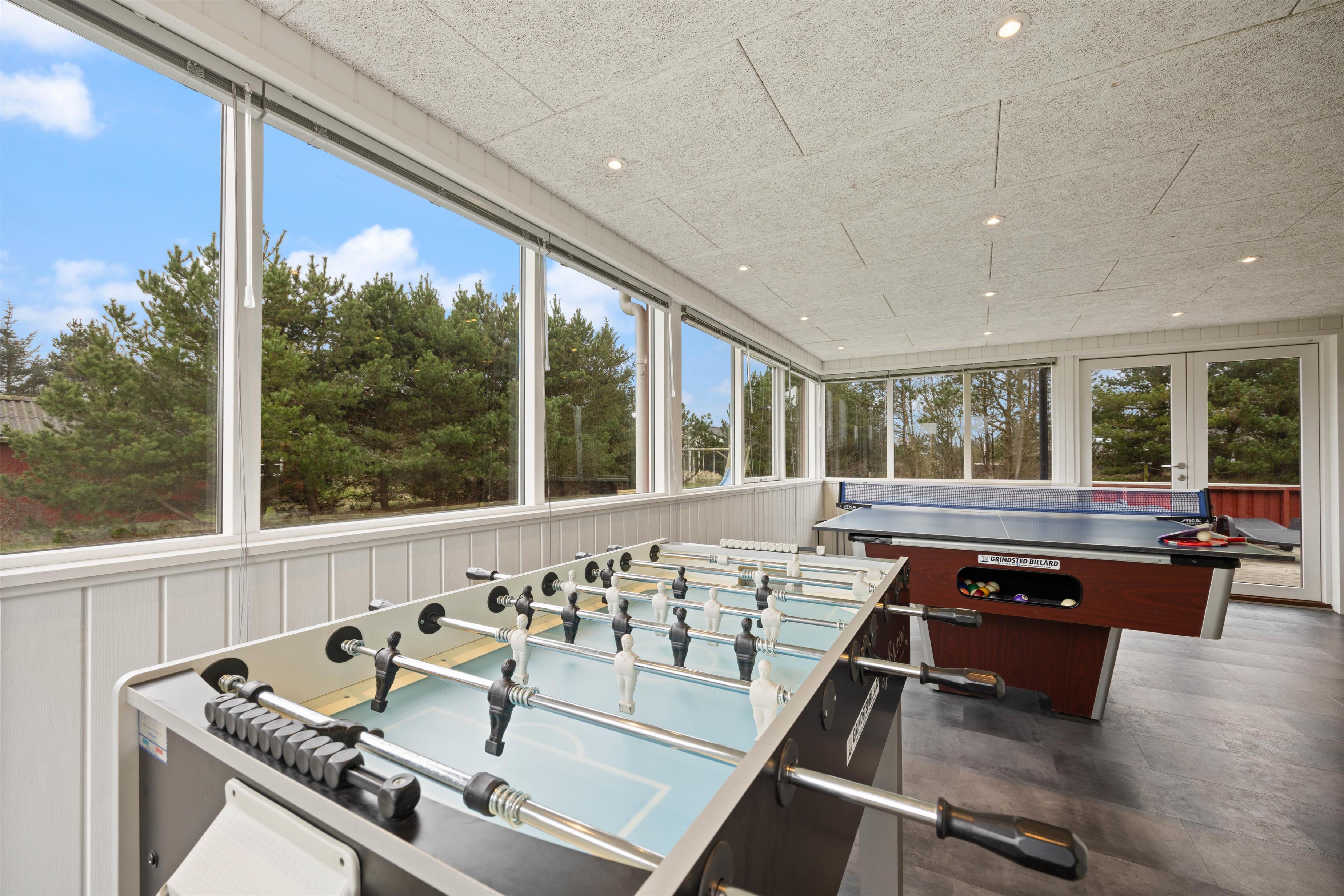 I det store aktivitetsrum kan hele familien rigtig samles til en dyst med diverse spil. – Her finder I både billard, bordtennis, bordfodbold og elektronisk dart. Alt sammen perfekt til turneringer og familiehygge på højt plan – måske efter en lang dag i naturen.