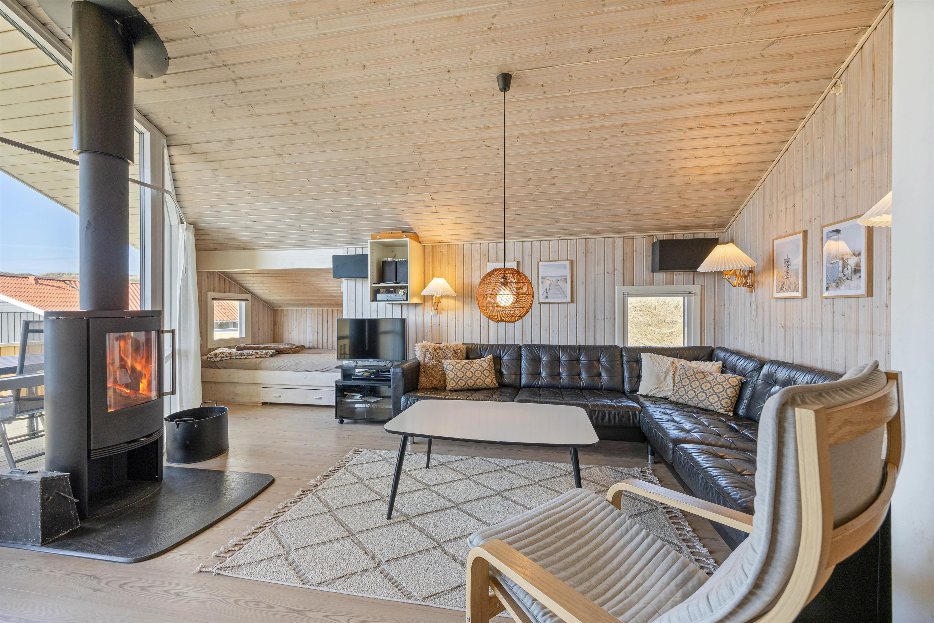 I stuen er der lagt op til afslapning; her kan I for alvor flyde ud i den store hjørnesofa, imens pejsen knitrer i baggrunden. Stuen, hvor der er højt loft, er i åben forbindelse med køkkenet, hvilket skaber en rummelig fornemmelse. Her er plads til at være sammen, mens I har gang i forskellige ting. Ved spisebordet hænger desuden en energibesparende varmepumpe, der sørger for et behageligt indeklima.