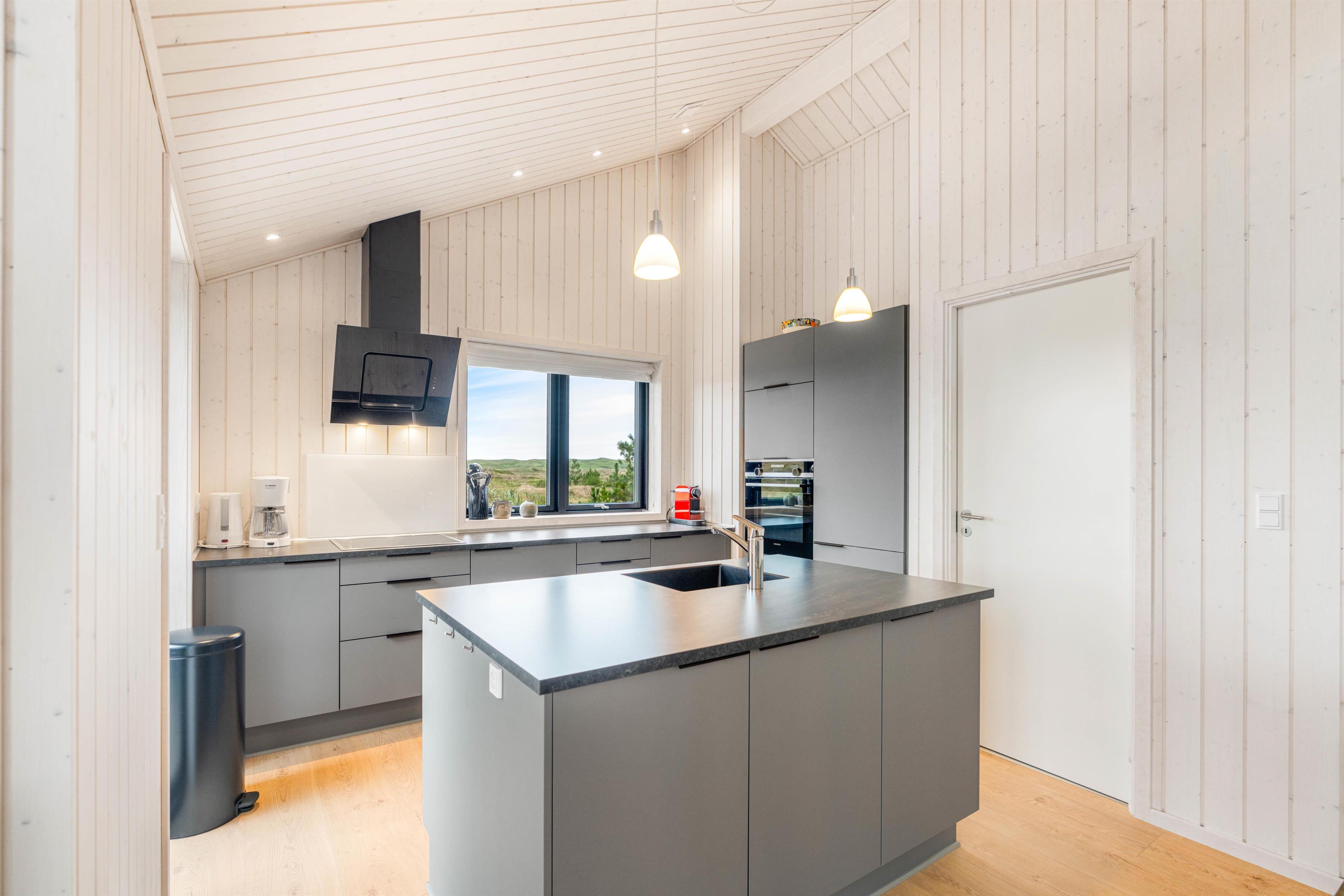 Det rummelige og moderne køkken ligger i åben forbindelse til den lyse stue. Køkkenet har opvaskemaskine, køleskab med lille skabsfryser (75 L) samt induktionskomfur. Her kan familien samles og i fællesskab tilberede aftenens menu.