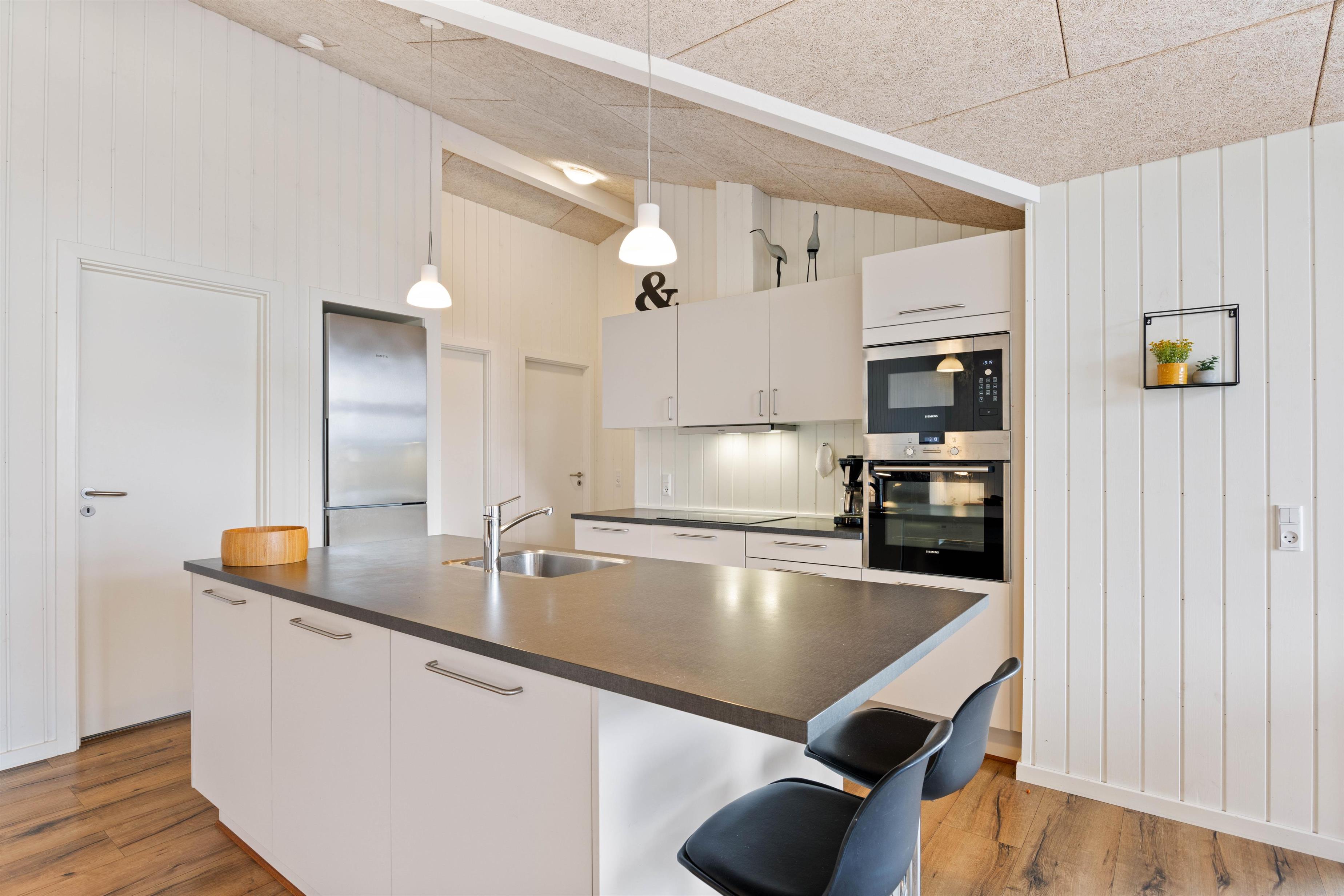 Stue, køkken og spiseområde er smeltet sammen til ét rum, og her vil I helt sikkert kunne tilbringe mange timer sammen. I det åbne køkken finder I alle faciliteter til at frembringe lækre måltider – eventuelt en temaaften med lækre saftige burgere. Her kan I have mange hyggelige stunder i køkkenet, omkring spisebordet eller i stuen med brætspil eller filmhygge – alt imens brændeovnen spreder varme og hygge. Herfra har I adgang til den lukkede terrasse.