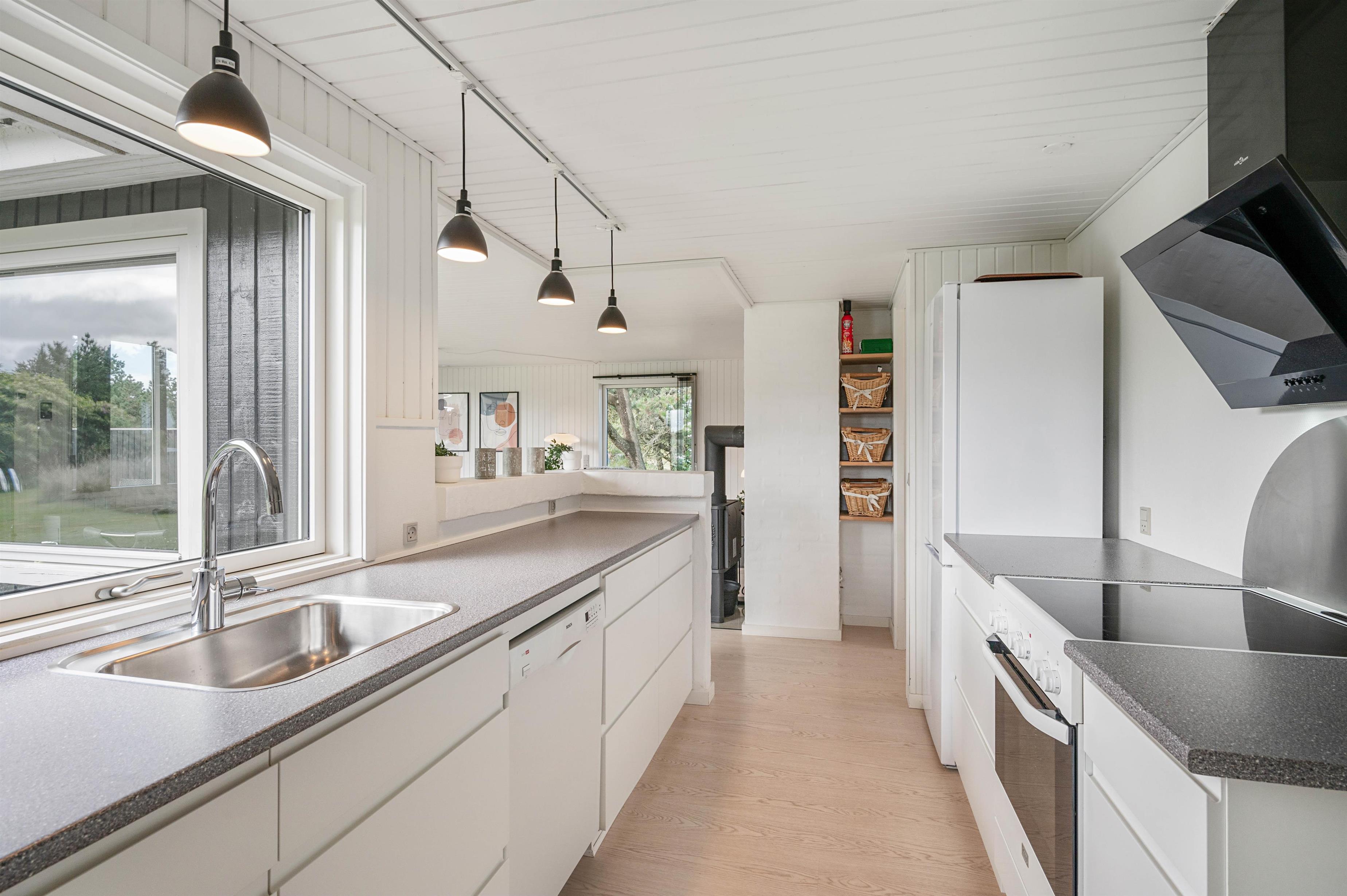 I sommerhuset finder I en rummelig stue, hvor hele familien kan samles. I de behagelige sofaer kan I hygge jer med et brætspil eller et spil kort. Stuen ligger i åben forbindelse med køkkenet, som både har opvaskemaskine og mikrobølgeovn. Centralt placeret finder I brændeovnen, der spreder varme og sørger for den hyggelige feriestemning. I kan med fordel også benytte den energibesparende varmepumpe.