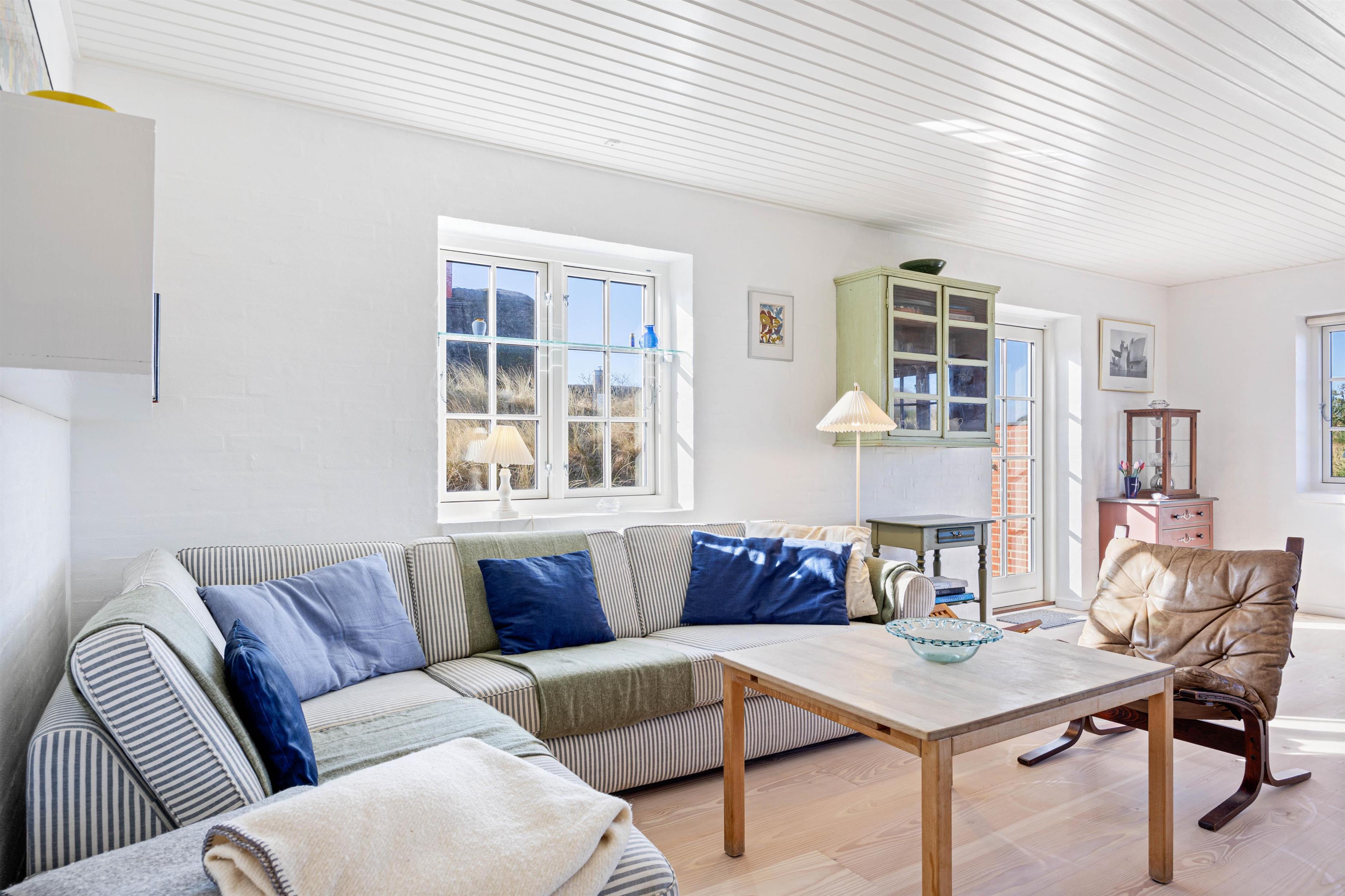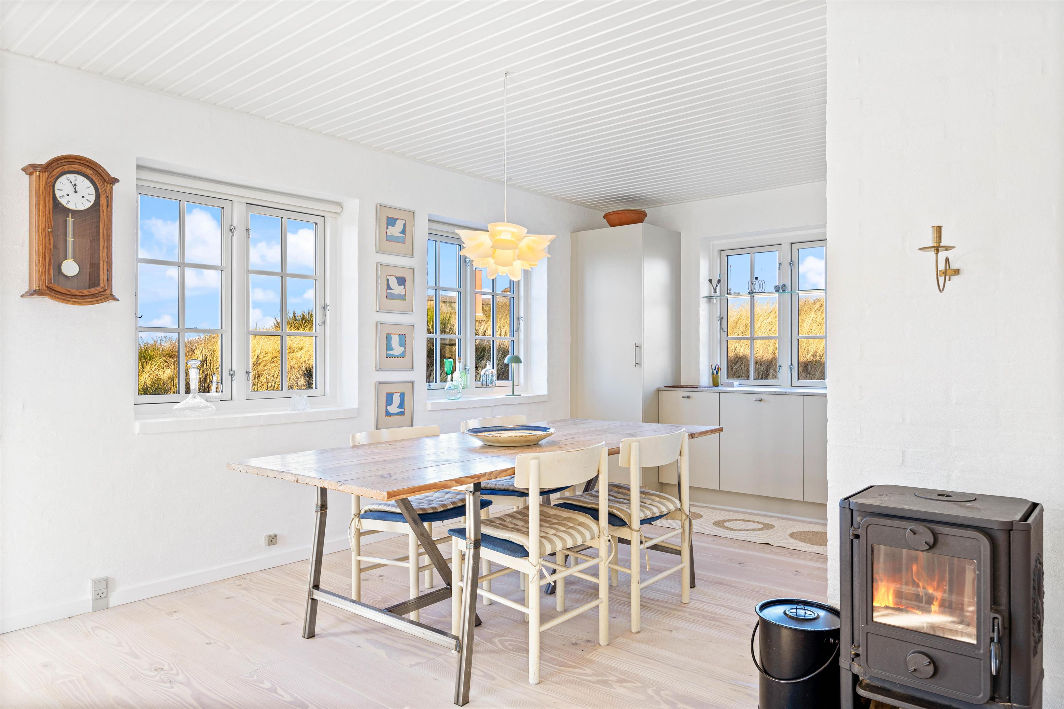 Gør jer det behageligt i det hyggeligt indrettede alrum, der består af køkken, spiseplads og stue samlet i ét. Varmen fra brændeovnen sørger for afslappede og hyggelige aftener efter oplevelsesrige dage ved stranden. Her kan I holde en hyggelig filmaften med en god film, der streames gennem sommerhusets Chromecast. Som et ekstra plus er der en energivenlig varmepumpe i sommerhuset, der sikrer behagelige temperaturer året rundt.