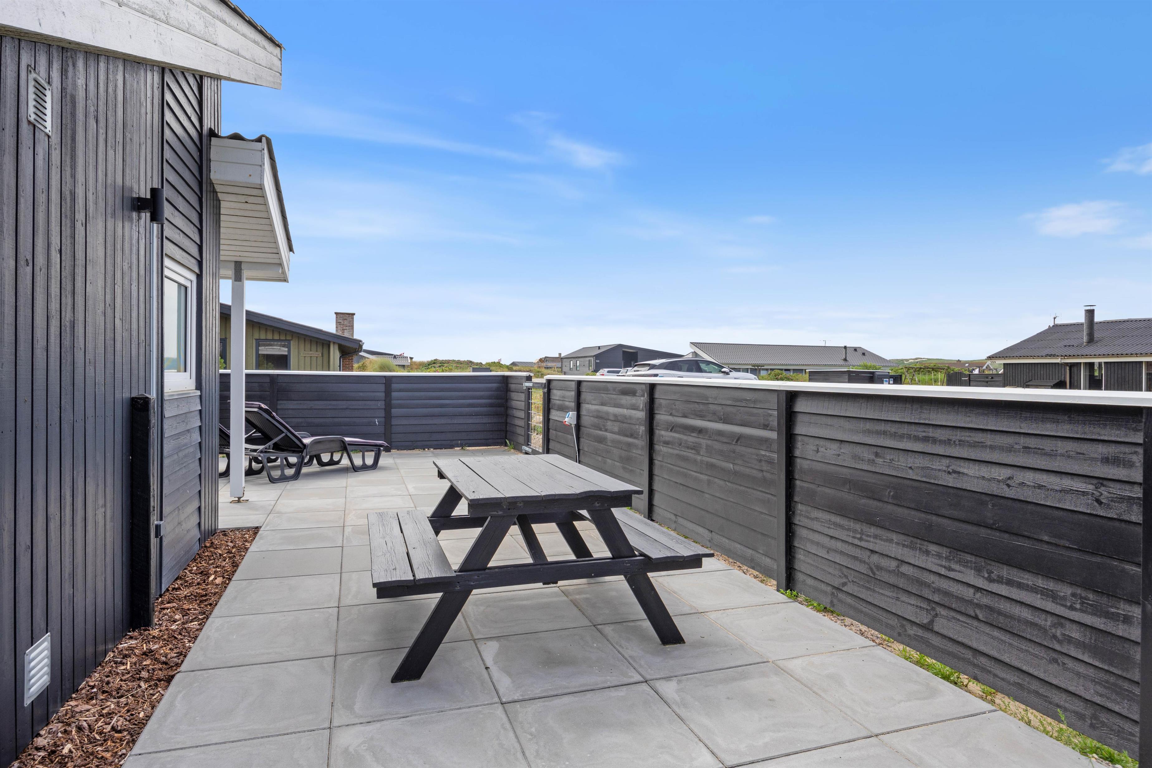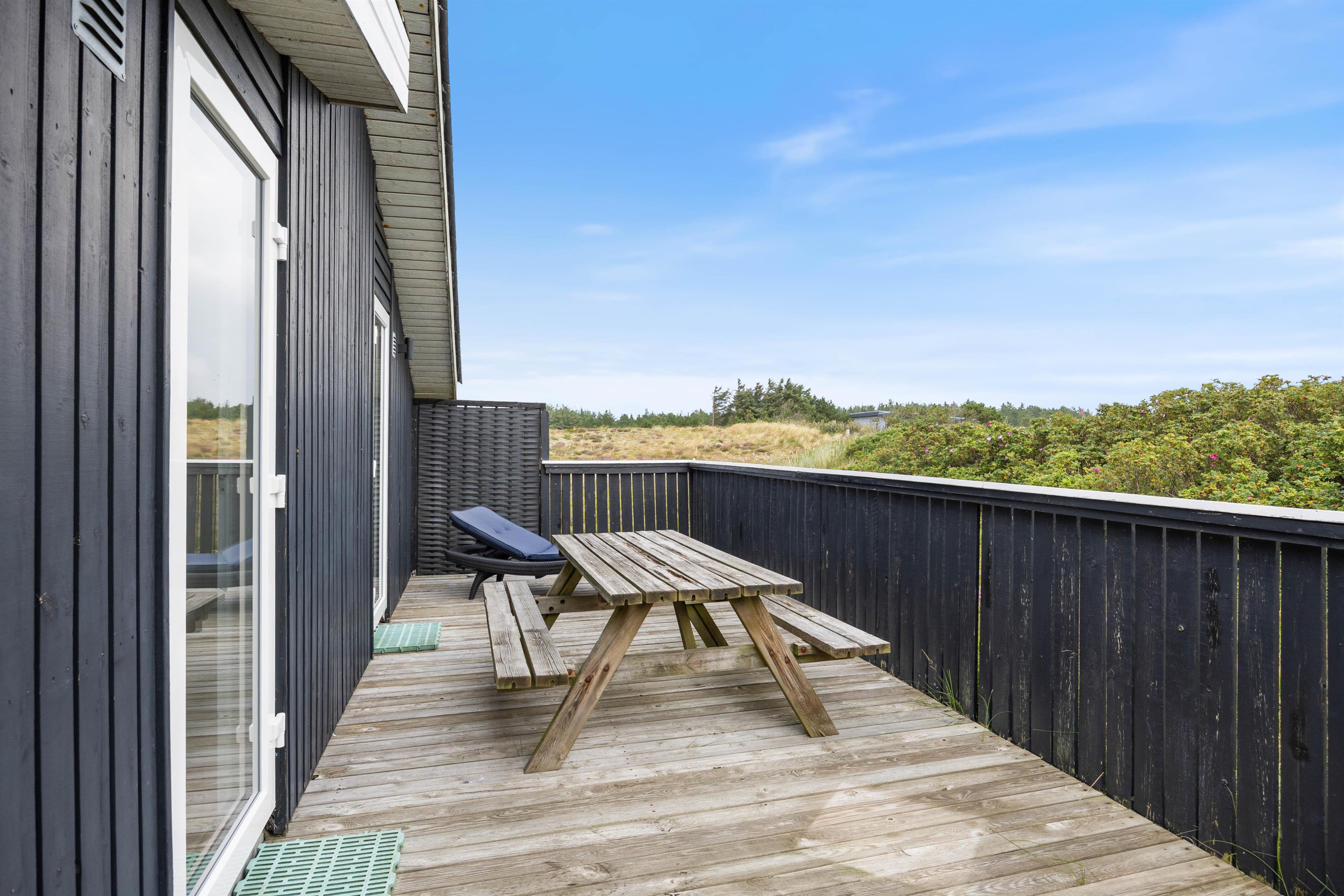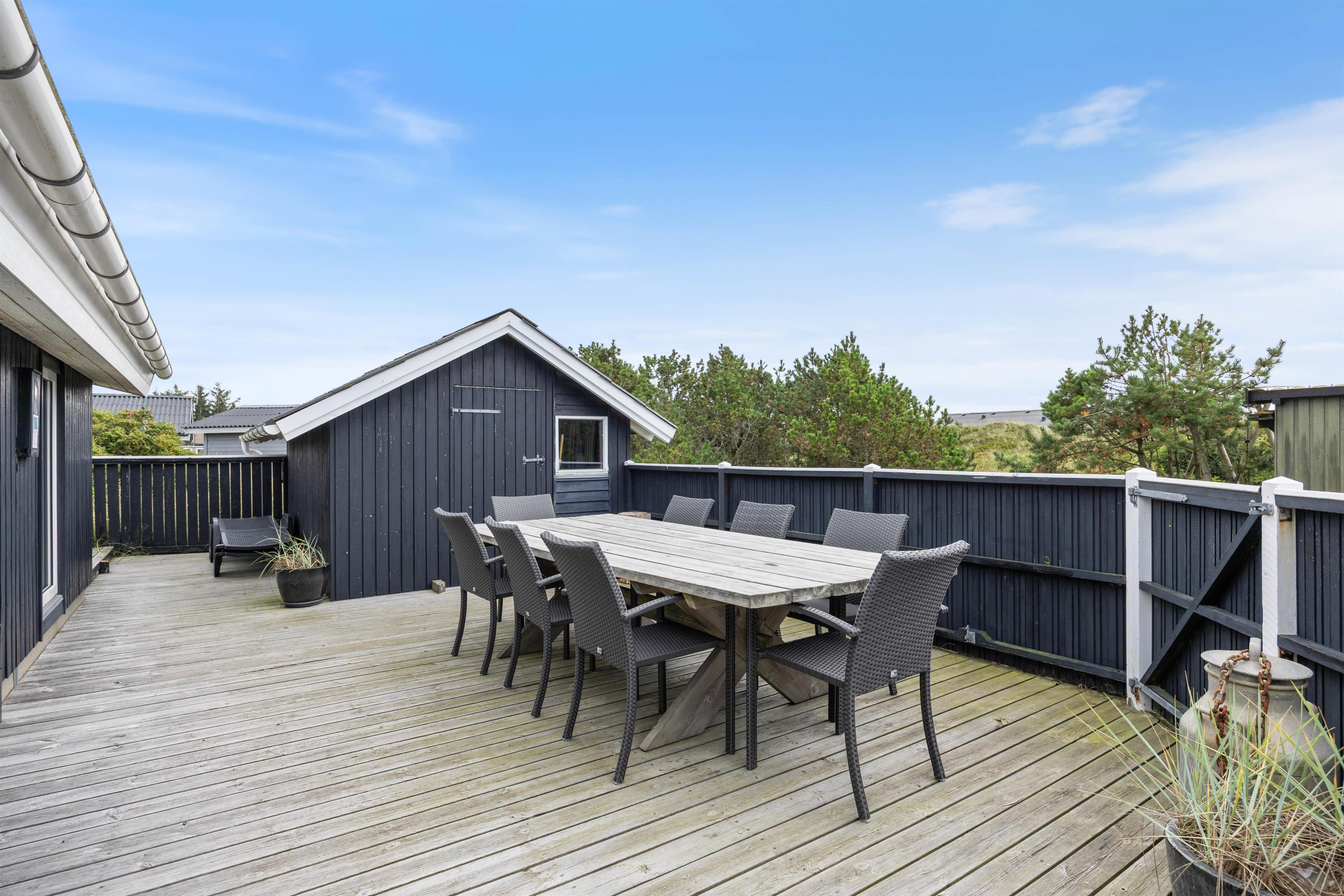 Feriehuset ligger på en 1200 m² stor naturgrund og har to lukkede terrasser. Her kan I lade dine børnene eller hunden opholde sig, uden at de udforsker nabolaget for dig. Sæt dig godt til rette med en kop kaffe i havemøblerne eller liggestolene og nyd den friske havluft.