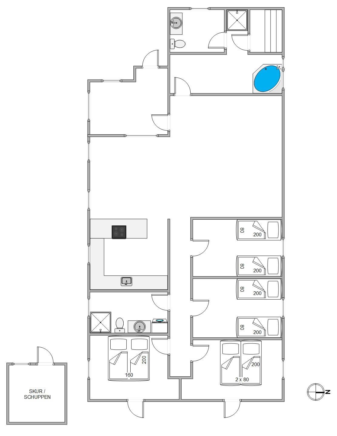 De 2 badeværelser i feriehuset har begge bruser og gulvvarme. Her er også en vaskemaskine til rådighed, så I kan friske håndklæderne op i løbet af ferien. I forbindelse med det store badeværelse kan I slappe af med en tur i saunaen eller i det varme vand i spabadet.