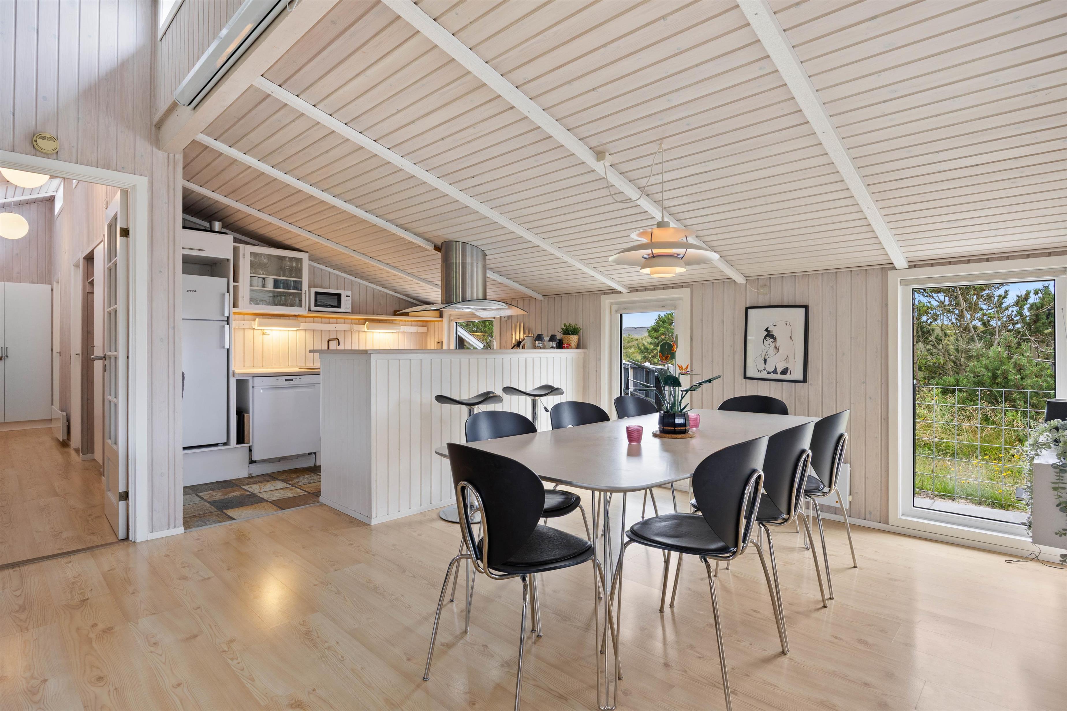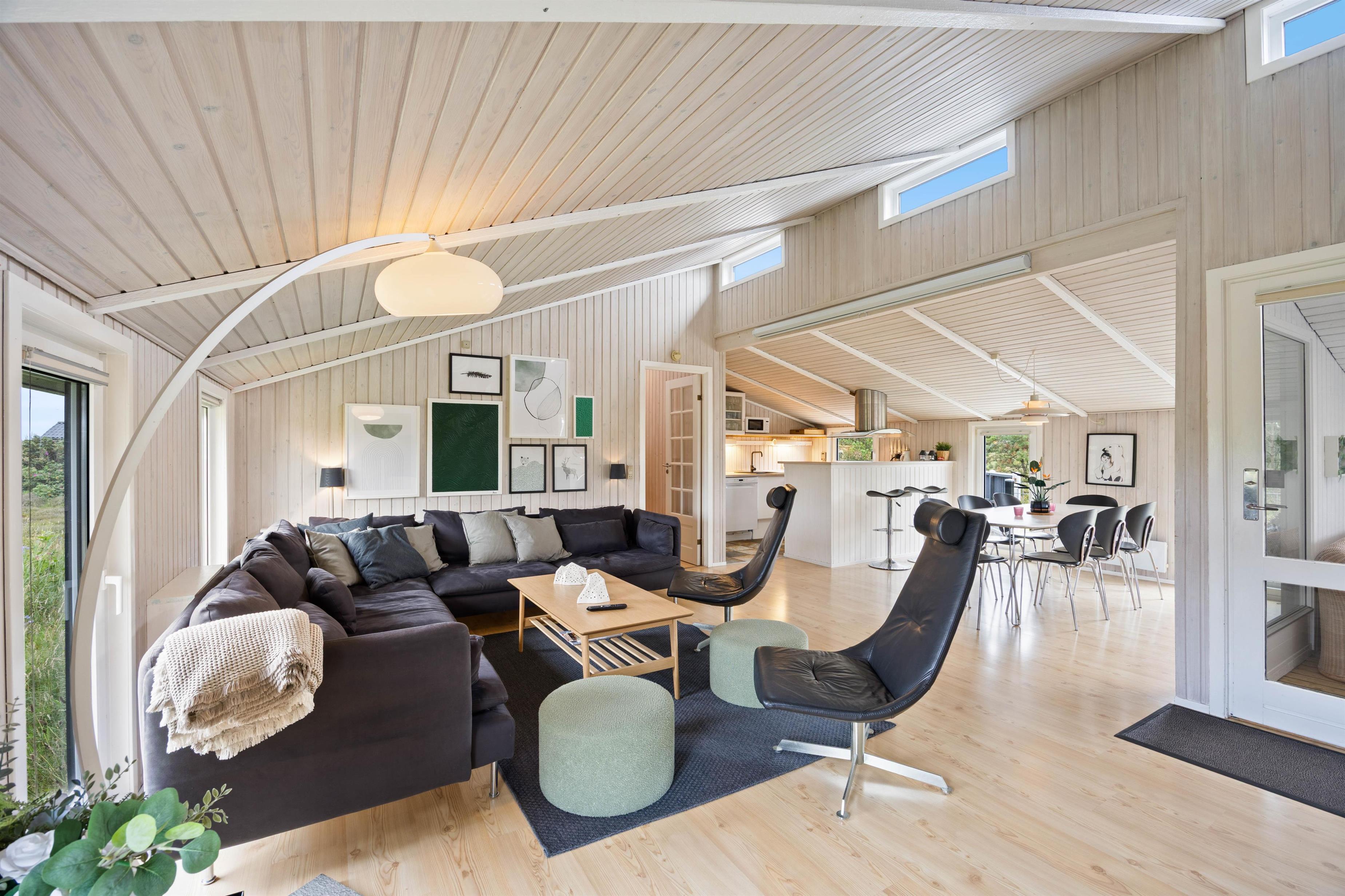 Centrum på Arvidvej 156 bliver den rummelige stue, hvor hele familien kan samles. Lyse trælofter og -vægge og behagelige siddepladser skaber en varm og venlig atmosfære, og indbyder hyggeligt samvær. Med chromecast kan I for eksempel arrangere en filmaften. Tænd op i brændeovnen og nyd ildens knitren og varmen derfra. Den omkostnings- og energibesparende varmepumpe sørger for behagelige temperaturer i feriehuset.