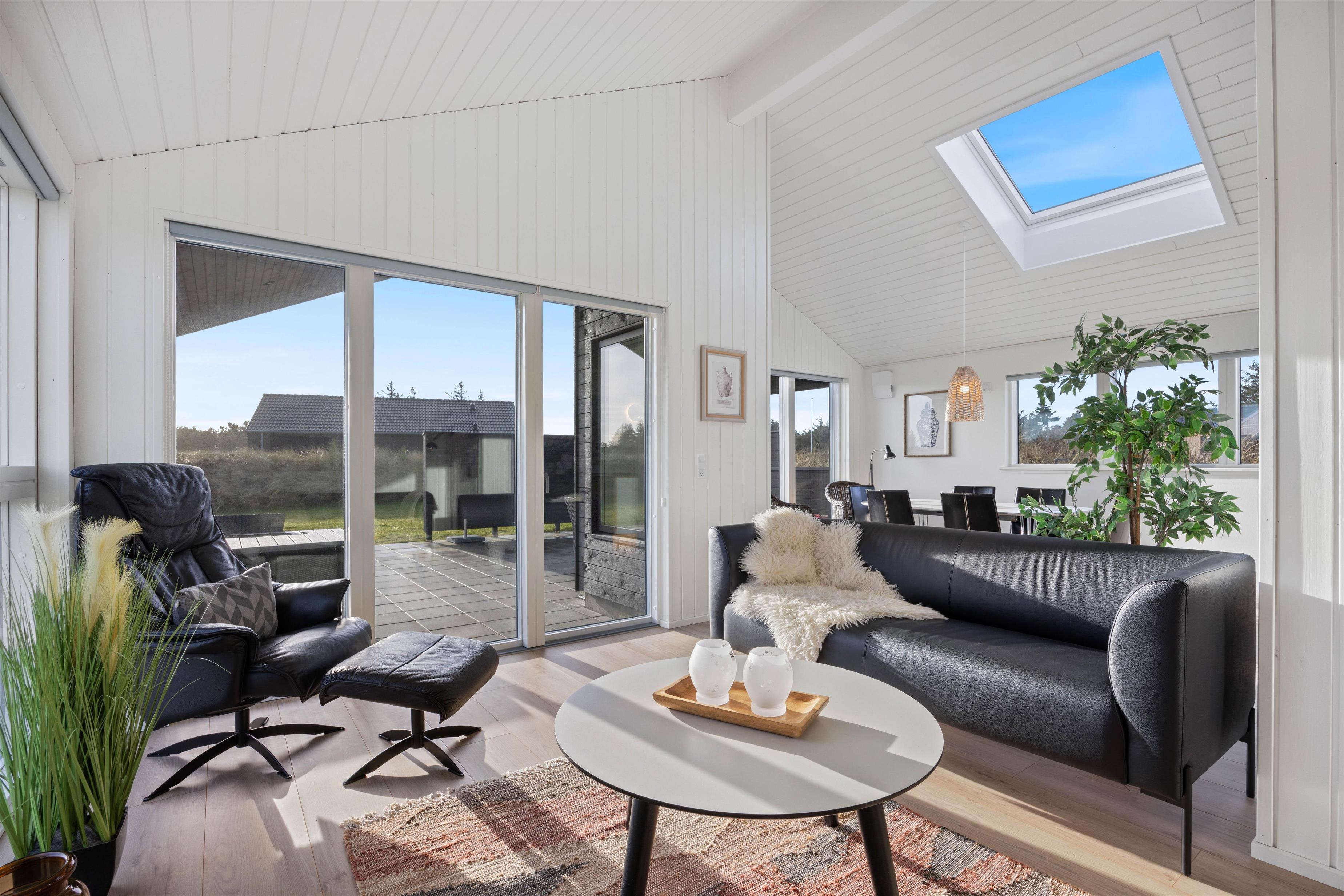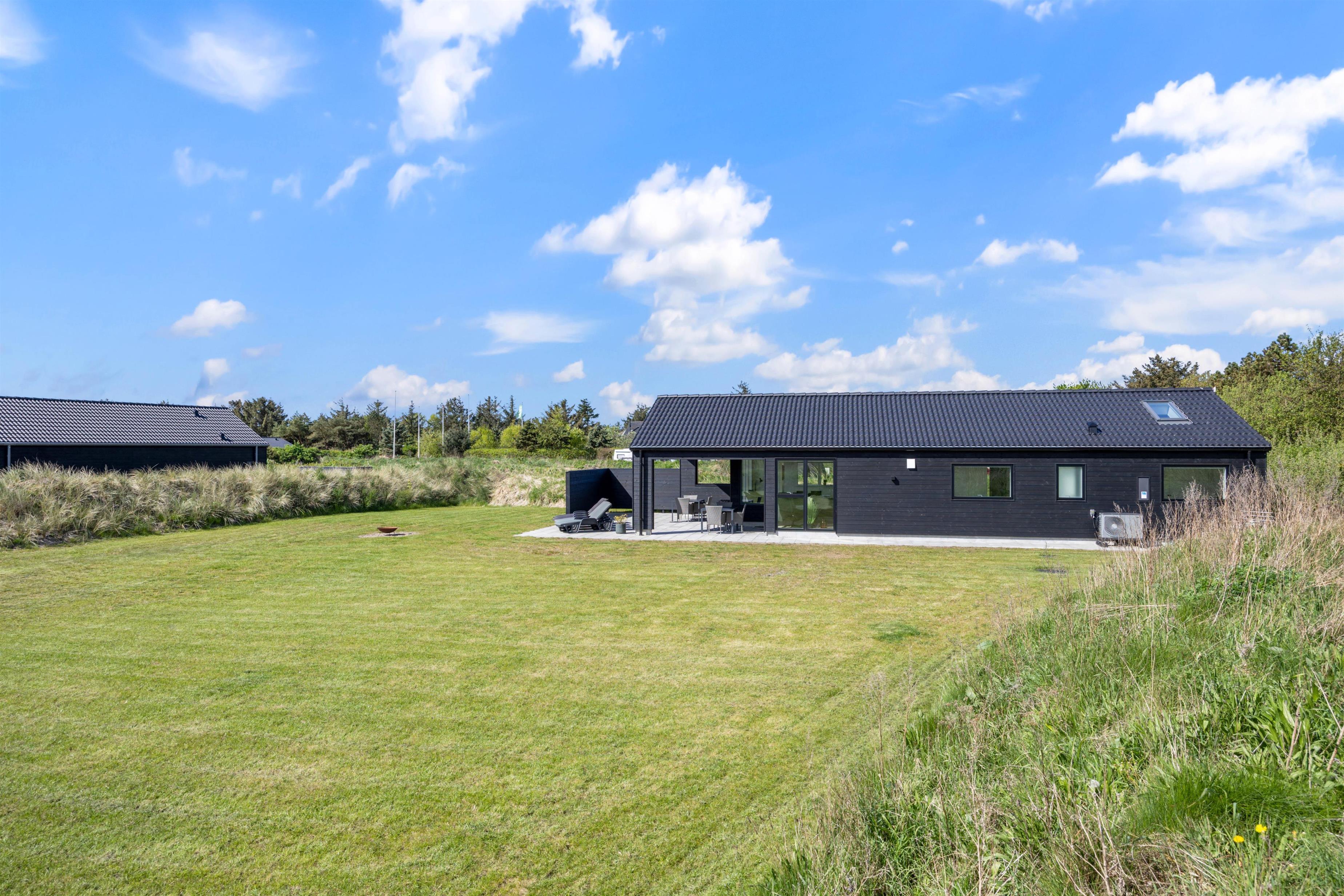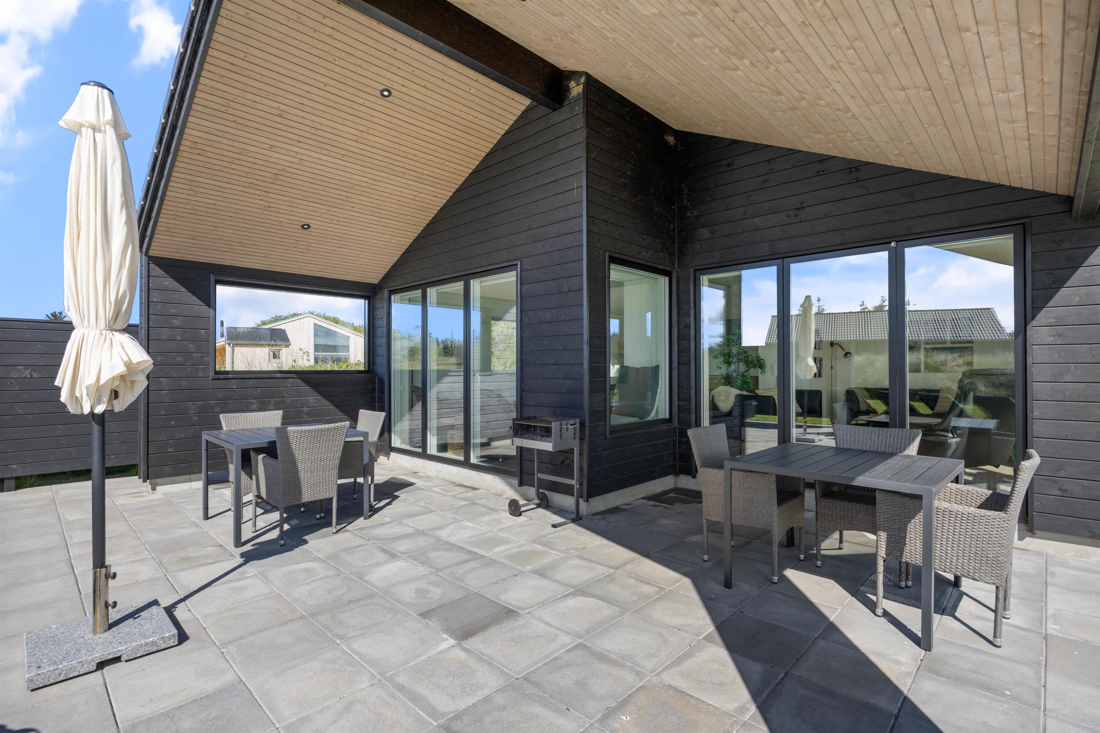 På den delvis overdækkede og afskærmede terrasse kan I nyde måltiderne udendørs eller slappe af på de komfortable solsenge. På den store plænegrund er der masser af plads til at spille et vikingespil eller boldspil med børnene. Tænd op i grillen til aften, og nyd et lækkert grillmåltid imens skyggerne bliver lange. I kan stadig nå en gåtur på godt 1 kilometer til stranden og opleve solnedgangen i Vesterhavet.