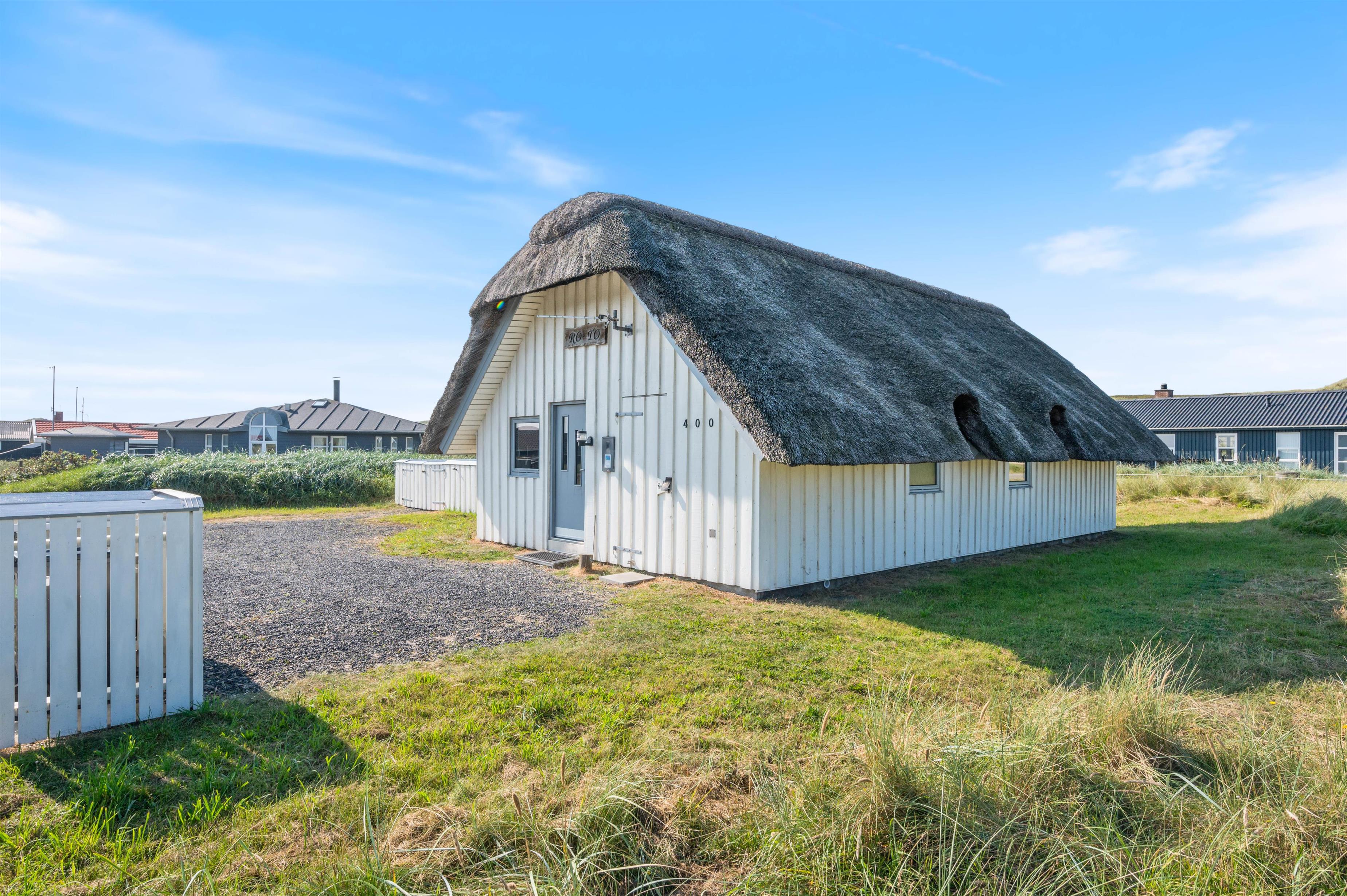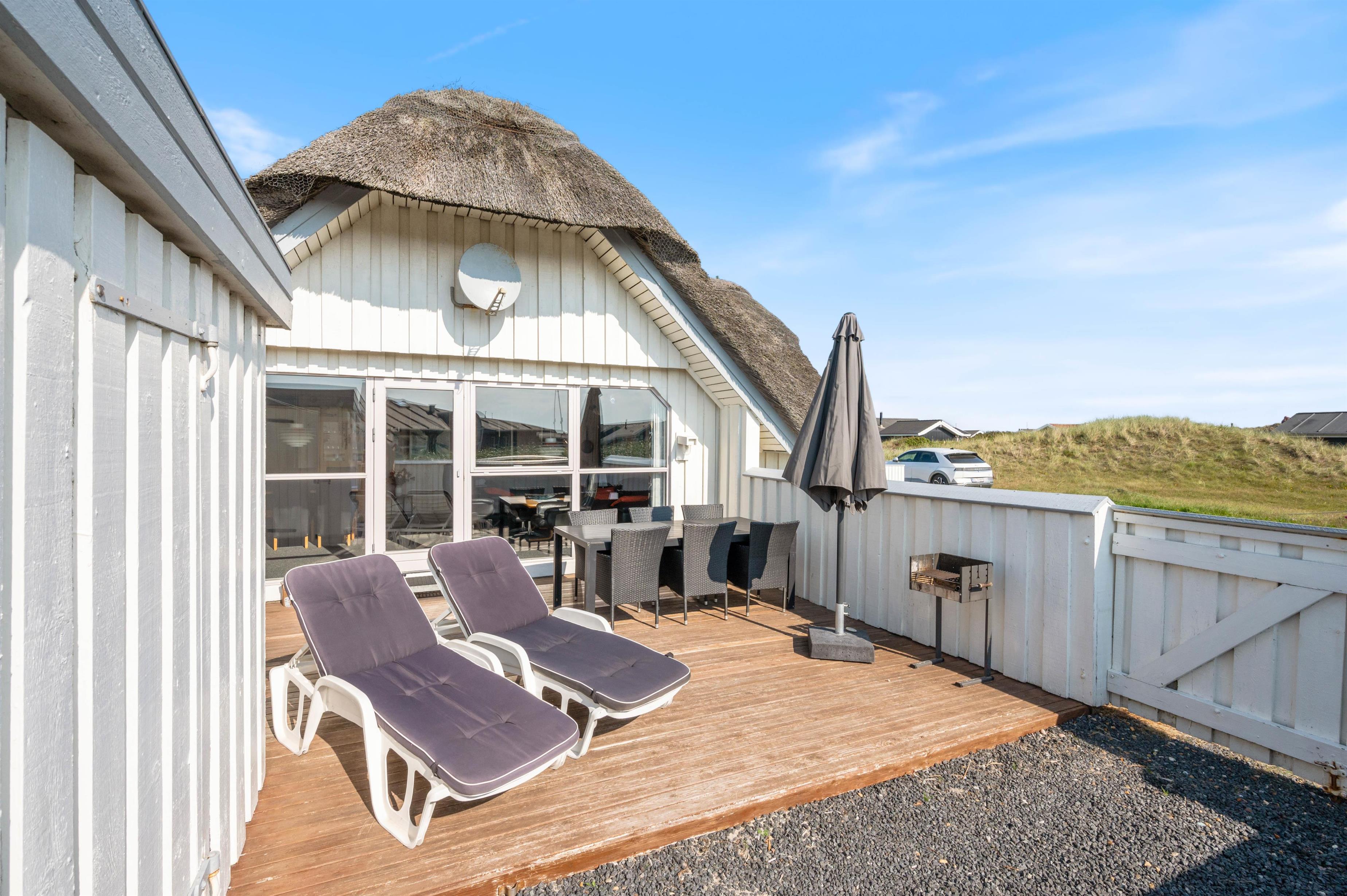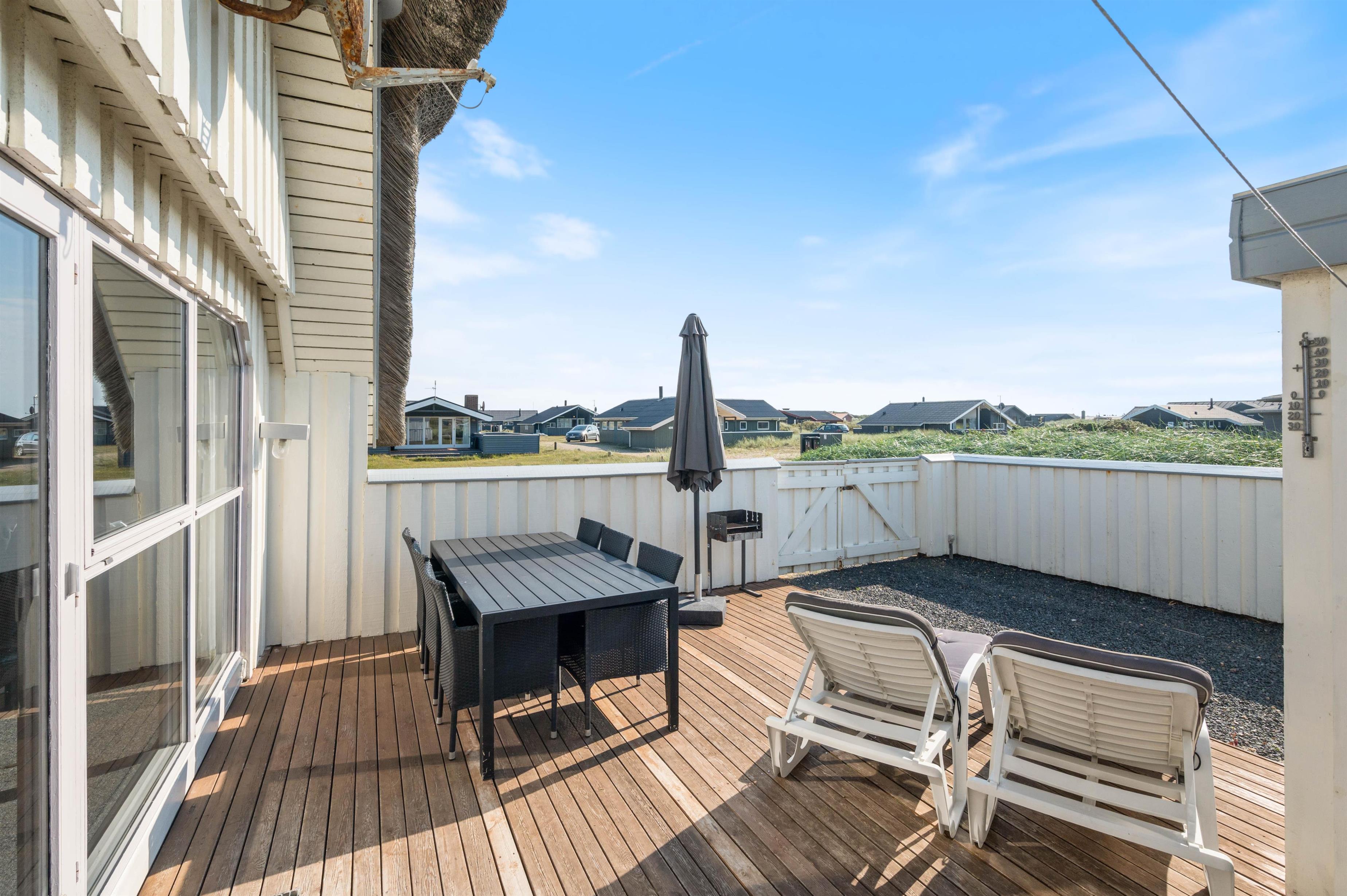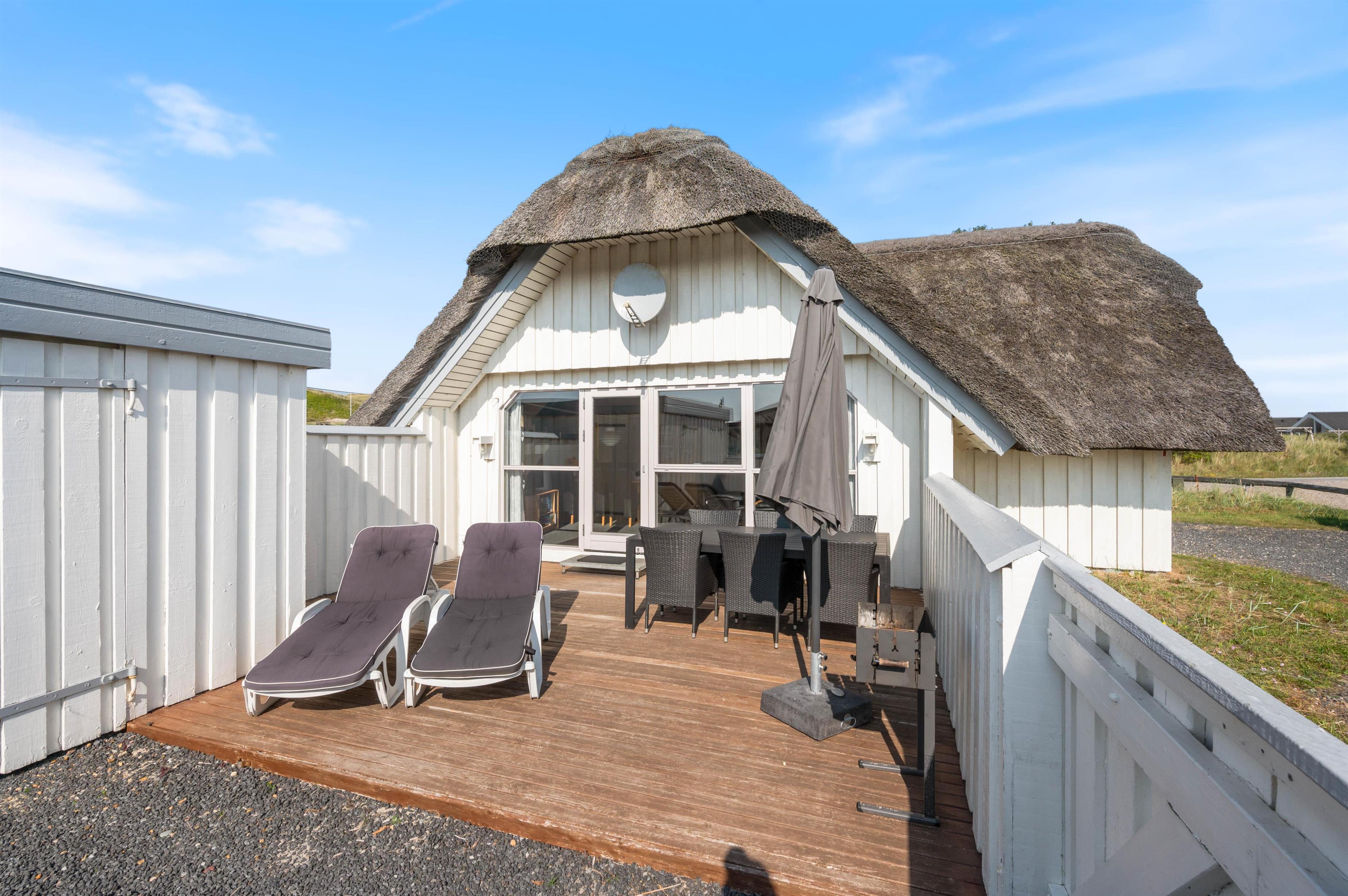 Dette fine klassiske sommerhus med stråtag er beliggende på Bjerregårdsvej 400 få minutter fra Vesterhavet, der kun er 100 meter væk. På den lukkede terrasse kan de mindste boltre sig, og det samme gælder familiens hund, som også er velkommen.