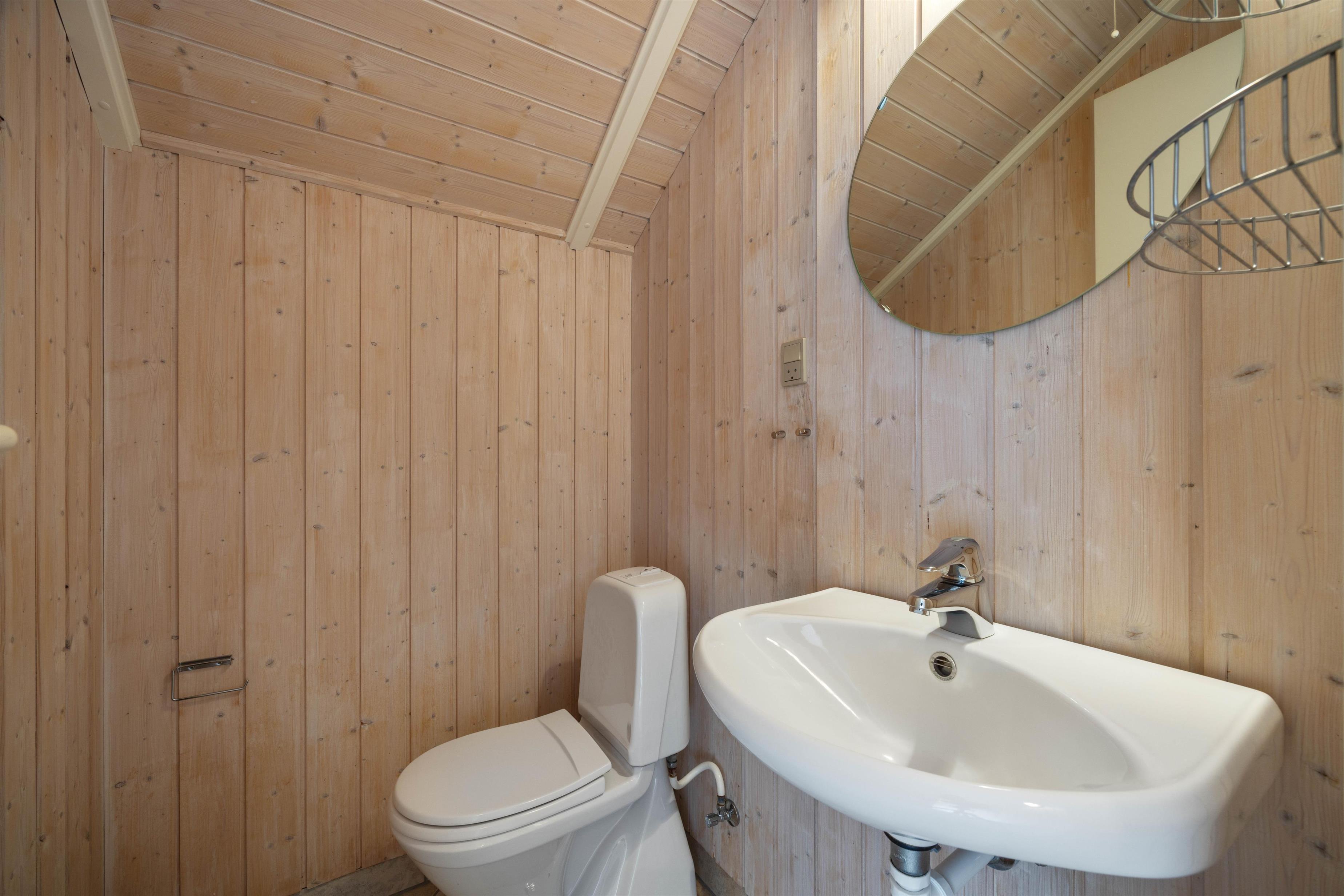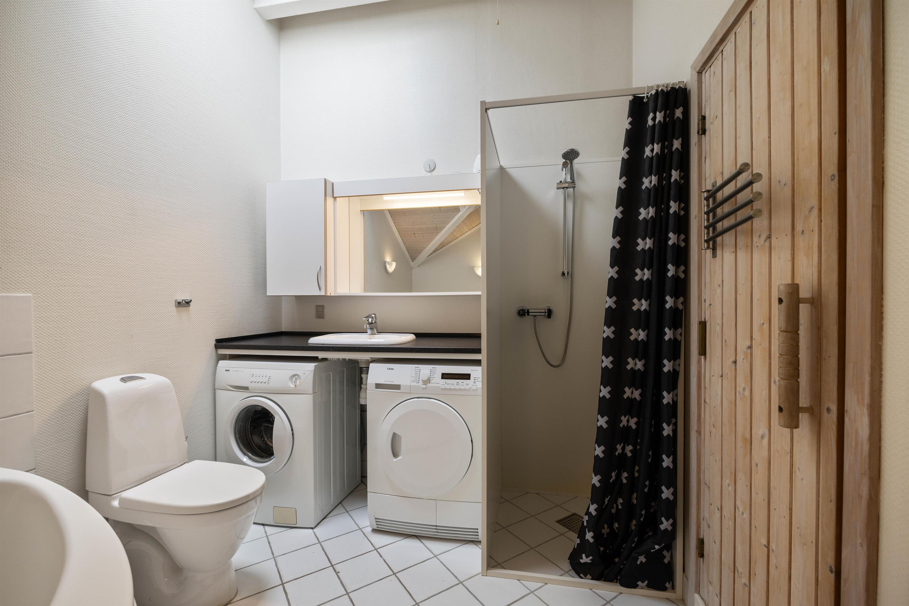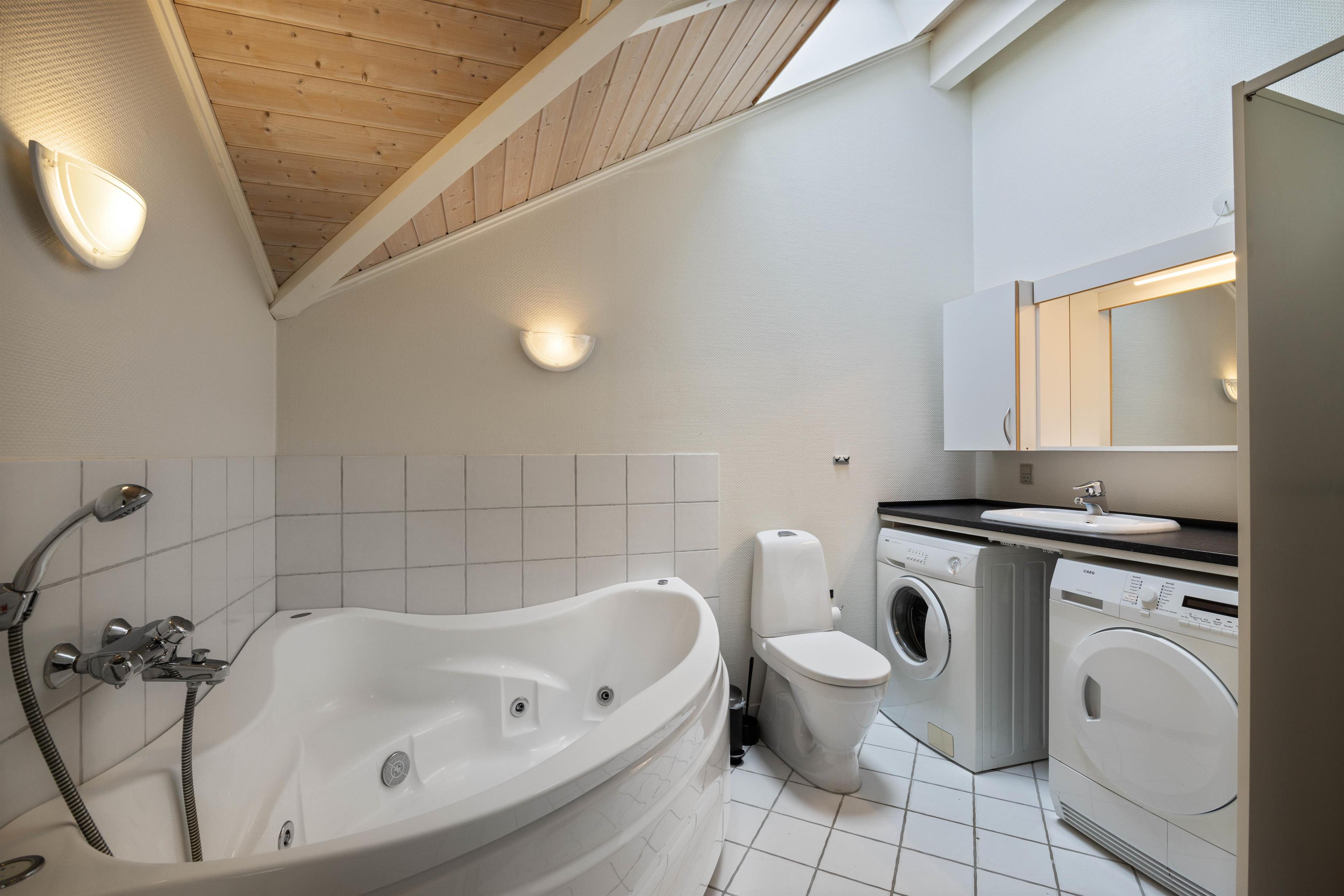 Trænger I til ekstra afslapning byder sommerhusets badeværelse med gulvvarme på både spabad og sauna, hvor I rigtig kan komme helt ned i gear. Som et ekstra plus har sommerhuset også et gæstetoilet, og der er både vaskemaskine og tørretumbler.