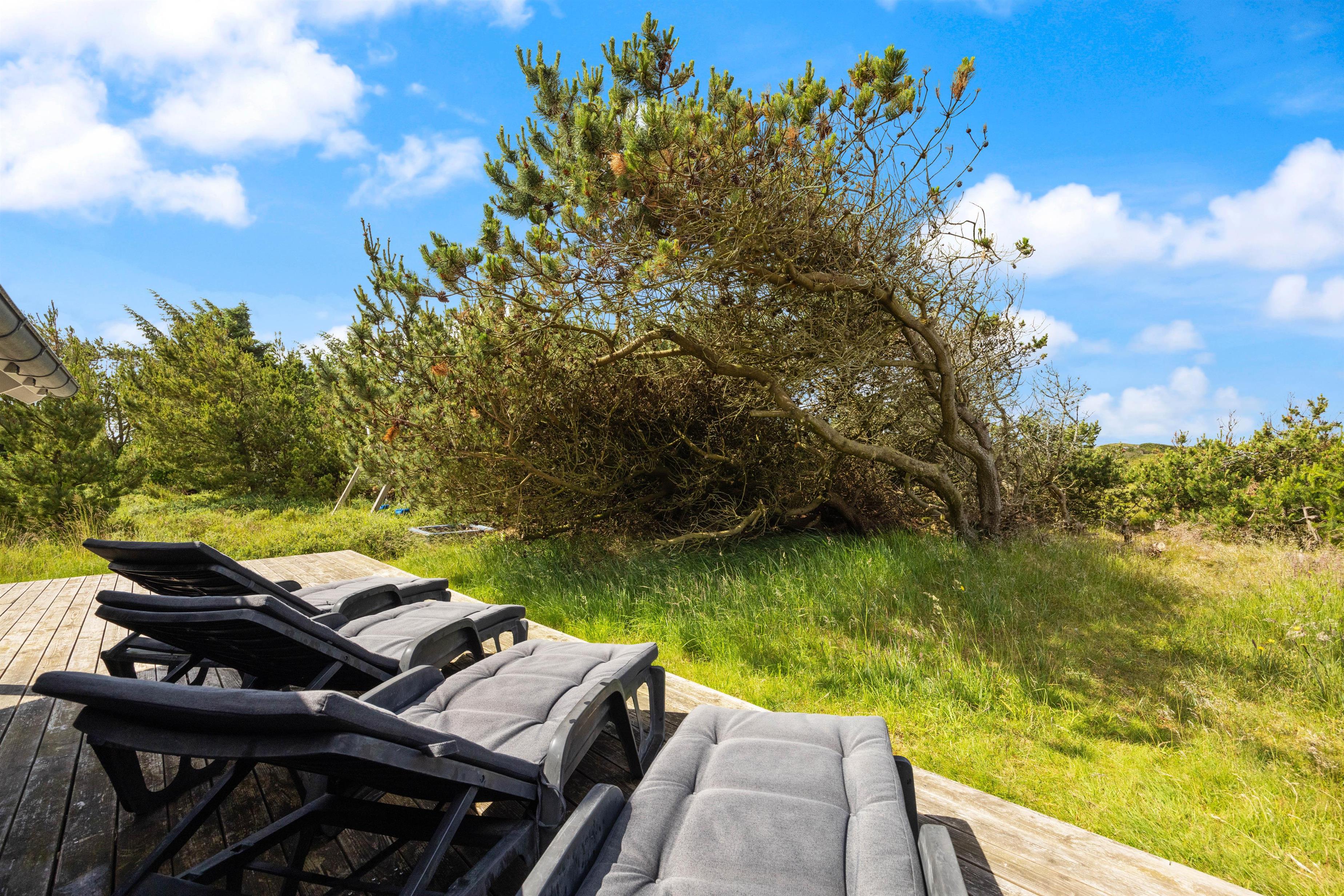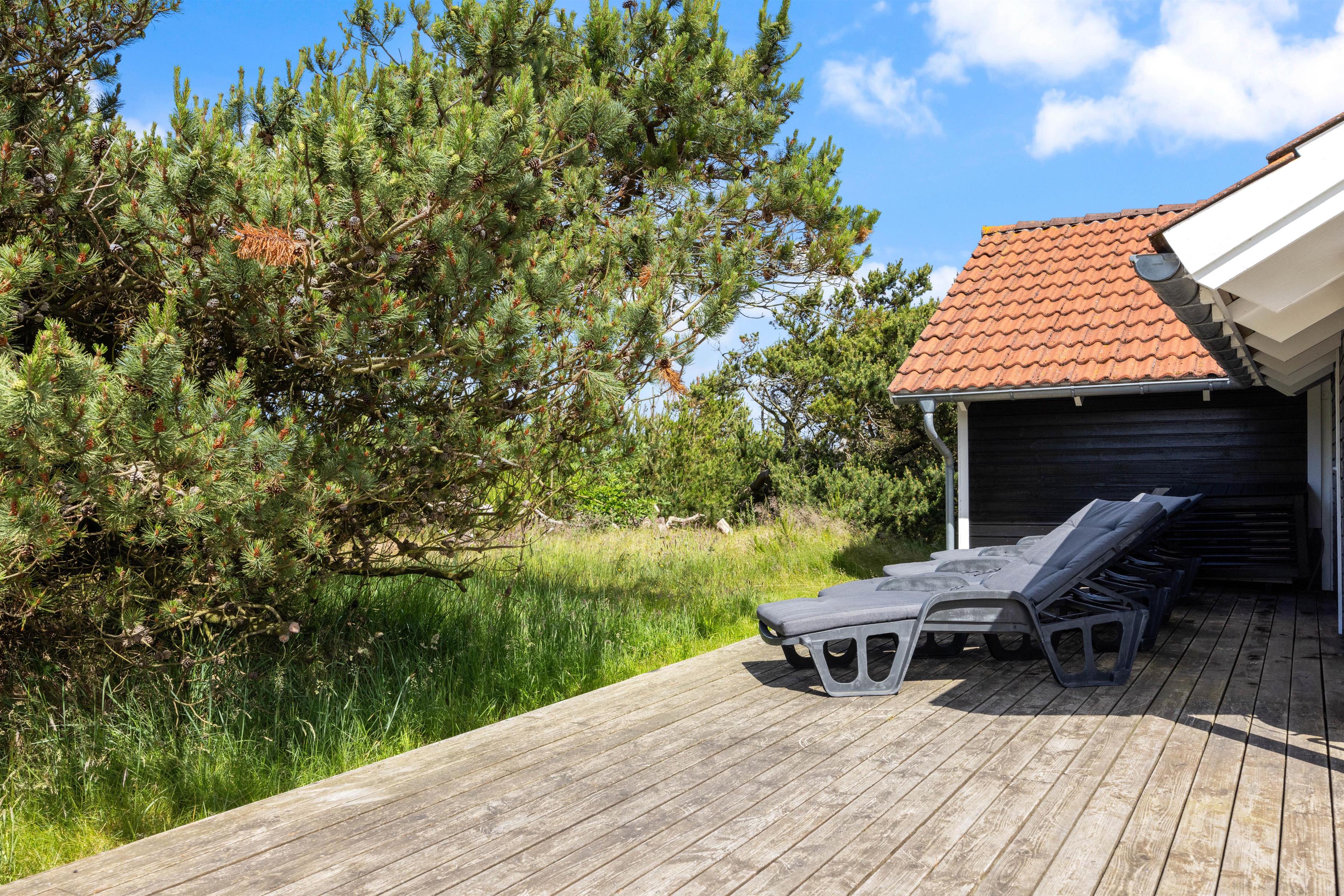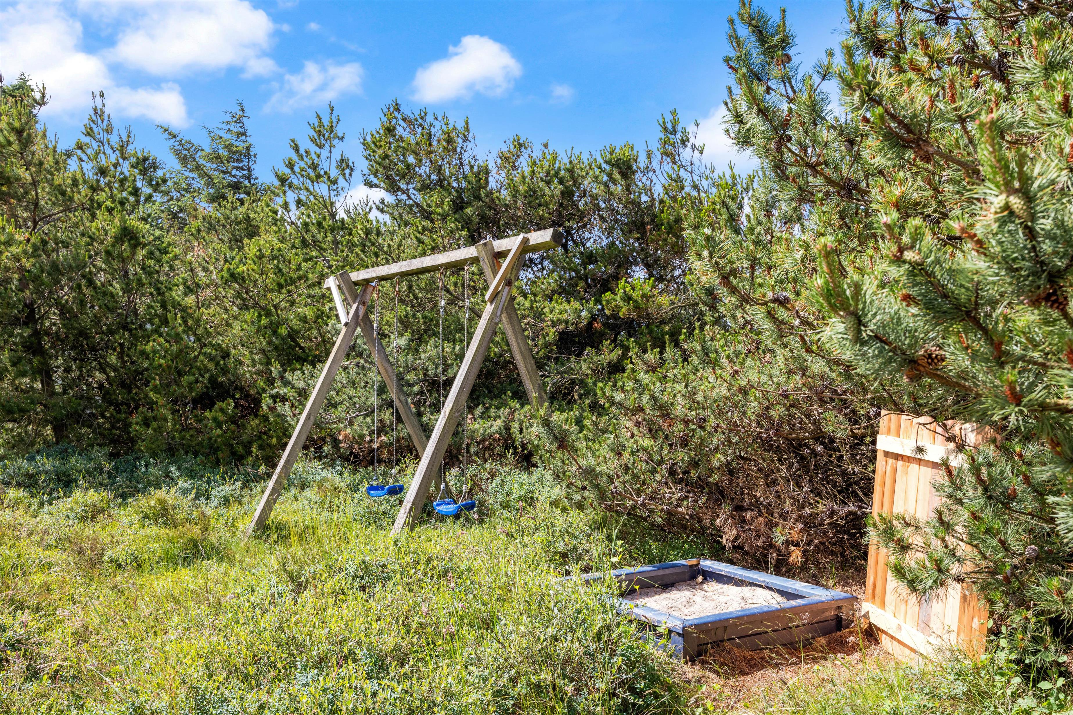 Fra sommerhusets opholdsrum har I udgang til sommerhusets store terrasse, der er delvist overdækket. Herfra kan I nyde sommersolens stråler med en kølig drink eller en god kop kaffe, mens børnene leger. Naturgrunden byder både på sandkasse og gyngestativ til familiens yngste, som I kan holde øje med fra liggestolene.