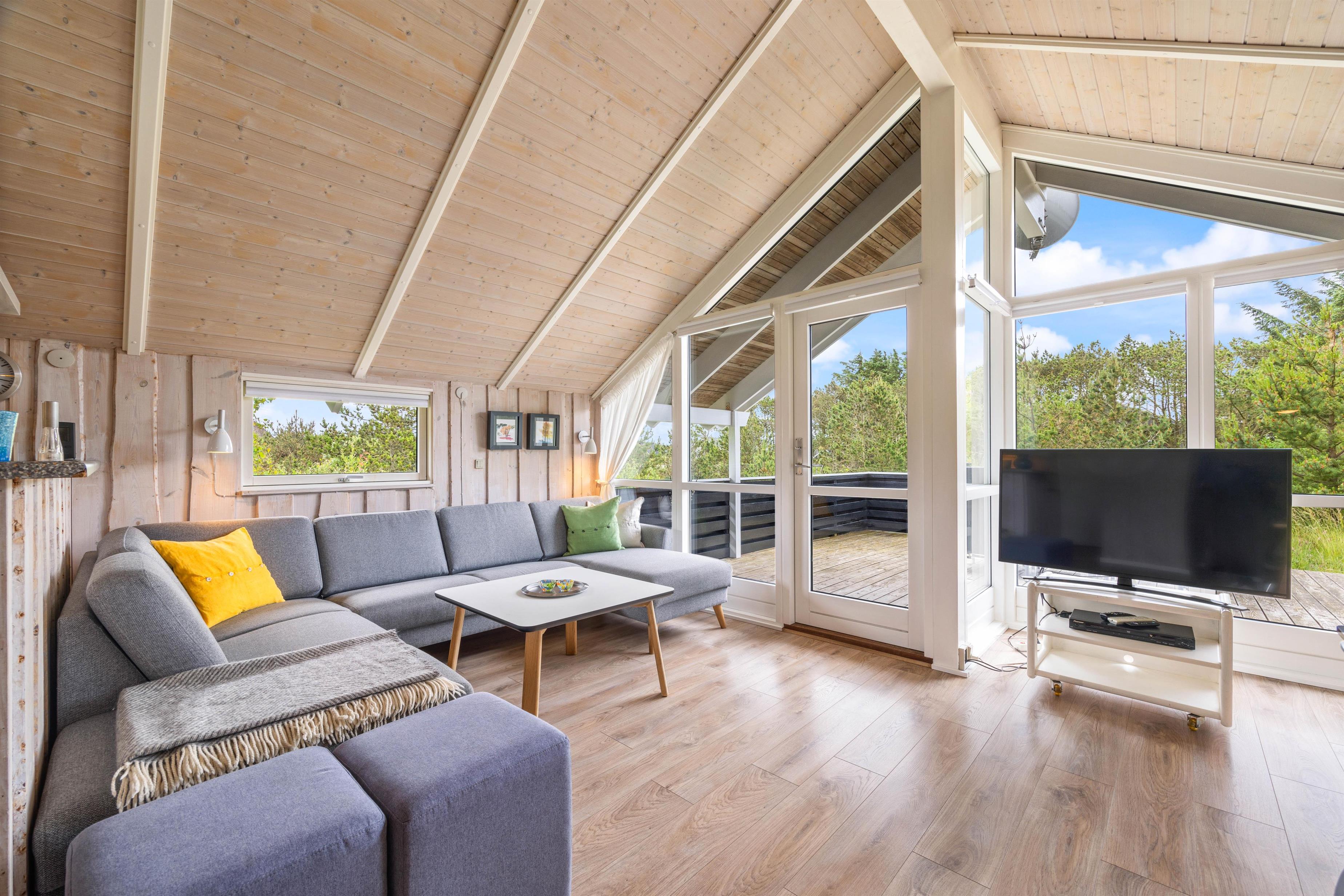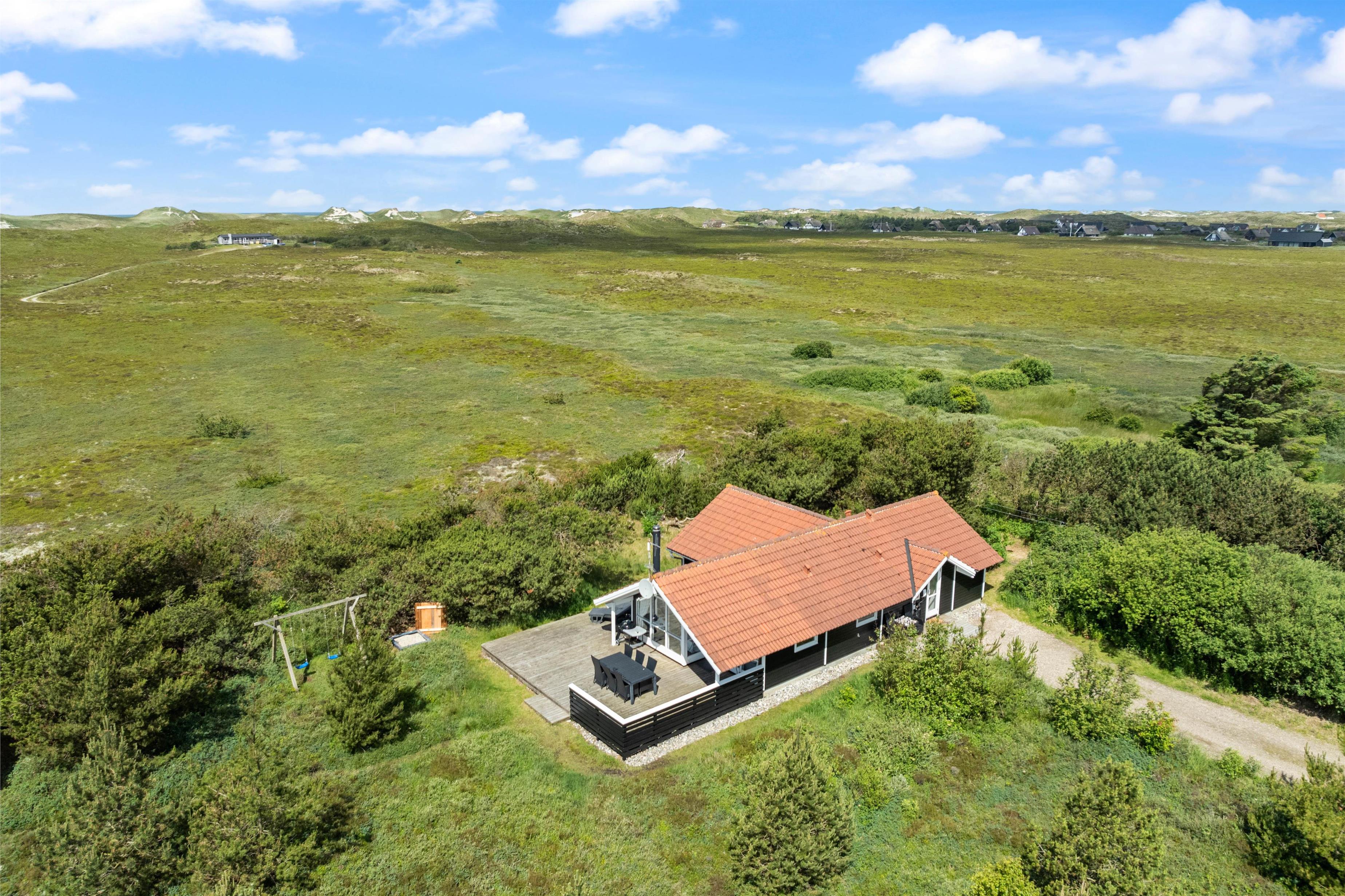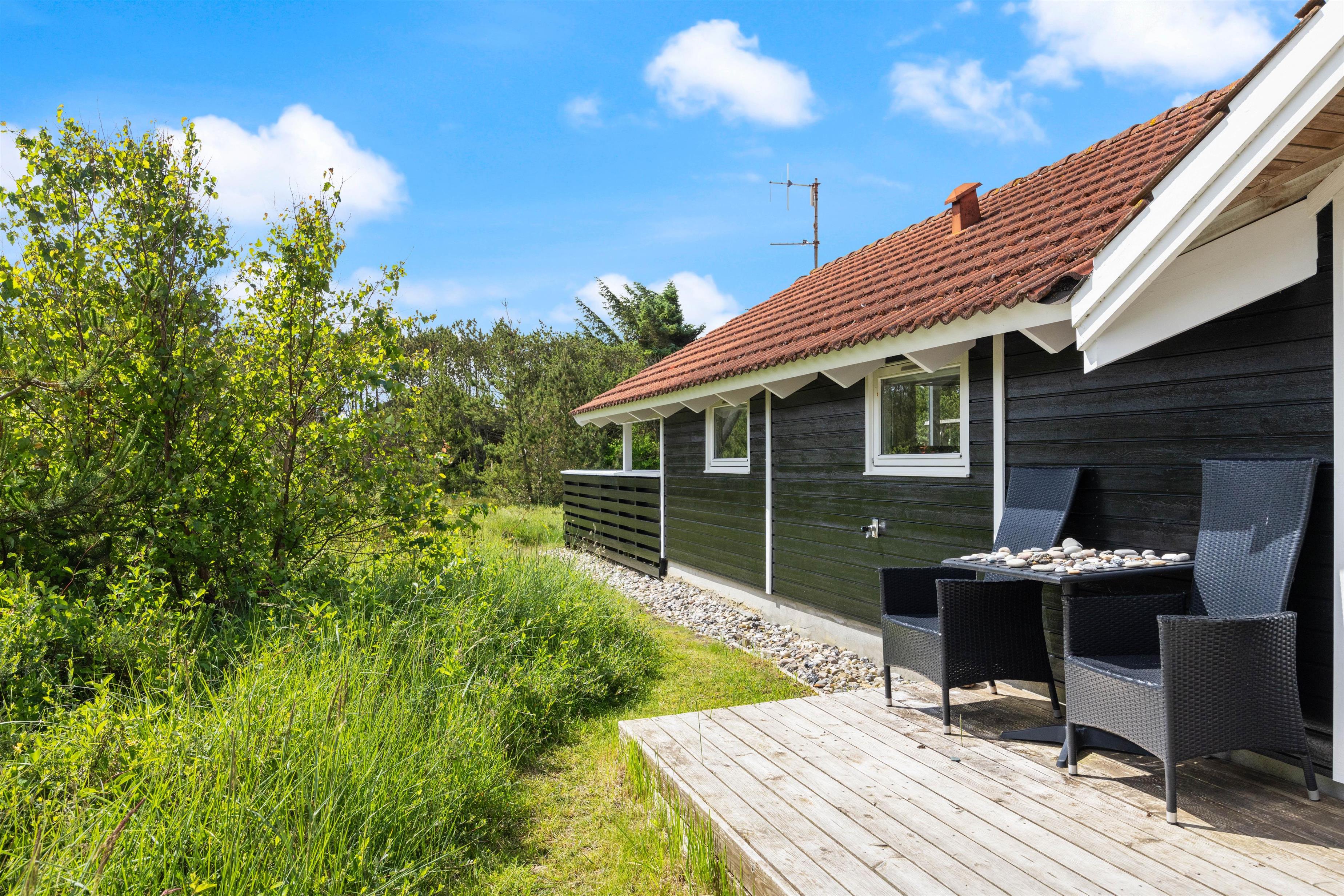 Fra sommerhusets opholdsrum har I udgang til sommerhusets store terrasse, der er delvist overdækket. Herfra kan I nyde sommersolens stråler med en kølig drink eller en god kop kaffe, mens børnene leger. Naturgrunden byder både på sandkasse og gyngestativ til familiens yngste, som I kan holde øje med fra liggestolene.