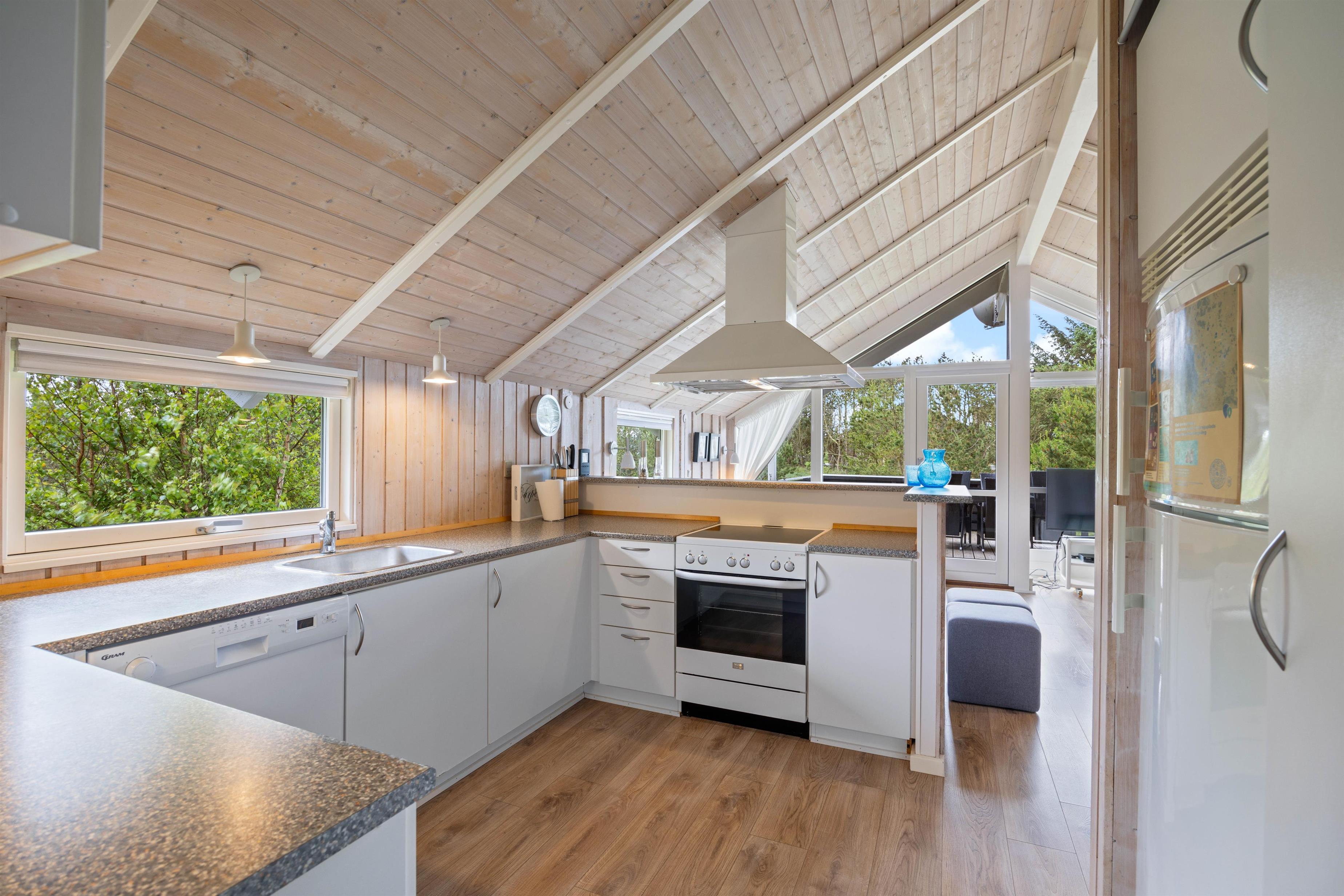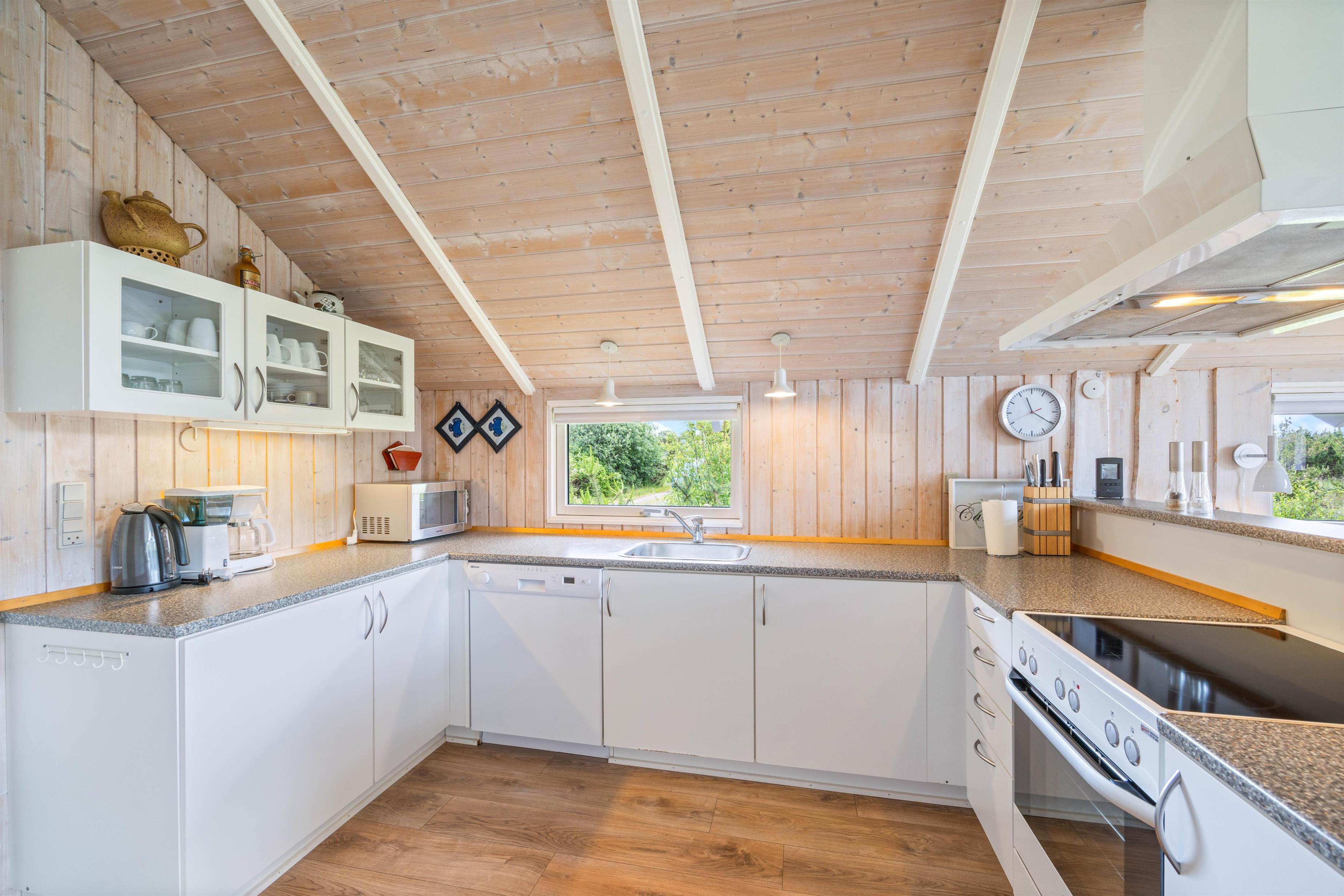 Sommerhuset er lyst og venligt indrettet, og alrummet vil blive jeres samlingsrum i løbet af ferien. Her kan hele familien samles til hyggelige stunder, hvad enten det er til madlavning i køkkenet, spil ved spisebordet eller afslapning i sofaen med en god film i fjernsynet. Det store, vestvendte vinduesparti skaber et godt lysindfald til rummet, og brændeovnen sætter prikken over i'et til ferietemningen.