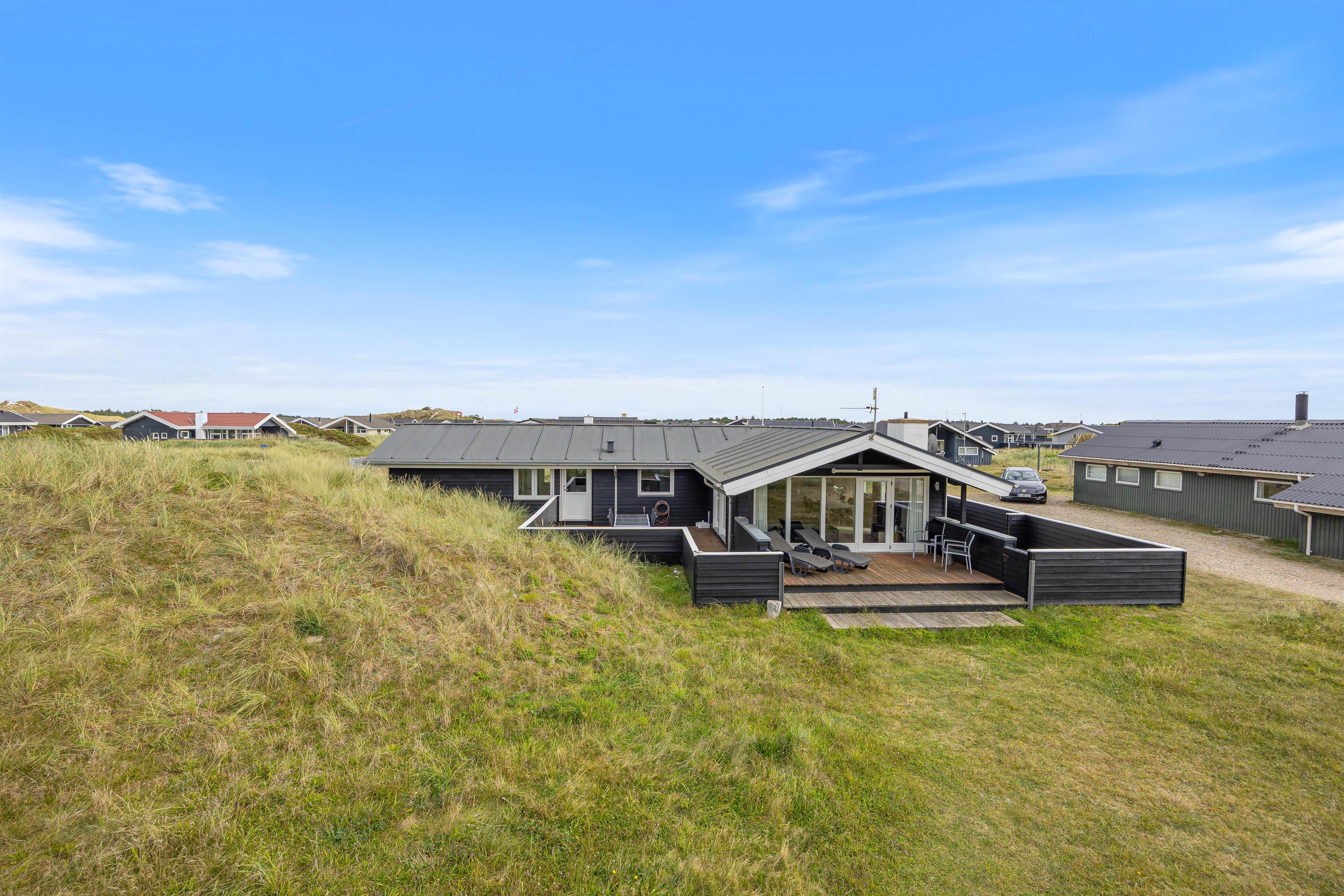 Et hyggeligt feriehus beliggende i Bjerregård, som ligger ca. 15 km syd for Hvide Sande. Her er kun 150 meter til den skønne sandstrand, og området er præget af masser af smuk natur og frisk luft. Sommerhuset er omgivet af terrasser, både afskærmet og delvist overdækket. Efter en god dag på stranden kan I hygge jer ved brændeovnen eller tage en tur i sommerhusets sauna. Derudover er det også tilladt at medbringe op til 2 hunde.