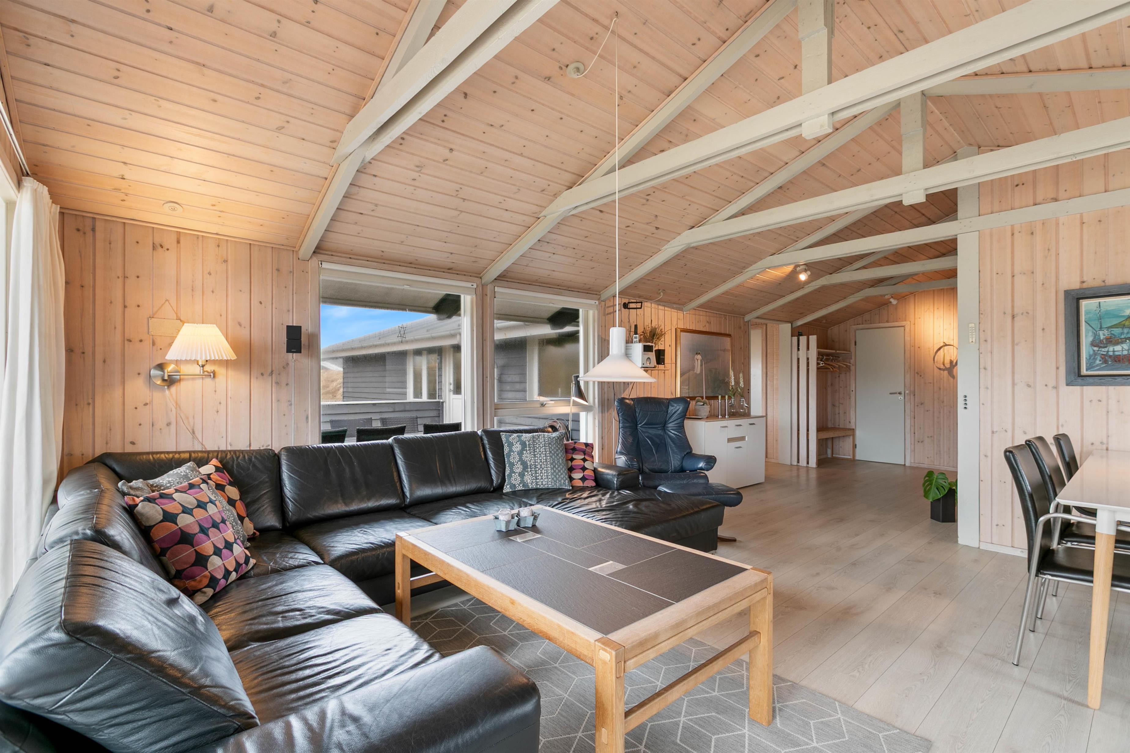 Dette traditionelle feriehus er veludstyret og rigtig hyggeligt indrettet. I det store opholdsrum er der plads til hygge med hele familien, imens I nyder varmen fra brændeovnen. Ved behov kan I derudover tænde for den energibesparende varmepumpe. I stuen er der mulighed for at streame jeres yndlingsfilm fra egen mobil, tablet eller computer via sommerhusets chromecast.