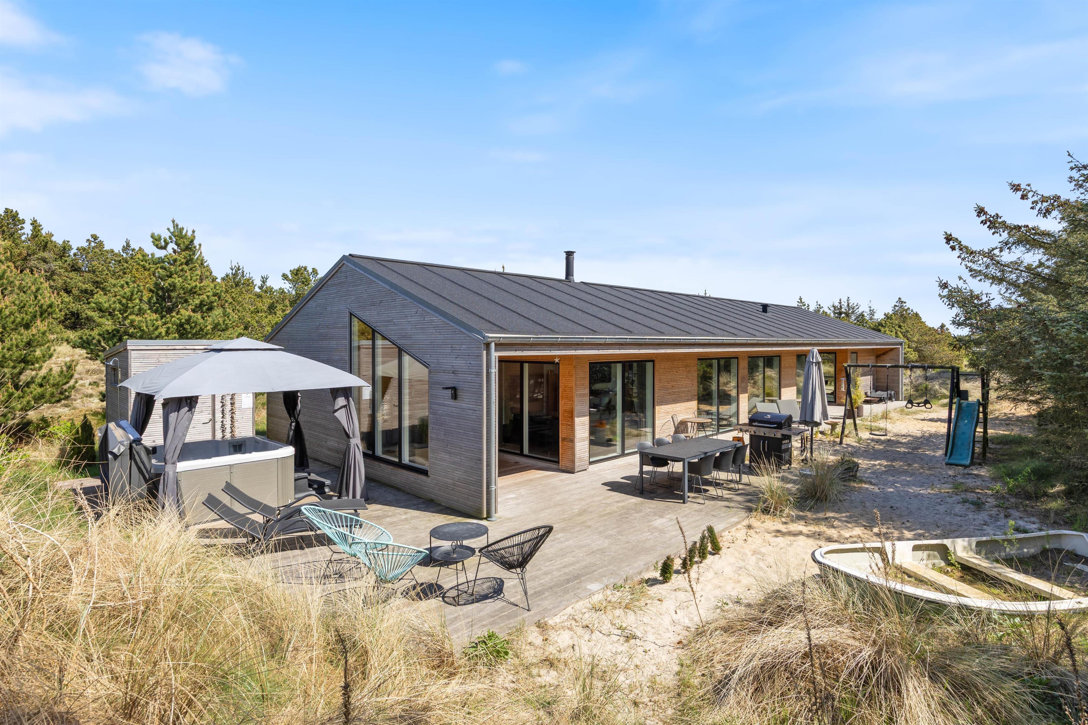 Feriehuset er beliggende på en dejlig stor naturgrund med gynger og sandkasse til familiens mindste. Nyd en dejlig sommerdag på de skønne, delvist overdækkede og afskærmede terrasser, som omkranser sommerhuset. Læg jer i en af liggestolene med en god krimi og nyd lyden af havets brusen, mens aftensmaden tilberedes på gasgrillen.