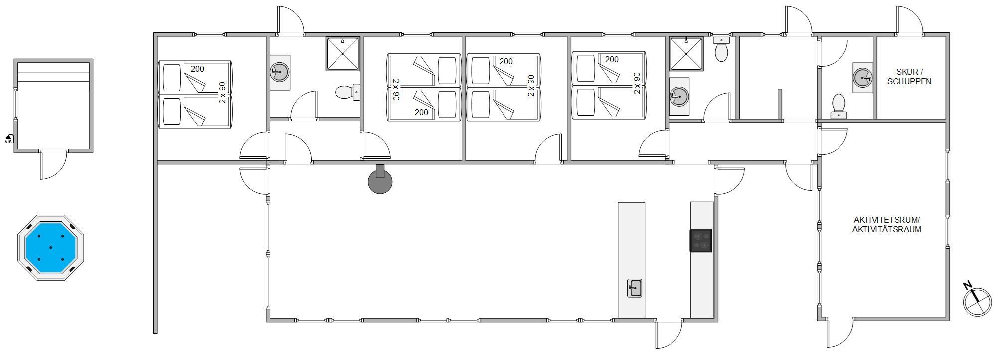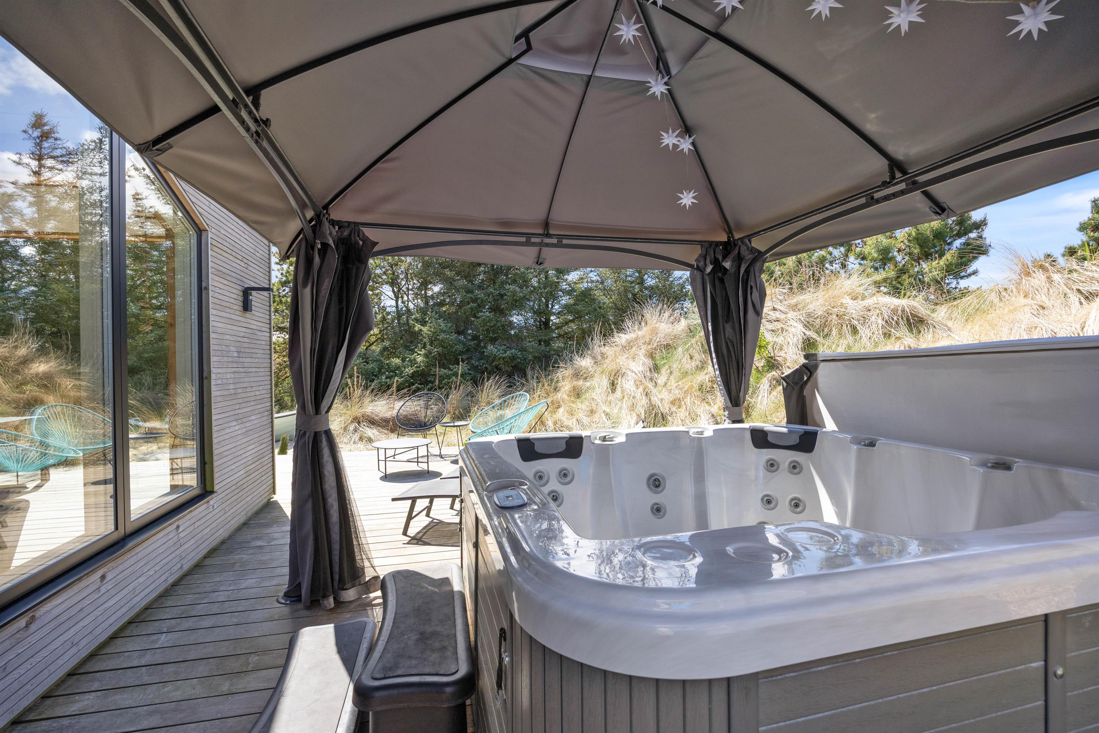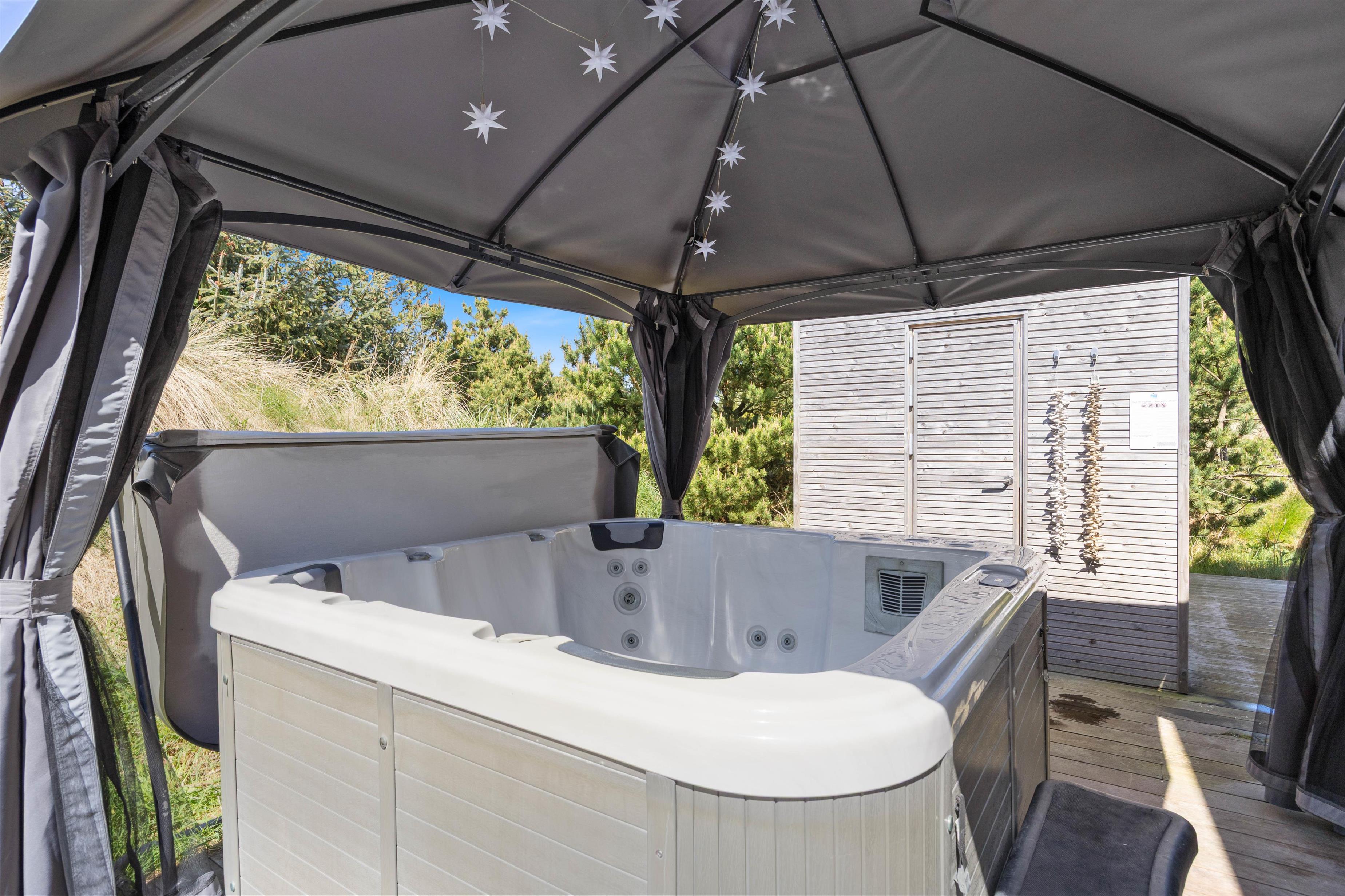 Efter maden kan I alle nyde et afslappende bad i udespaen eller smutte en tur i den varme udesauna efterfulgt af et afkølende bad under udebruseren? Ren magi for krop og sjæl. Udebruseren kan benyttes fra april til november.