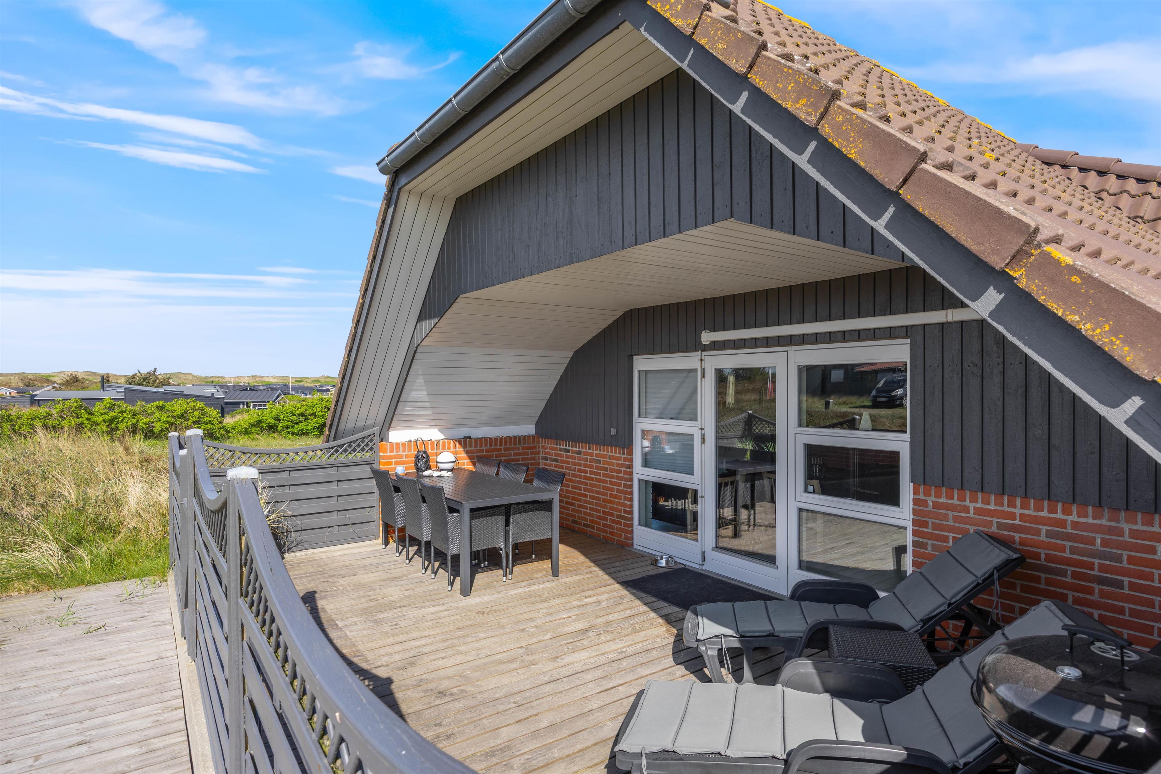 Der er forskellige terrasser rundt om sommerhuset, så I altid kan finde en rolig plet at slappe af på. Den lukkede terrasse er særlig praktisk, hvis I har små børn eller hund med. Bilen kan stå beskyttet i carporten i løbet af ferien.