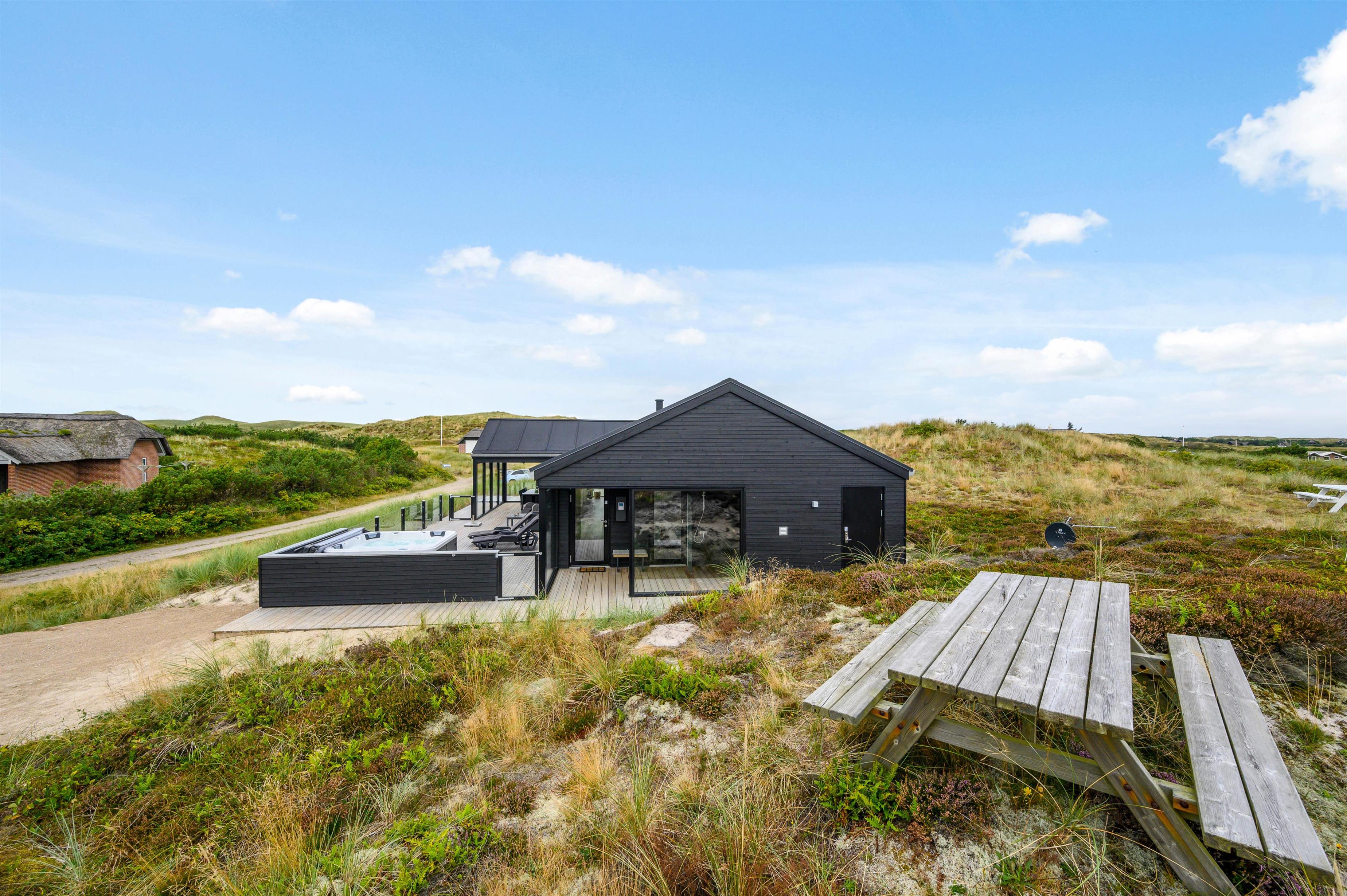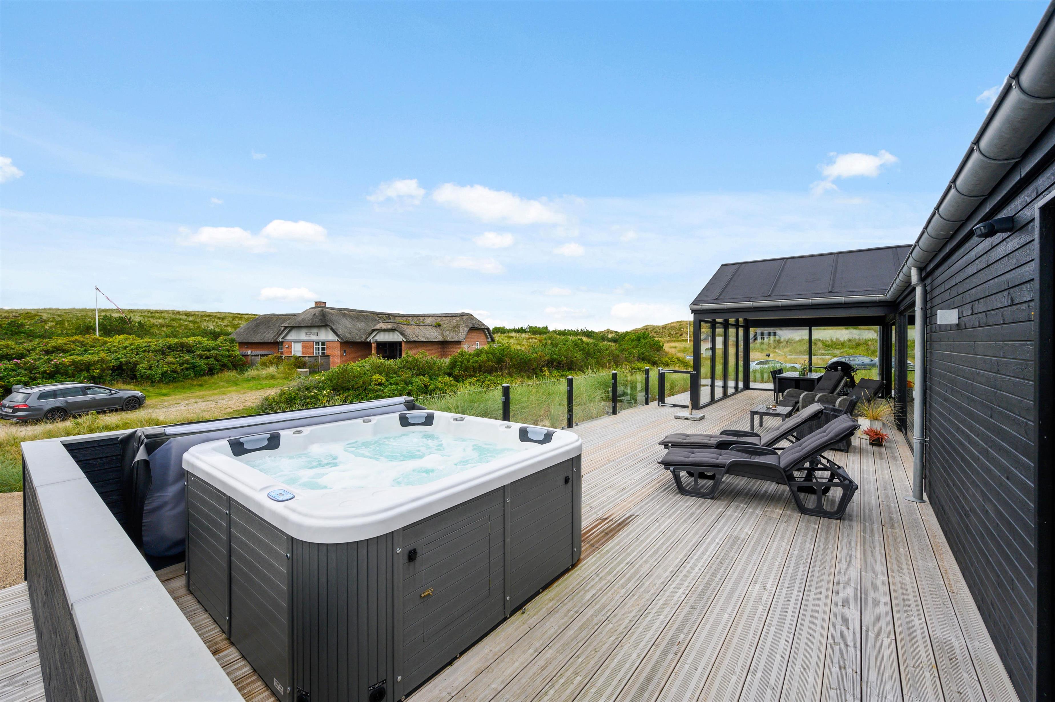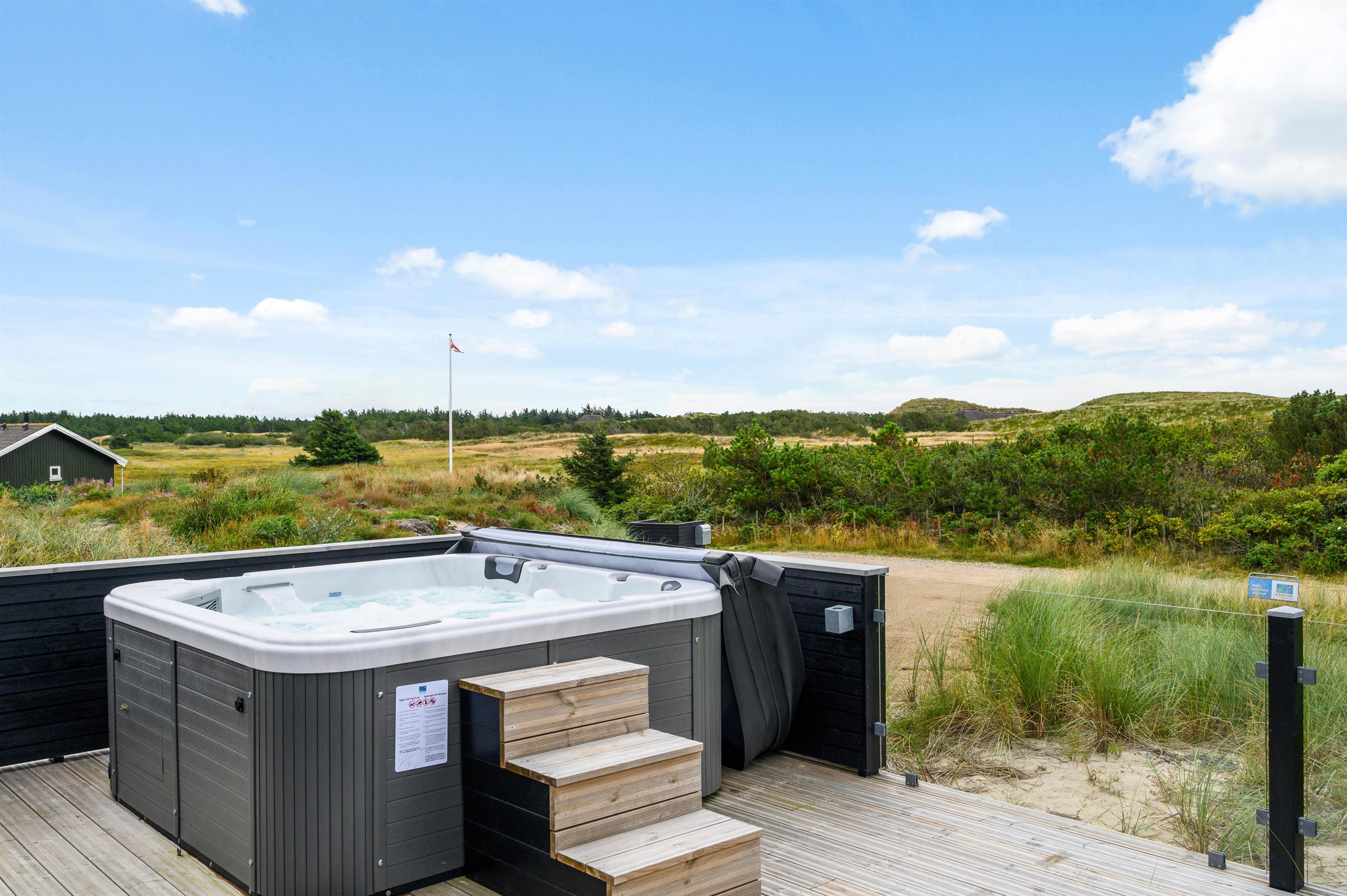 På terrassen finder I også feriehusets sauna – og ikke mindst det lækre udendørs spabad, som vil være til glæde for både børn og voksne. Hvem vil ikke gerne nyde de varme bobler på en sen sommeraften under en klar stjernehimmel med et glas rosé og den eneste ene? Fra den store lukkede terrasse har I også den mest fantastiske panoramaudsigt over det smukke lyngbeklædte klitlandskab.