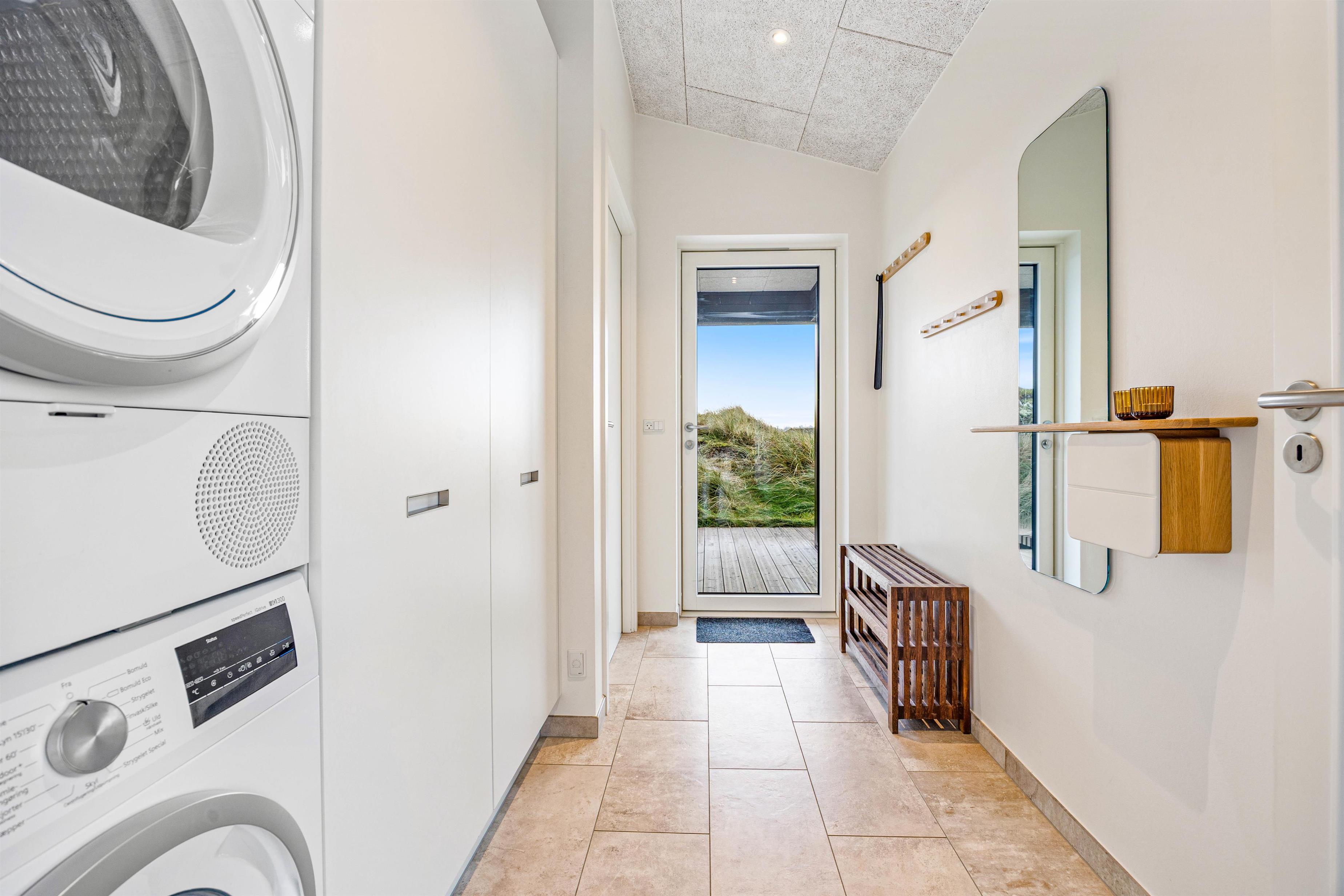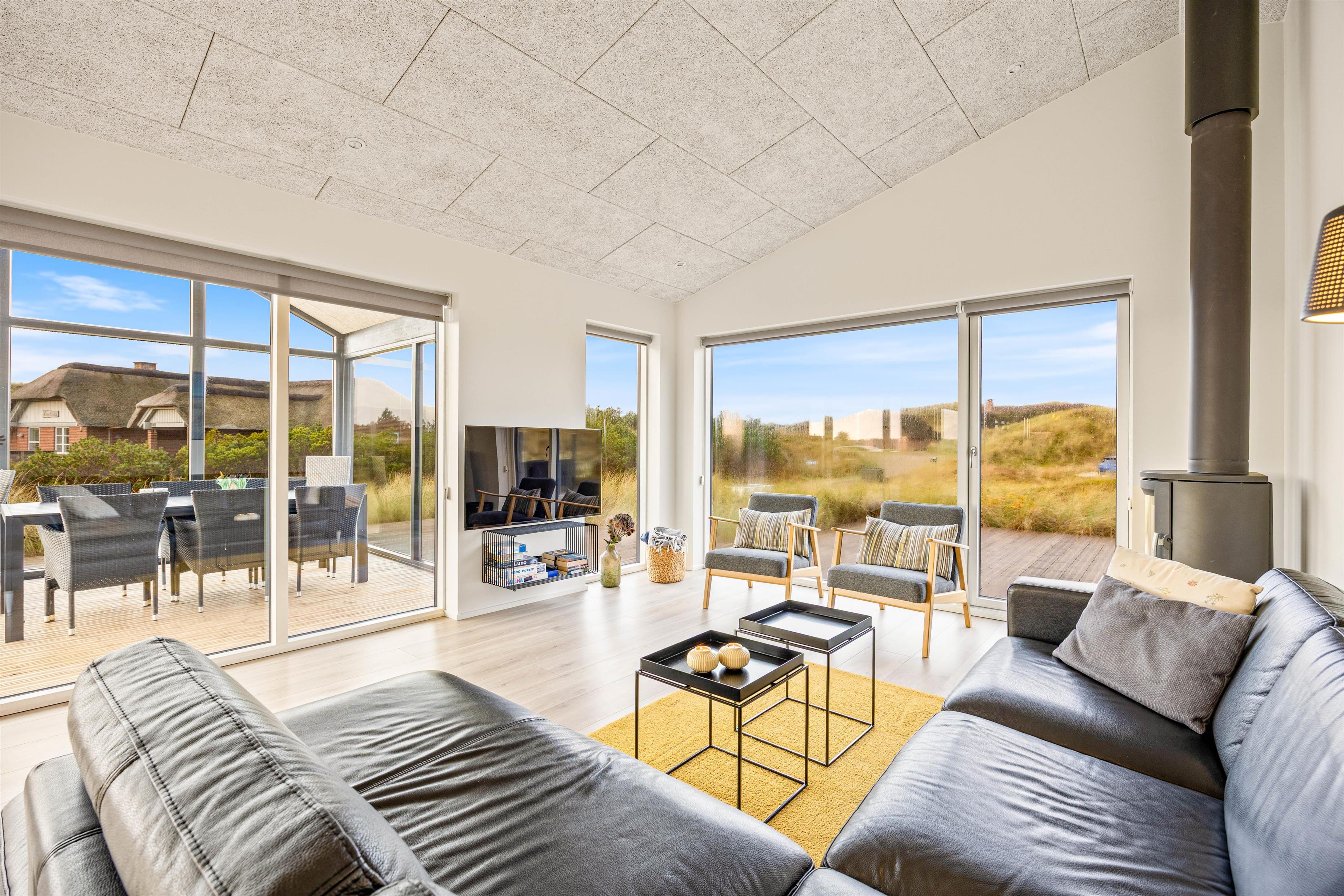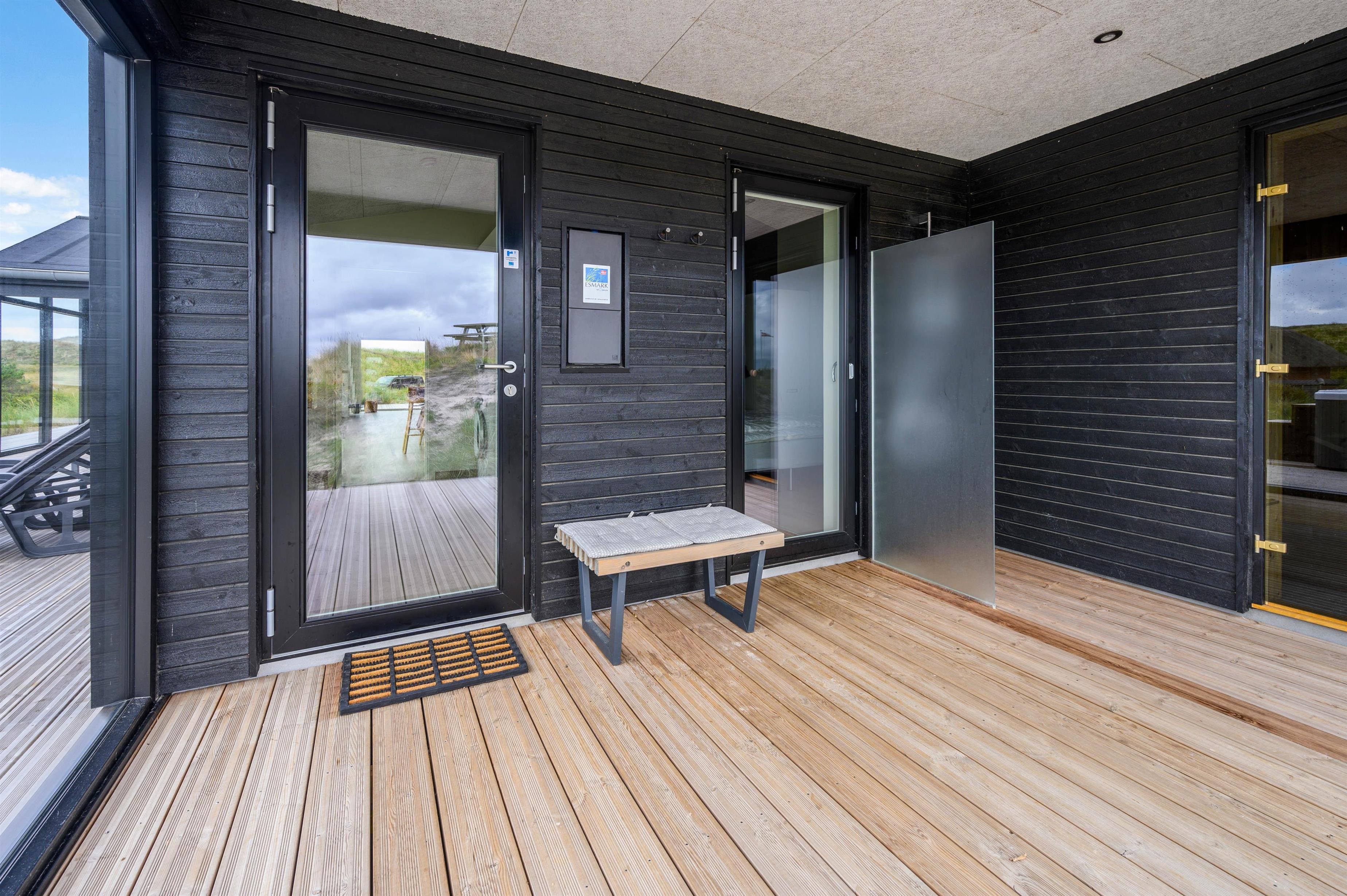 På terrassen finder I også feriehusets sauna – og ikke mindst det lækre udendørs spabad, som vil være til glæde for både børn og voksne. Hvem vil ikke gerne nyde de varme bobler på en sen sommeraften under en klar stjernehimmel med et glas rosé og den eneste ene? Fra den store lukkede terrasse har I også den mest fantastiske panoramaudsigt over det smukke lyngbeklædte klitlandskab.