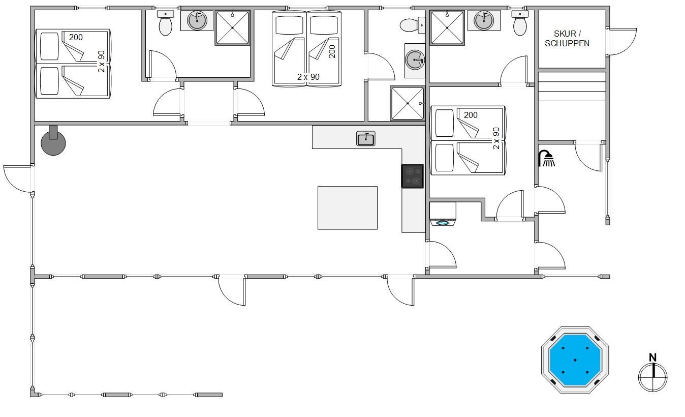 Fra april til november kan i tage en afkøling under udebruseren eller skylle sandet af fødderne efter en tur til stranden.