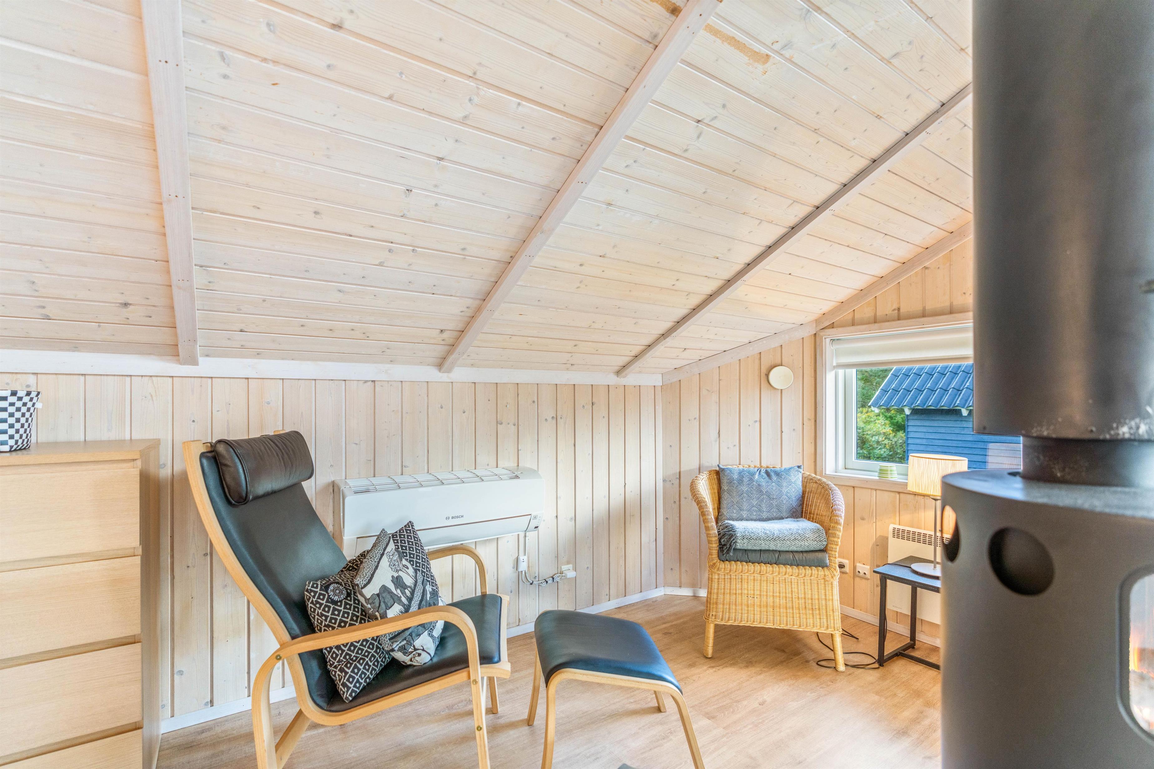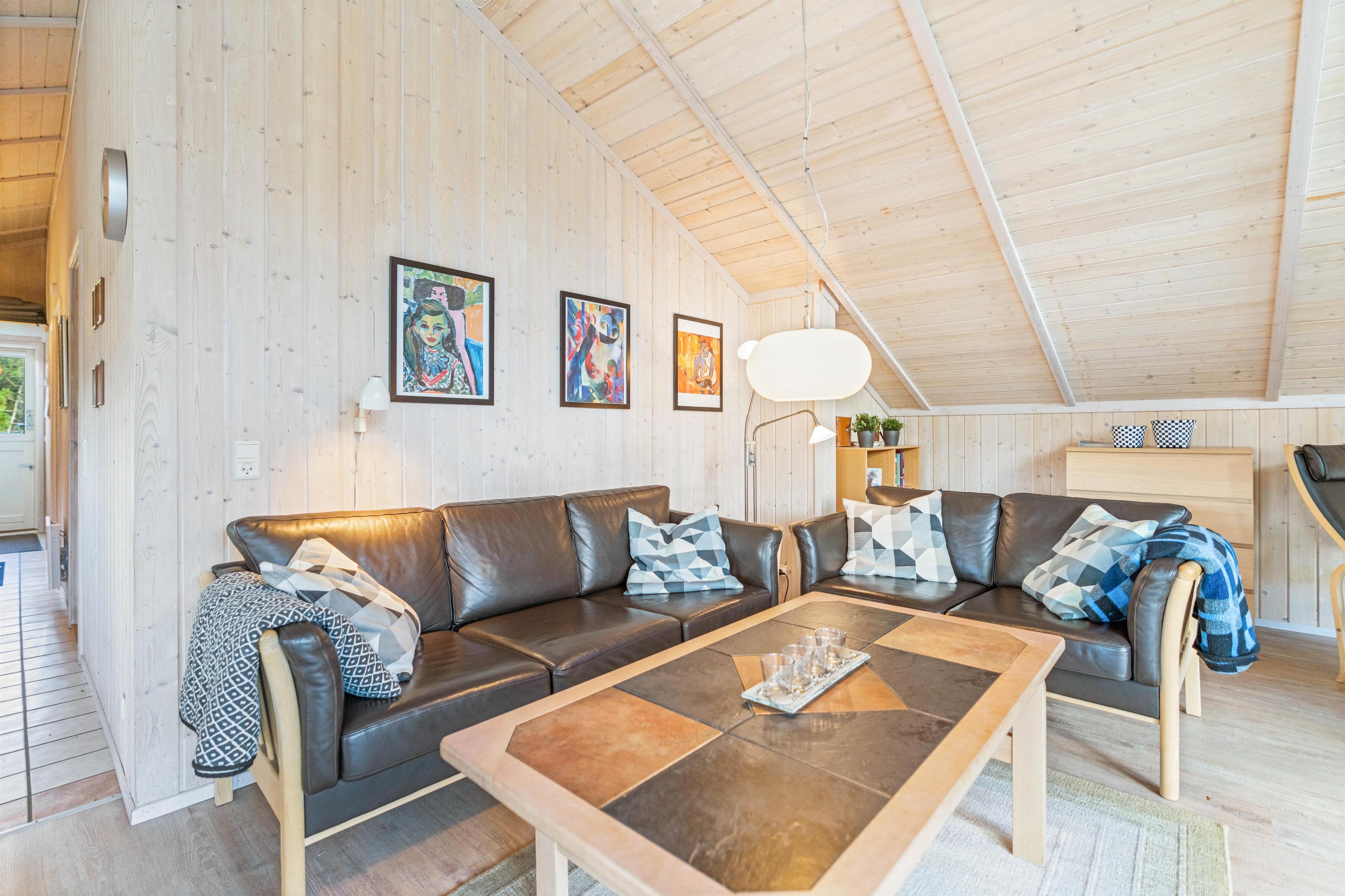 Sommerhuset har et veludstyret køkken i åben forbindelse med stue og spiseafdeling, og her er der køleskab med fryser på 30 L, mikroovn og opvaskemaskine. I den lyse stue er der loft til kip og de lækre lædersofaer indbyder til afslapning foran brændeovnen eller fladskærms-TV'et. Du får også DVD og gratis trådløst internet, samt energibesparende varmepumpe. I alle værelser og opholdsafdelingen er lagt trægulve.