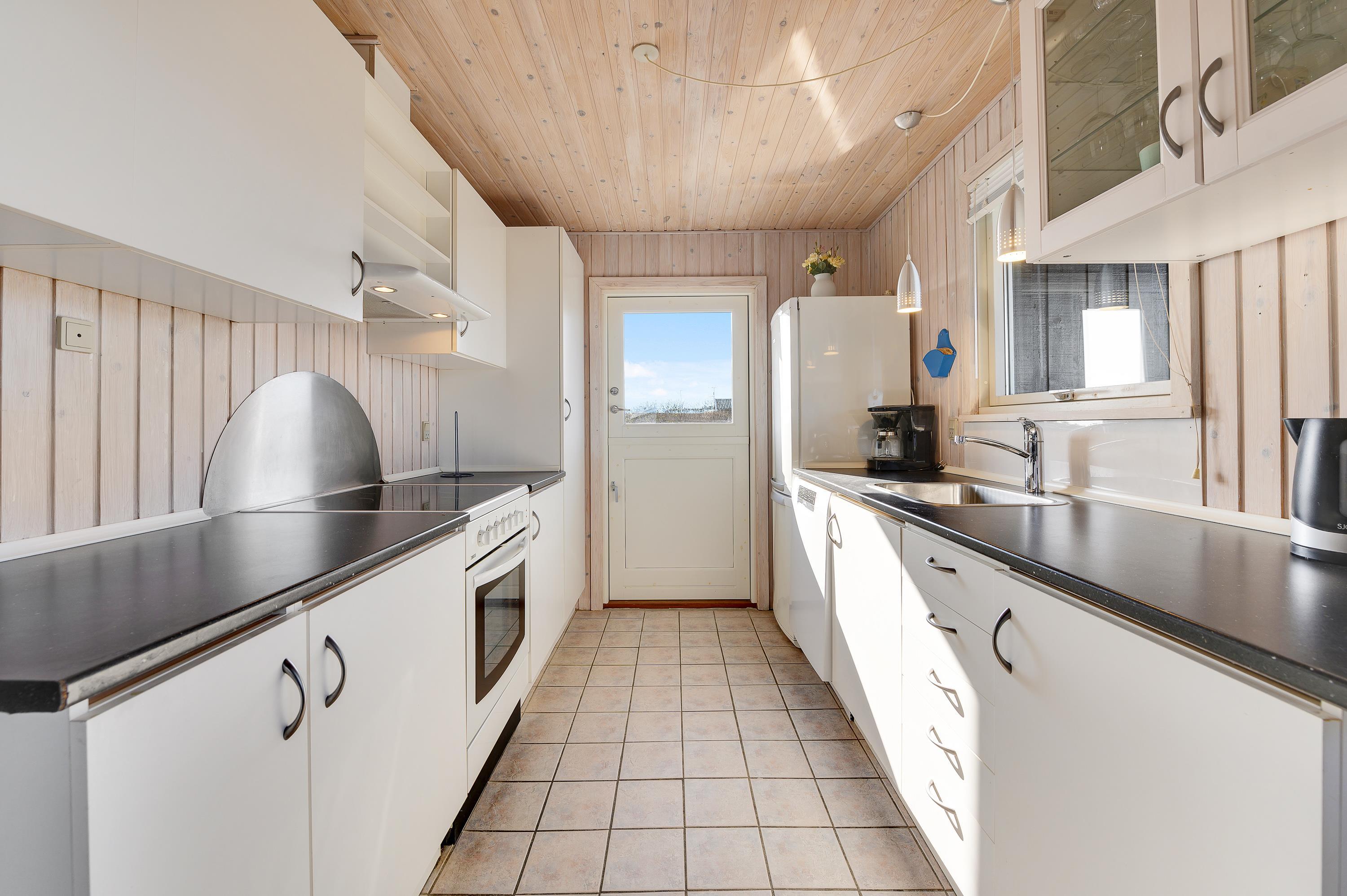 Stue, spisestue og køkken er i forbindelse med hinanden, hvilket giver en god og hyggelig stemning i sommerhuset. Fra køkkenet og stuen er der udgang til den dejlige lukkede terrasse, hvor børn og hunde kan færdes frit.