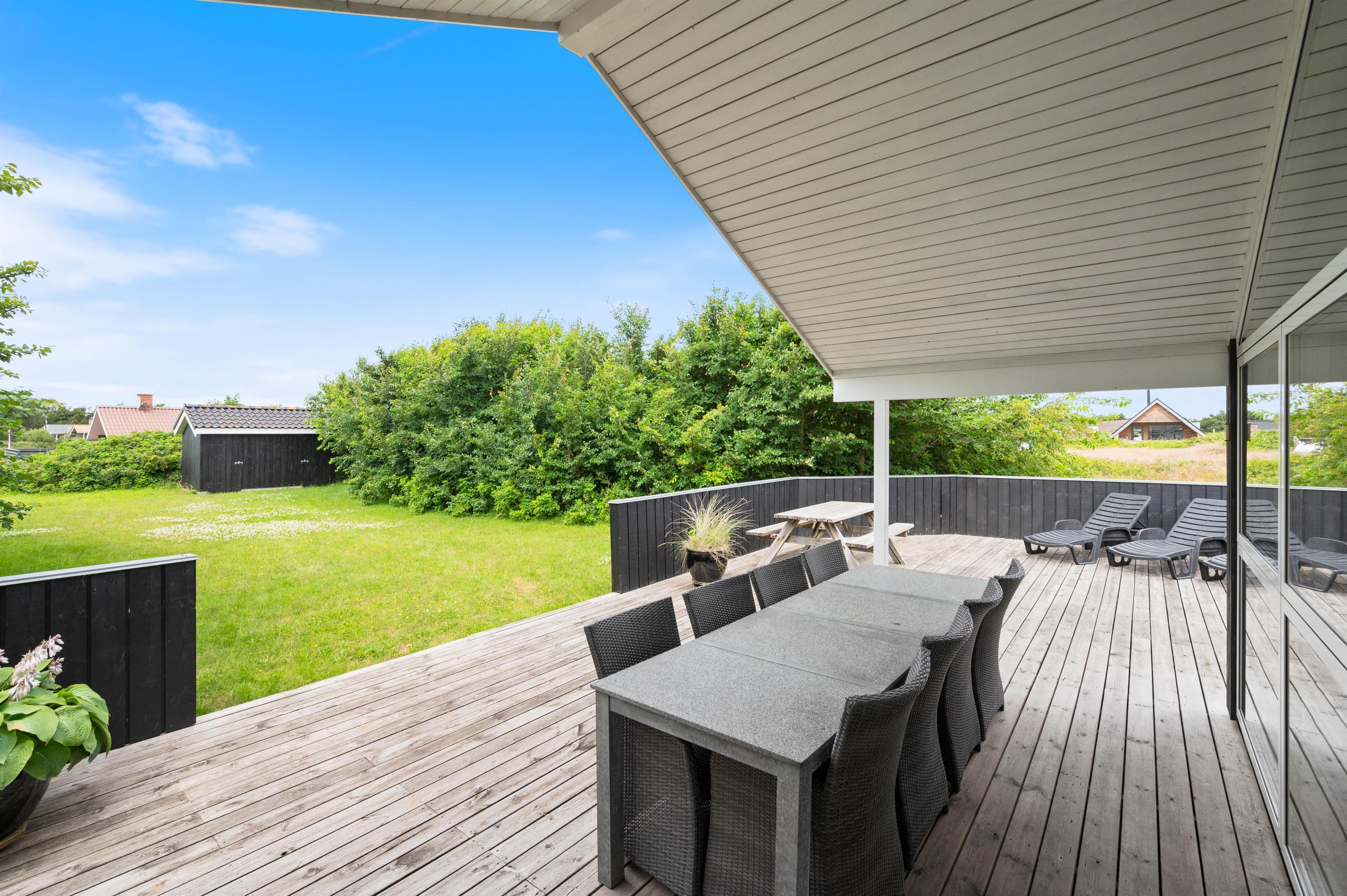 Fin og rolig beliggenhed på en god grund omgivet af lave buske i de naturskønne omgivelser på vestkysten i Danmark. Den store velmøblerede terrasse strækker sig mod øst, syd og vest, så solen og den friske havluft kan nydes dagen lang. Terrassen er delvis afskærmet og delvis overdækket. Her kan virkelig hygges og slappes af med kulinariske udfoldelser til feriens grillaftener.