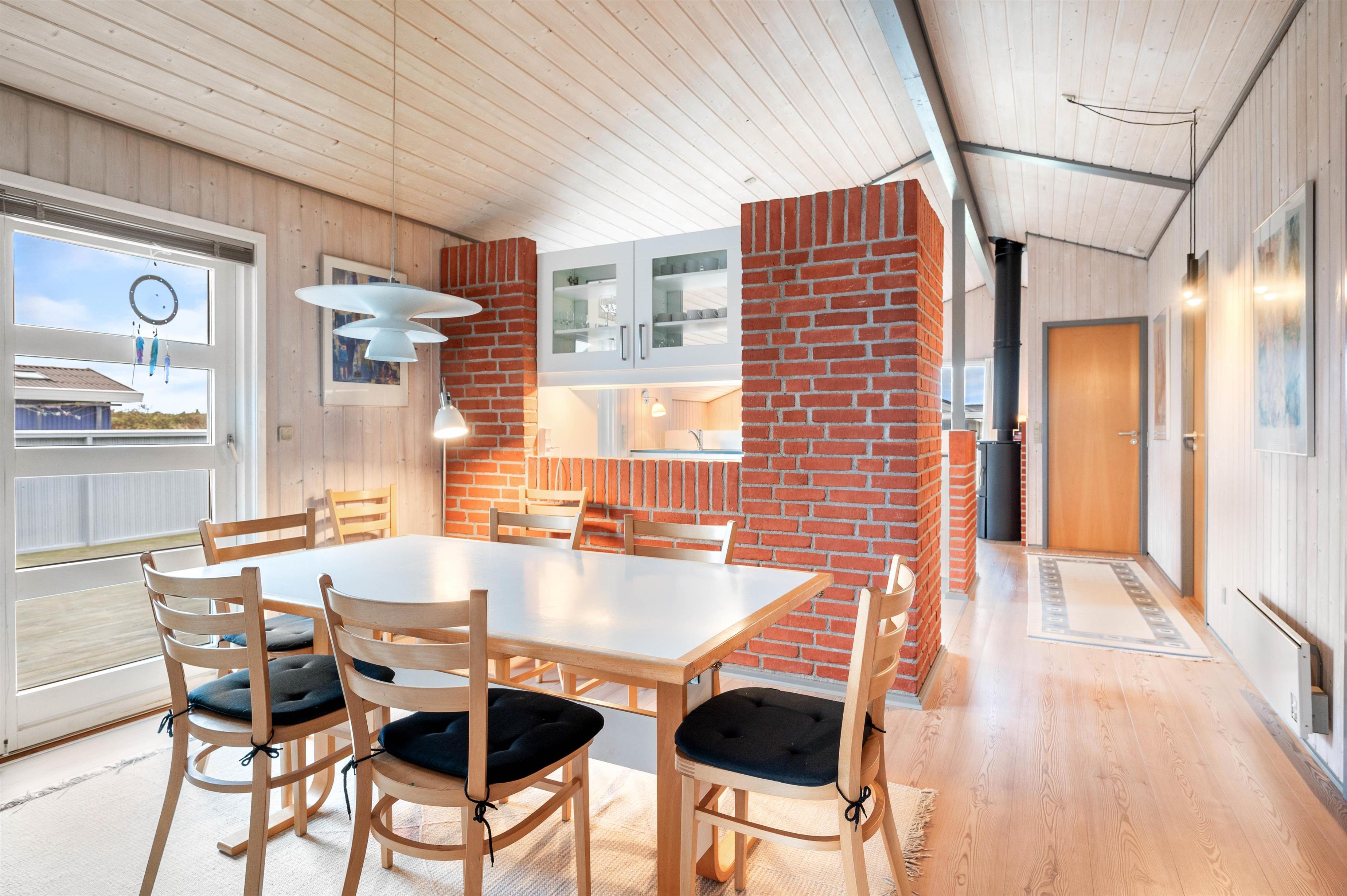 Samlingspunktet er stuen, køkkenet og spiseafdelingen, som er i åben forbindelse. Køkkenet er indrettet med opvaskemaskine og mikroovn samt kig til både stue og spisestuen, hvor I kan nyde maden omkring bordet. Ligesom i resten af sommerhuset er her lyse trægulve og loft til kip, hvilket skaber en rar atmosfære sammen med stuens brændeovn. Her kan I slappe af i sofaen eller samles omkring familiens yndlingsbrætspil, mens morgendagens aktiviteter planlægges.