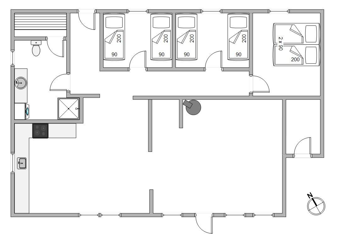 Sommerhuset har 3 gode soveværelser, heraf 1 med dobbelt- og 2 med enkeltsenge, som giver komfortable forhold for 6 personer.