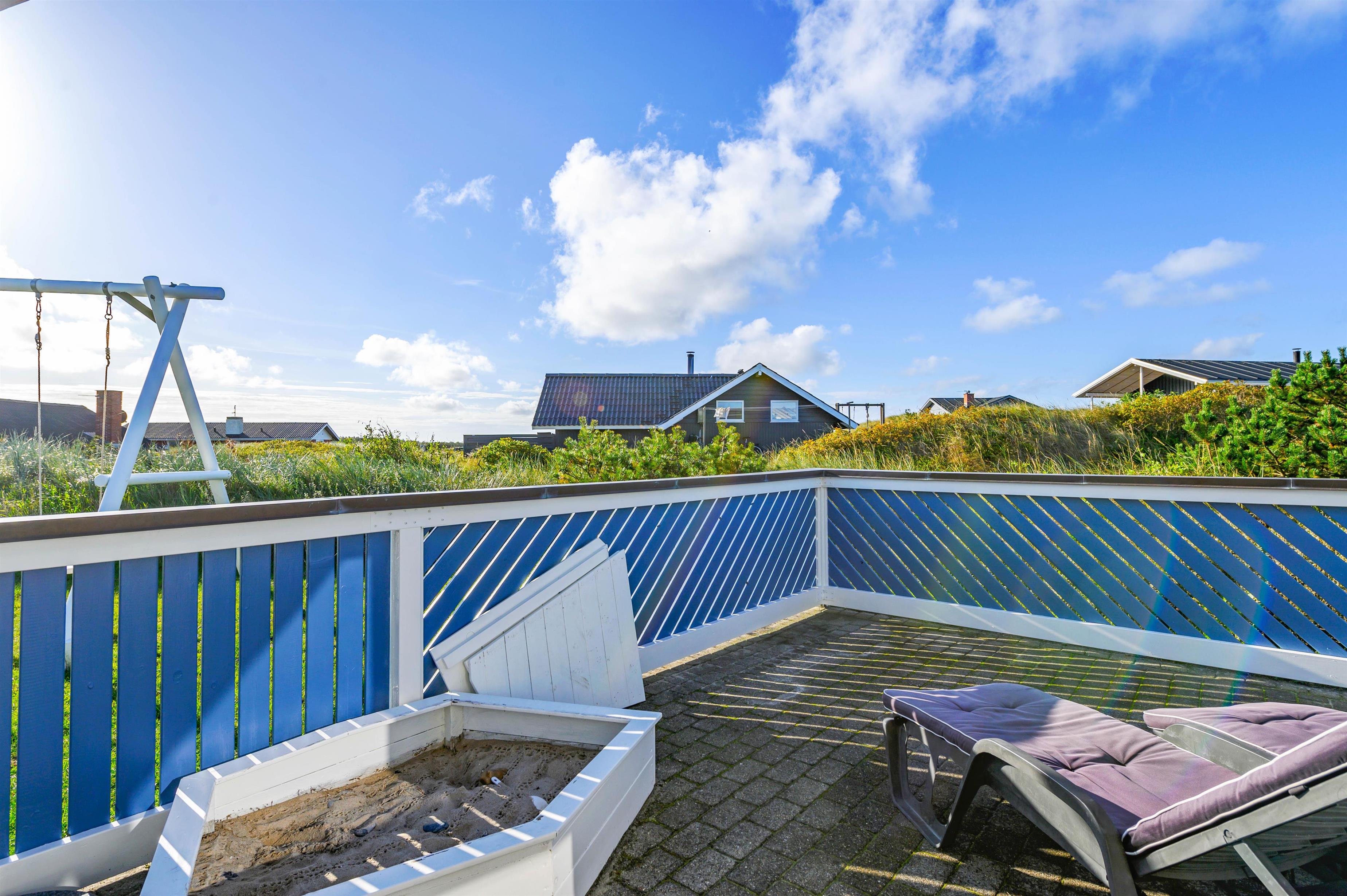 Den store velmøblerede og afskærmede terrasse indbyder til afslapning og nydelse af solen og den friske havluft inden aftenens måltid tilberedt på feriehusets grill. Terrassen er i øvrigt lukket, så hunde og børn kan gå frit rundt uden bekymringer.