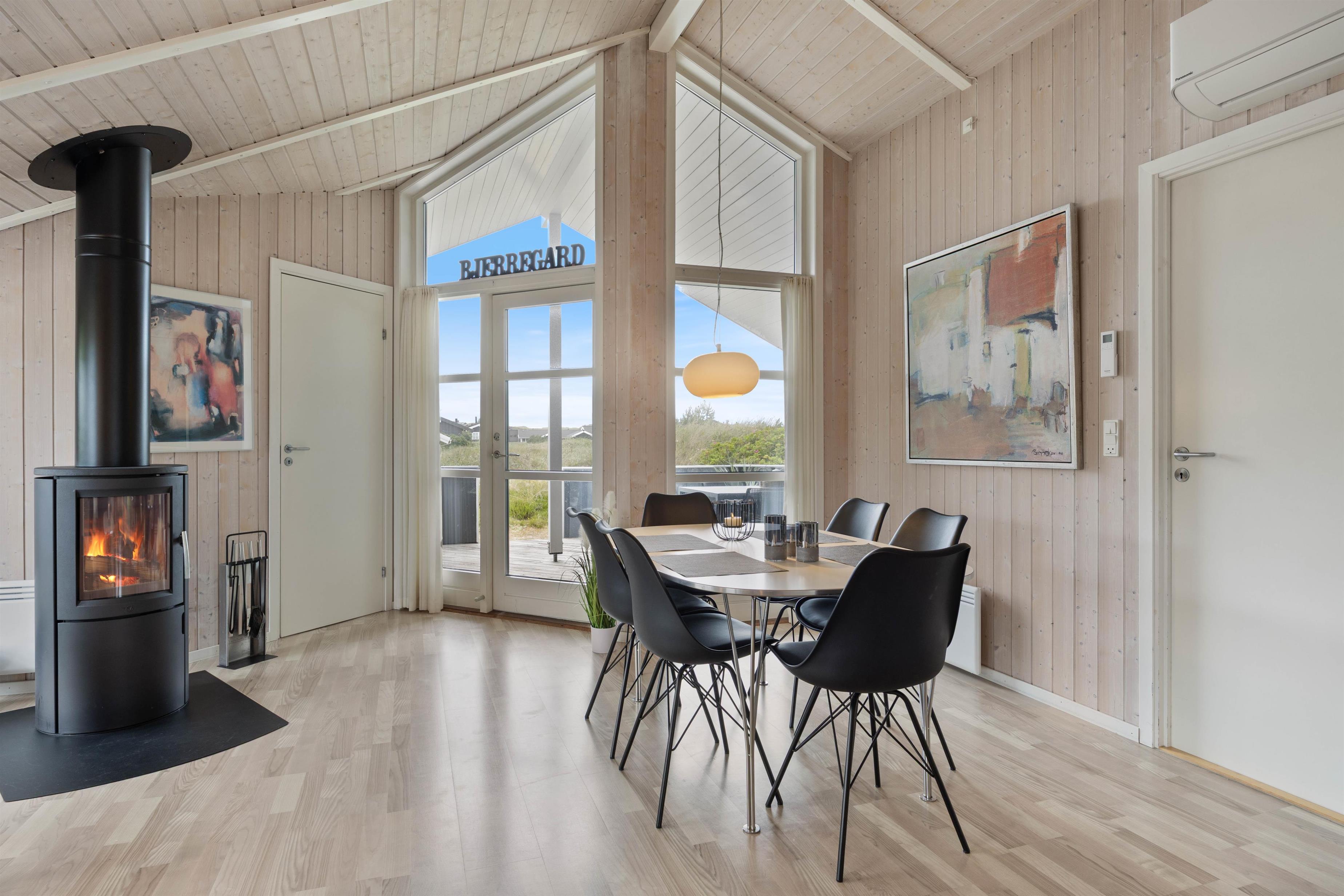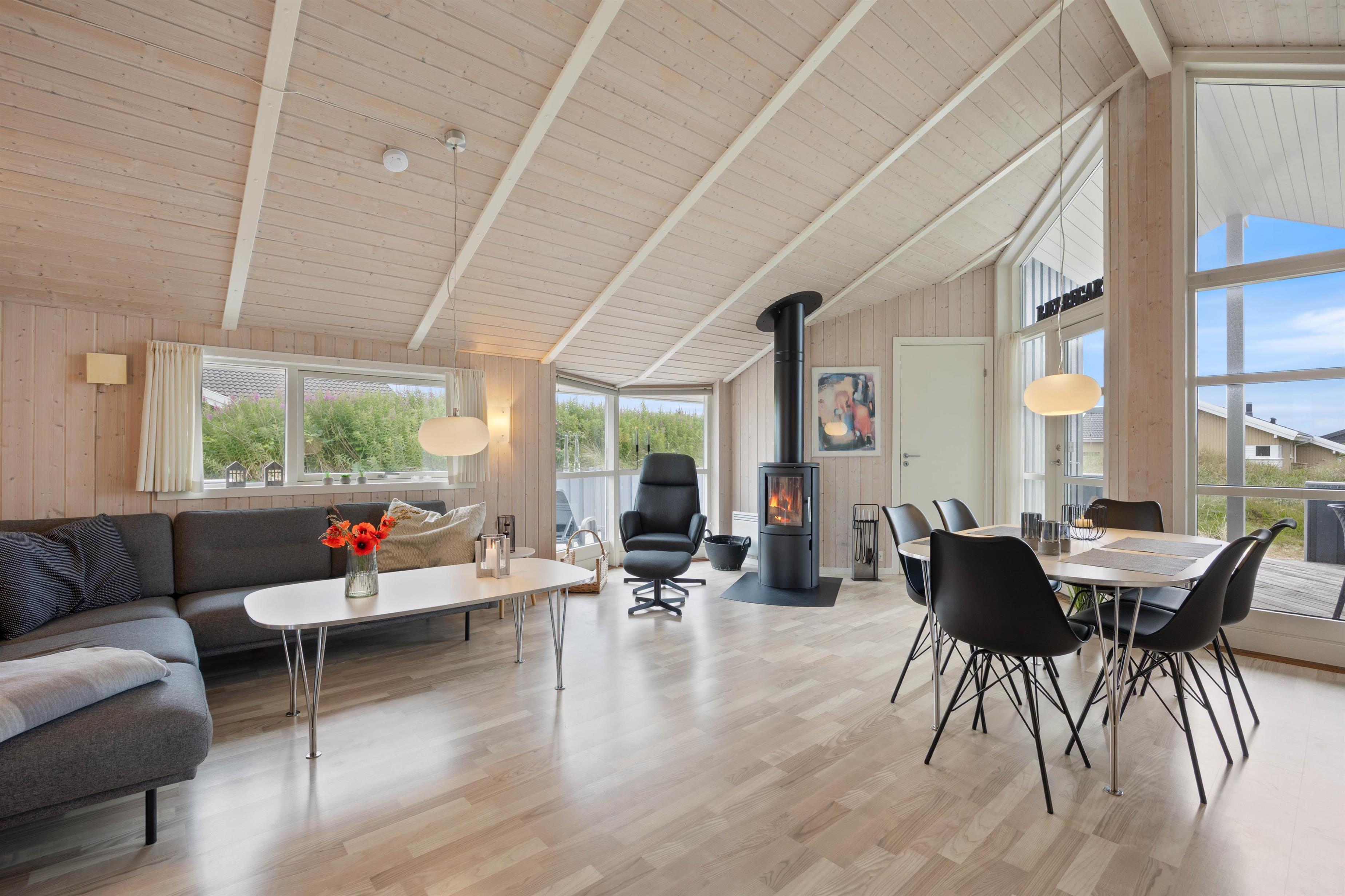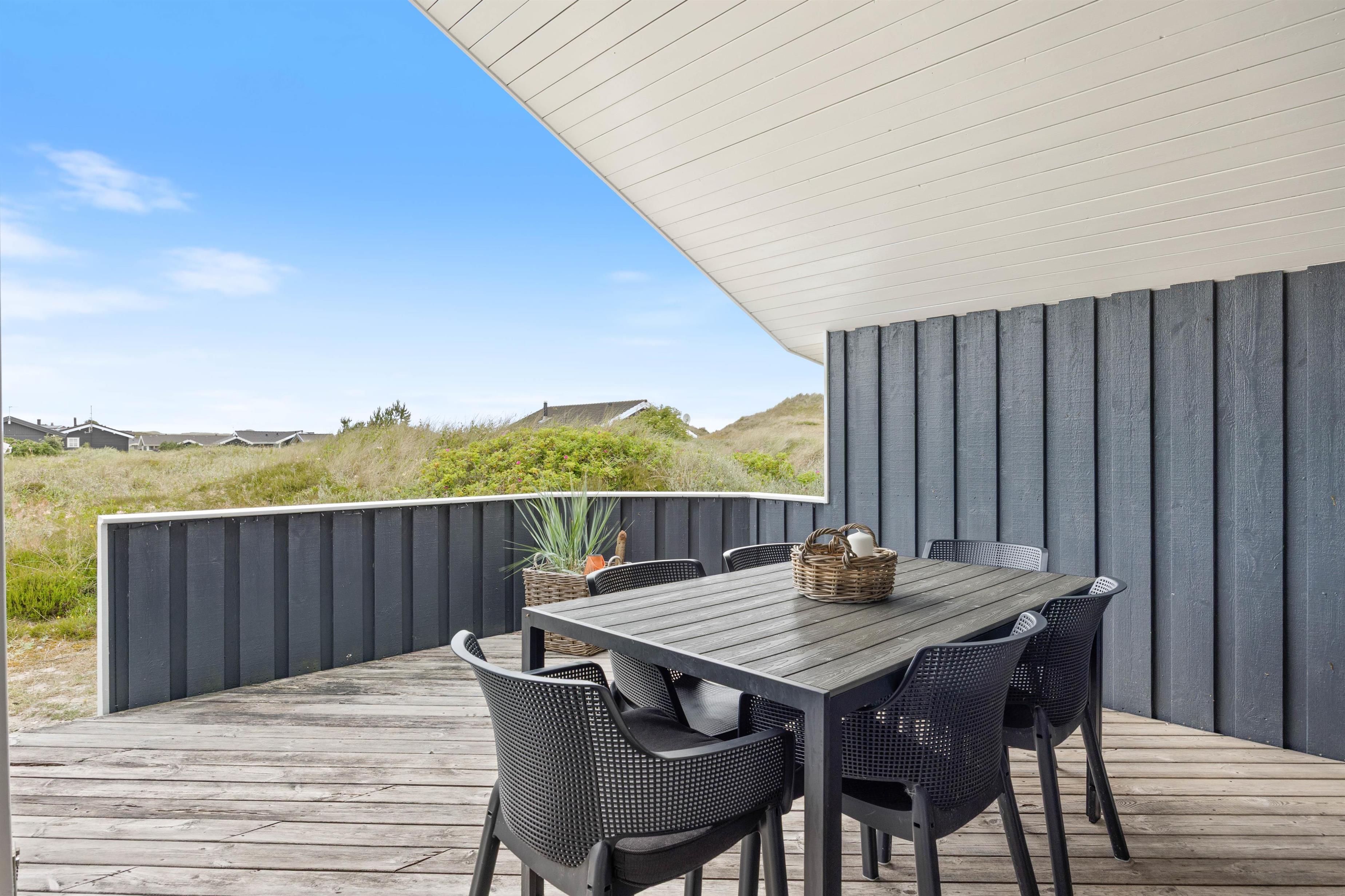 En hyggelig og lukket terrasse mod syd indbyder til masser af udendørs aktivitet. Her kan man nyde morgenkaffen til solopgangen over Ringkøbing Fjord mod øst, mens børnene gynger eller leger i sandkassen. – Sidst på dagen kan man nyde solnedgangen over klitterne mod vest, måske sammen med en veltilberedt grillmiddag på terrassen – og med havets beroligende brusen i baggrunden.