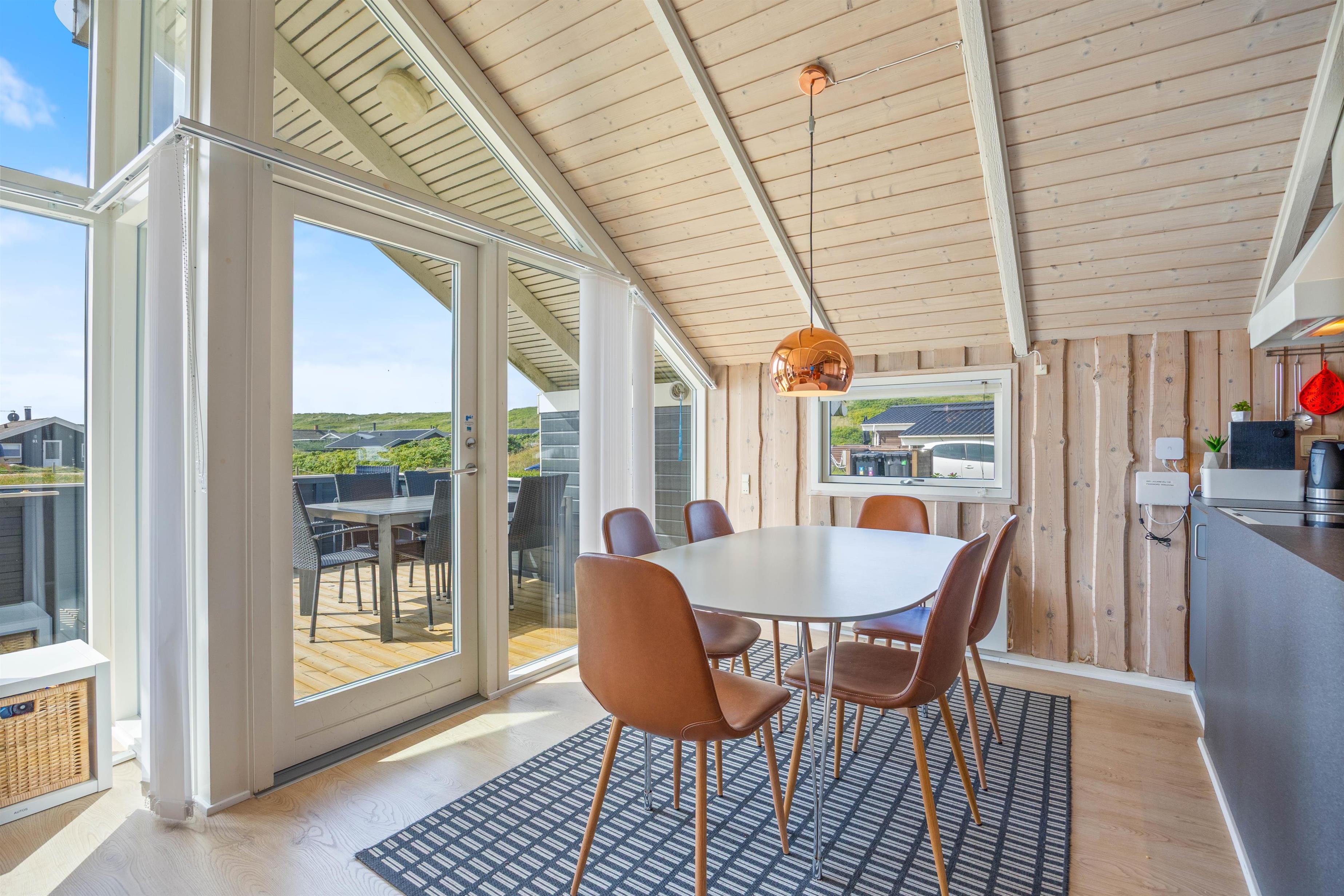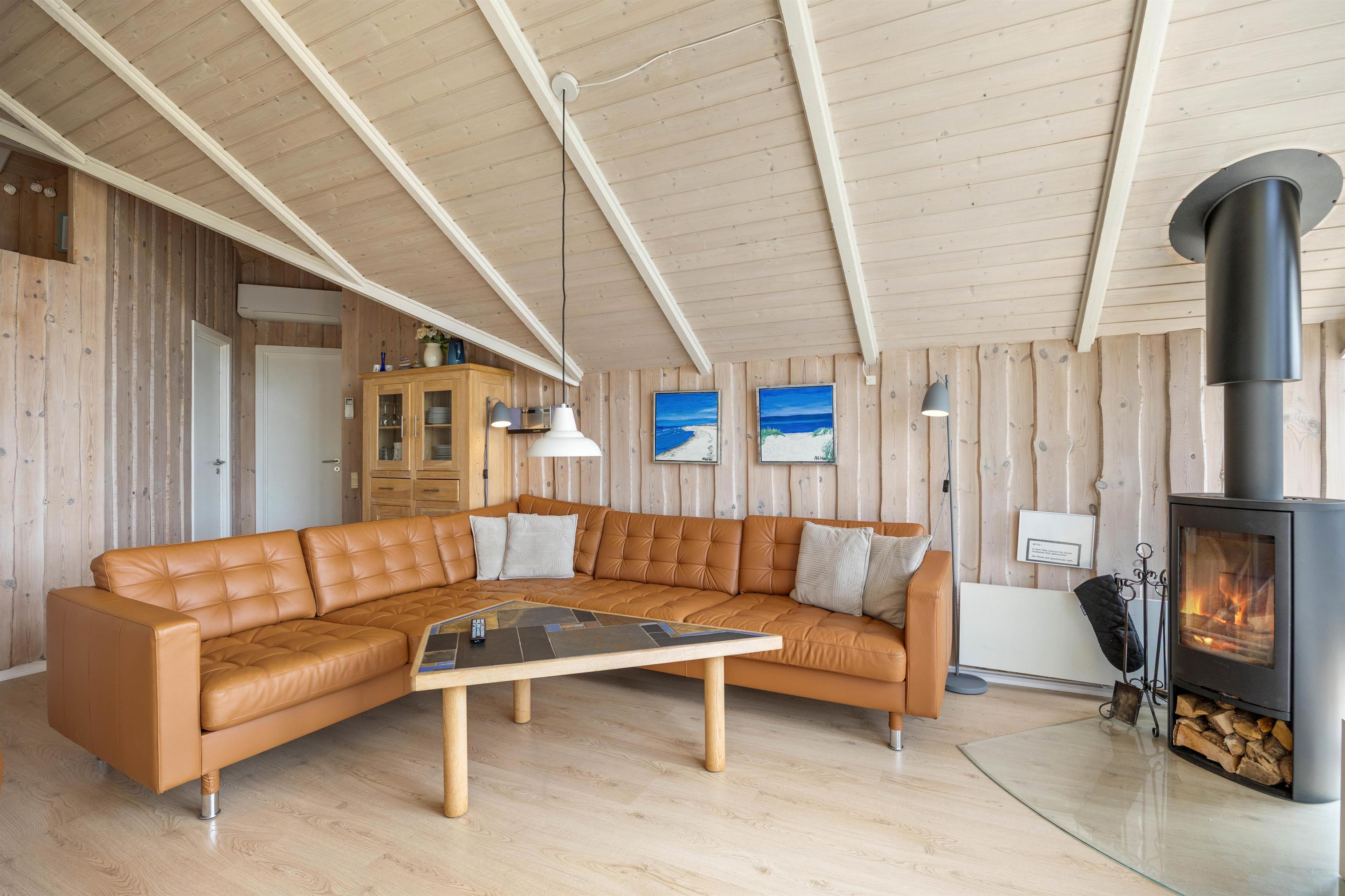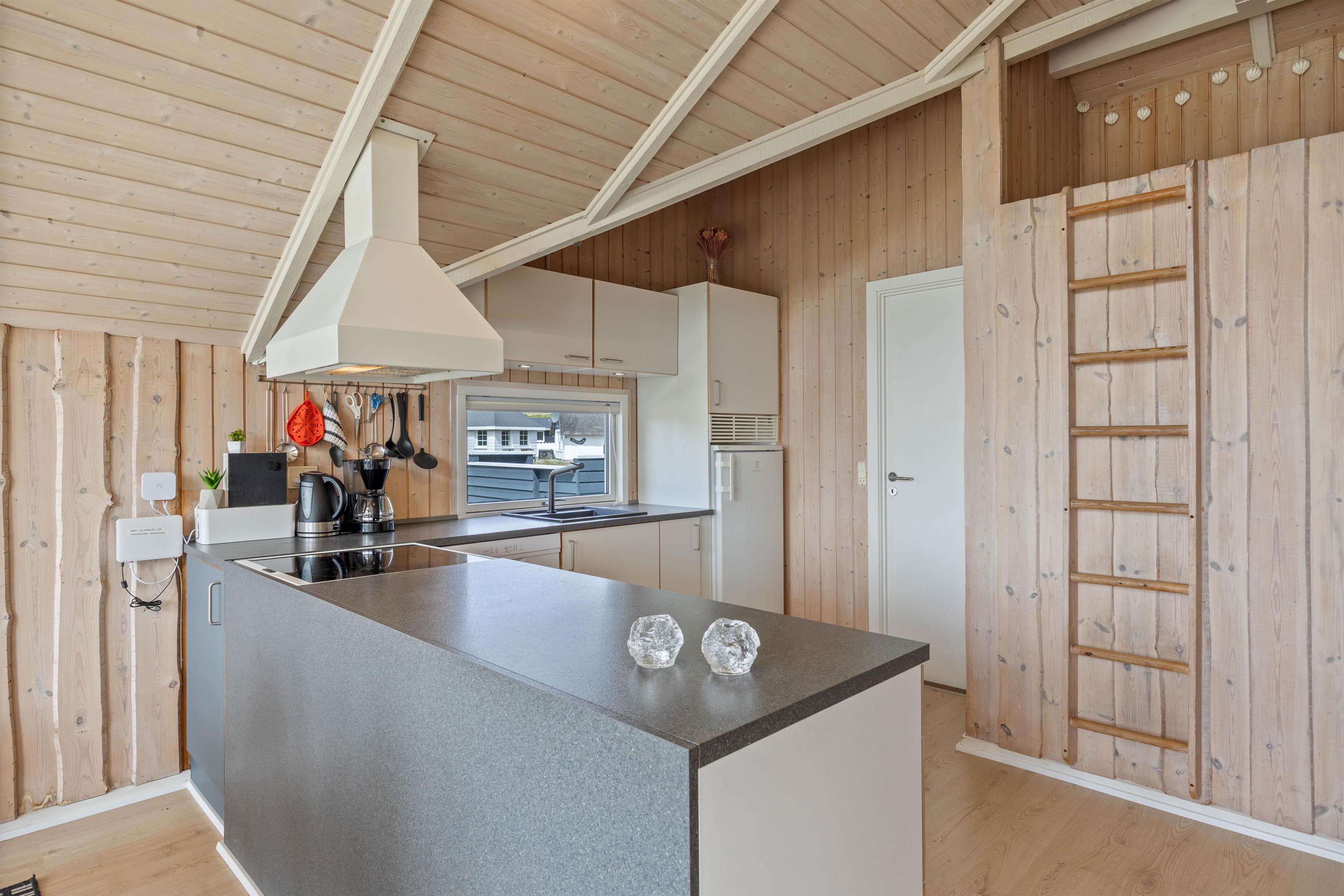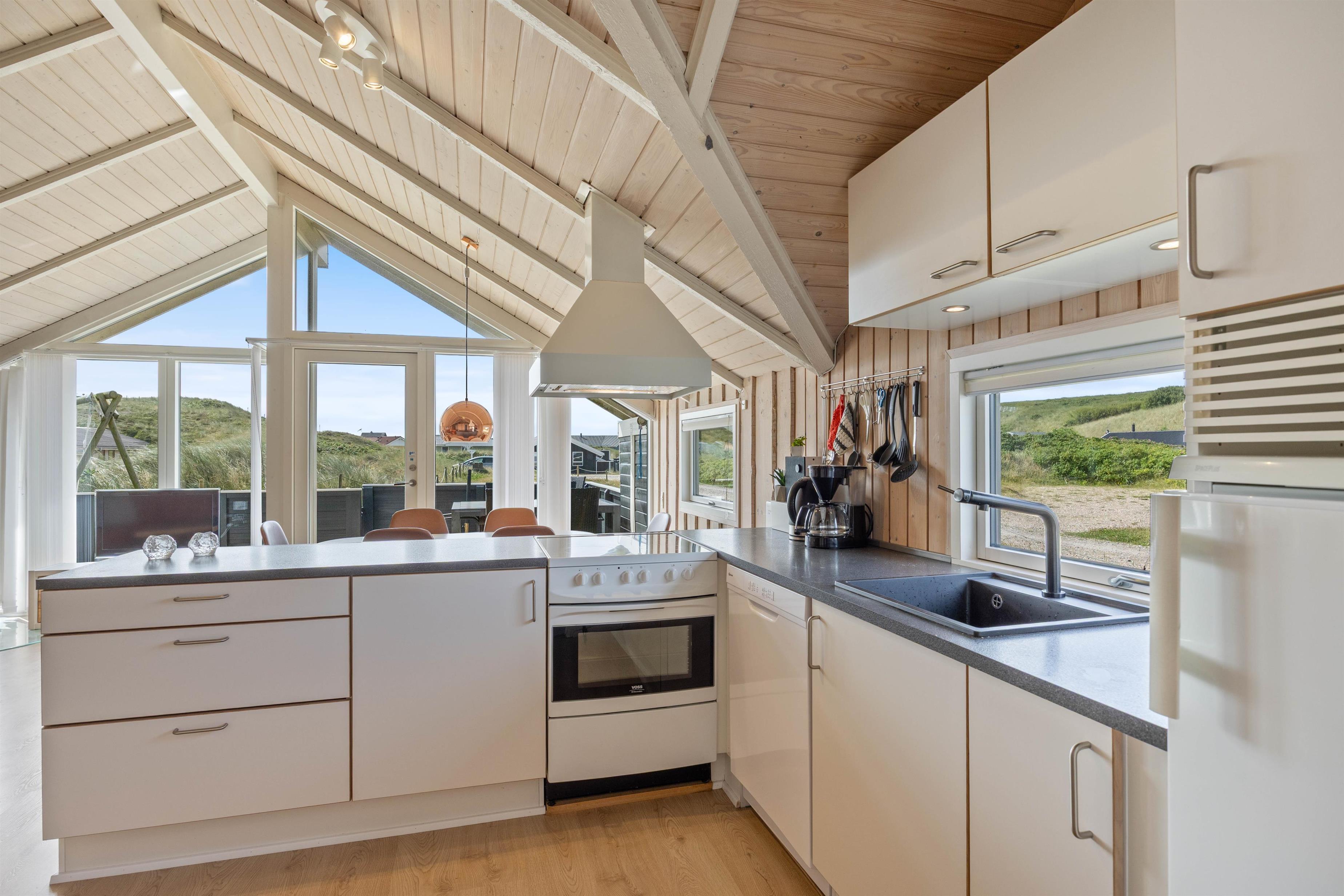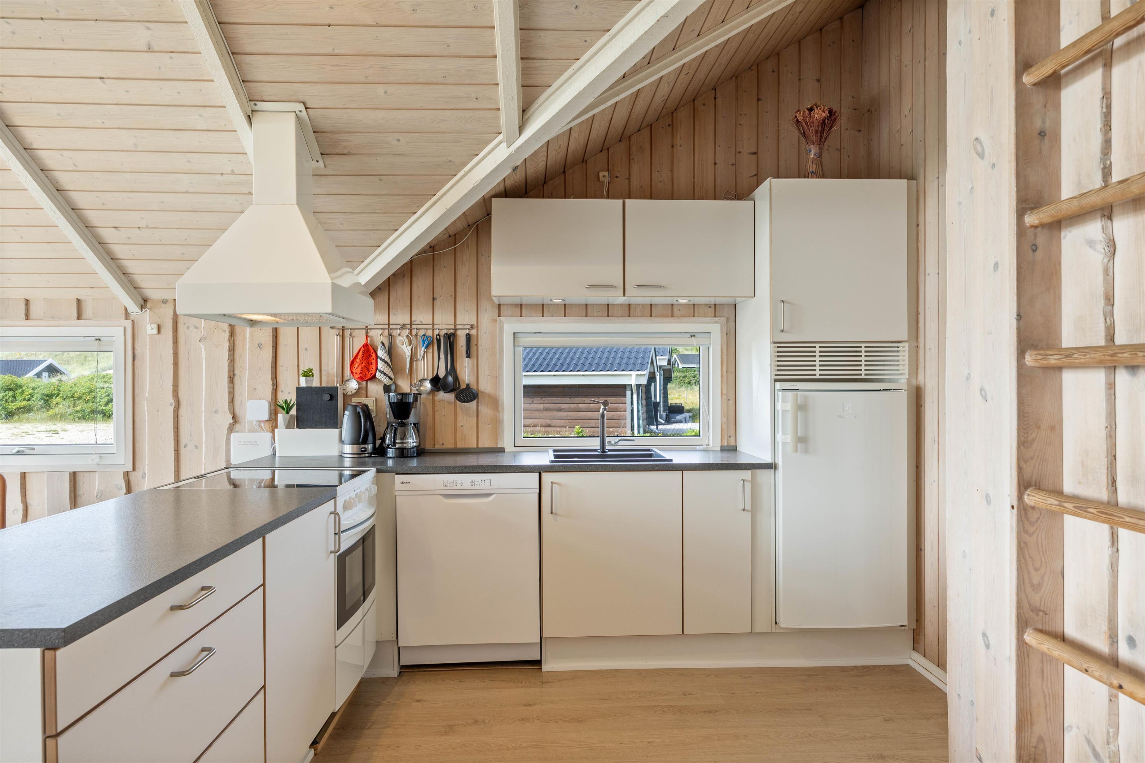 Feriehusets lyse indretning og fine lysindfald giver sammen med brændeovnen en dejlig feriestemning. Opholdsstuen indbyder til hyggelige aftener med knitrende ild i brændeovnen. Det åbne køkken er moderne udstyret med alt, hvad I behøver for at gøre madlavningen til en fornøjelse, herunder opvaskemaskine.