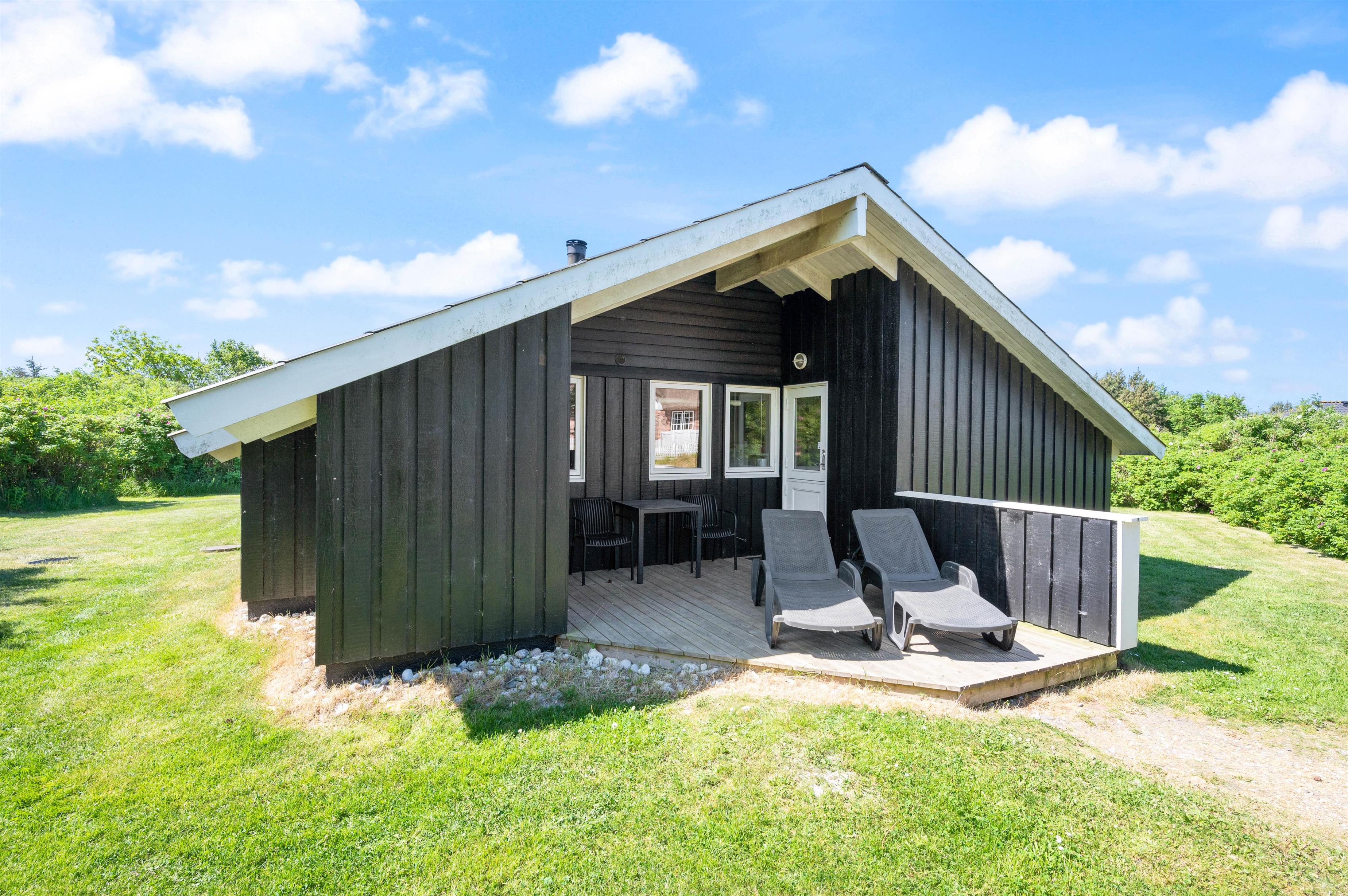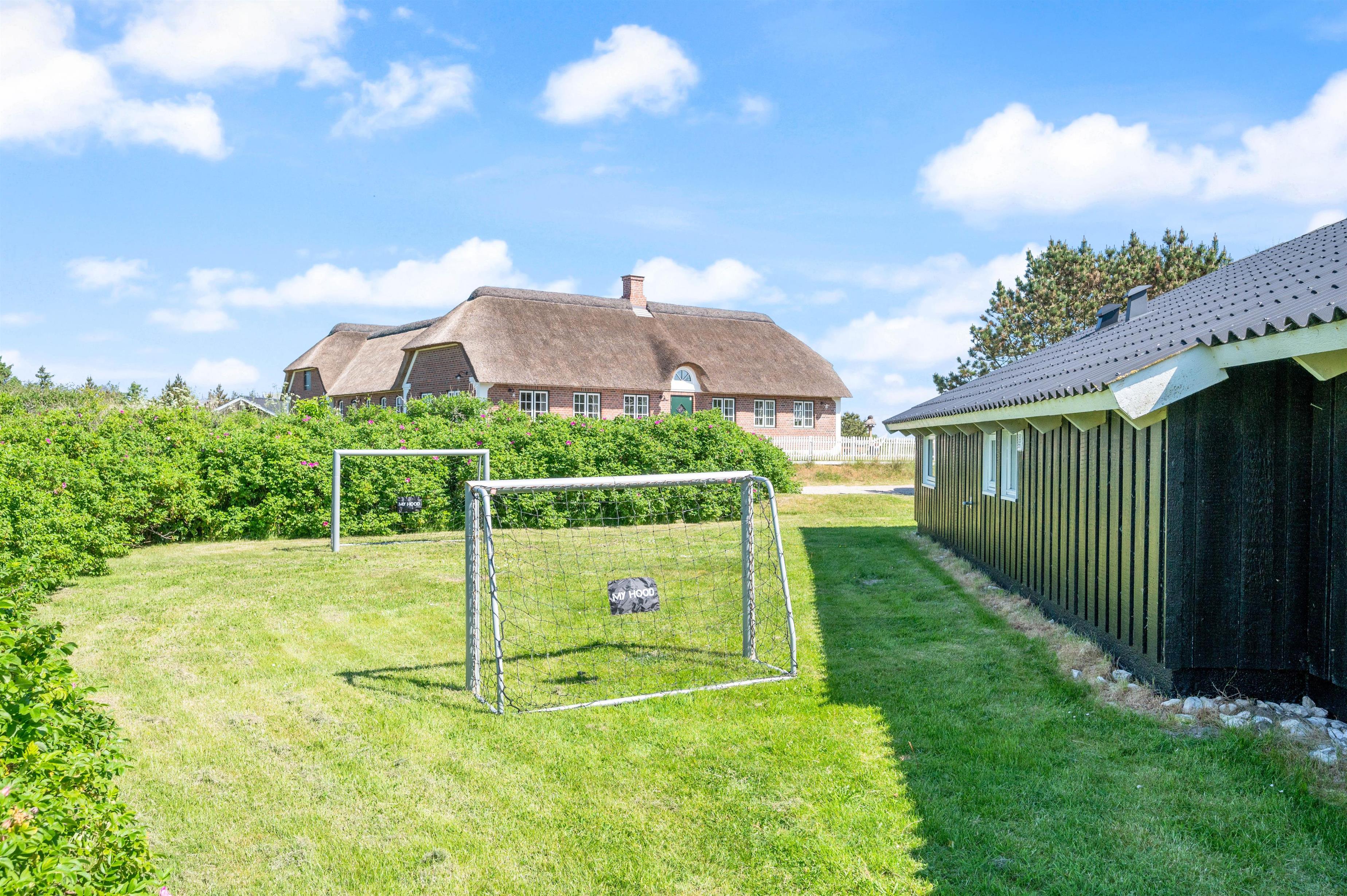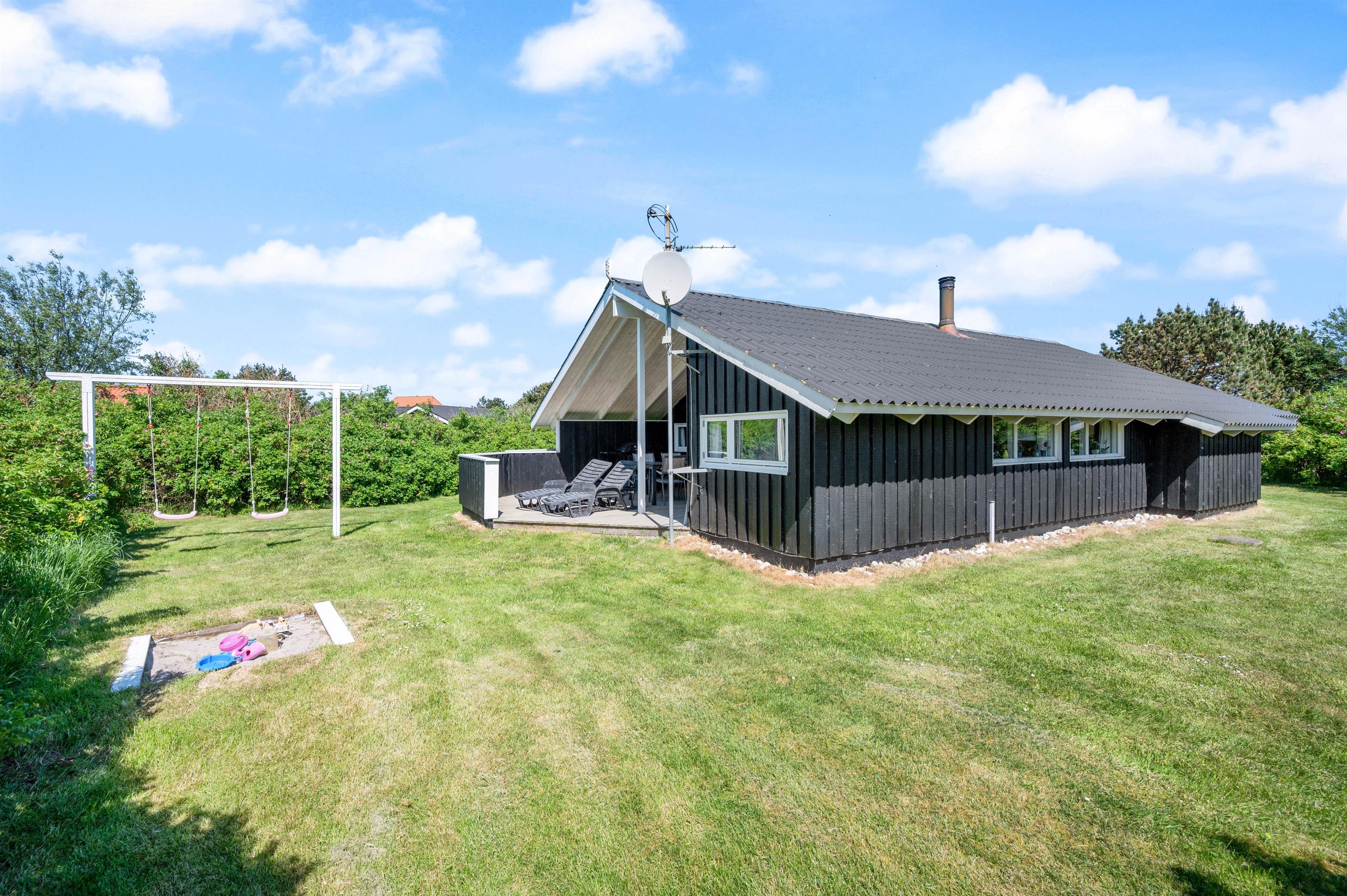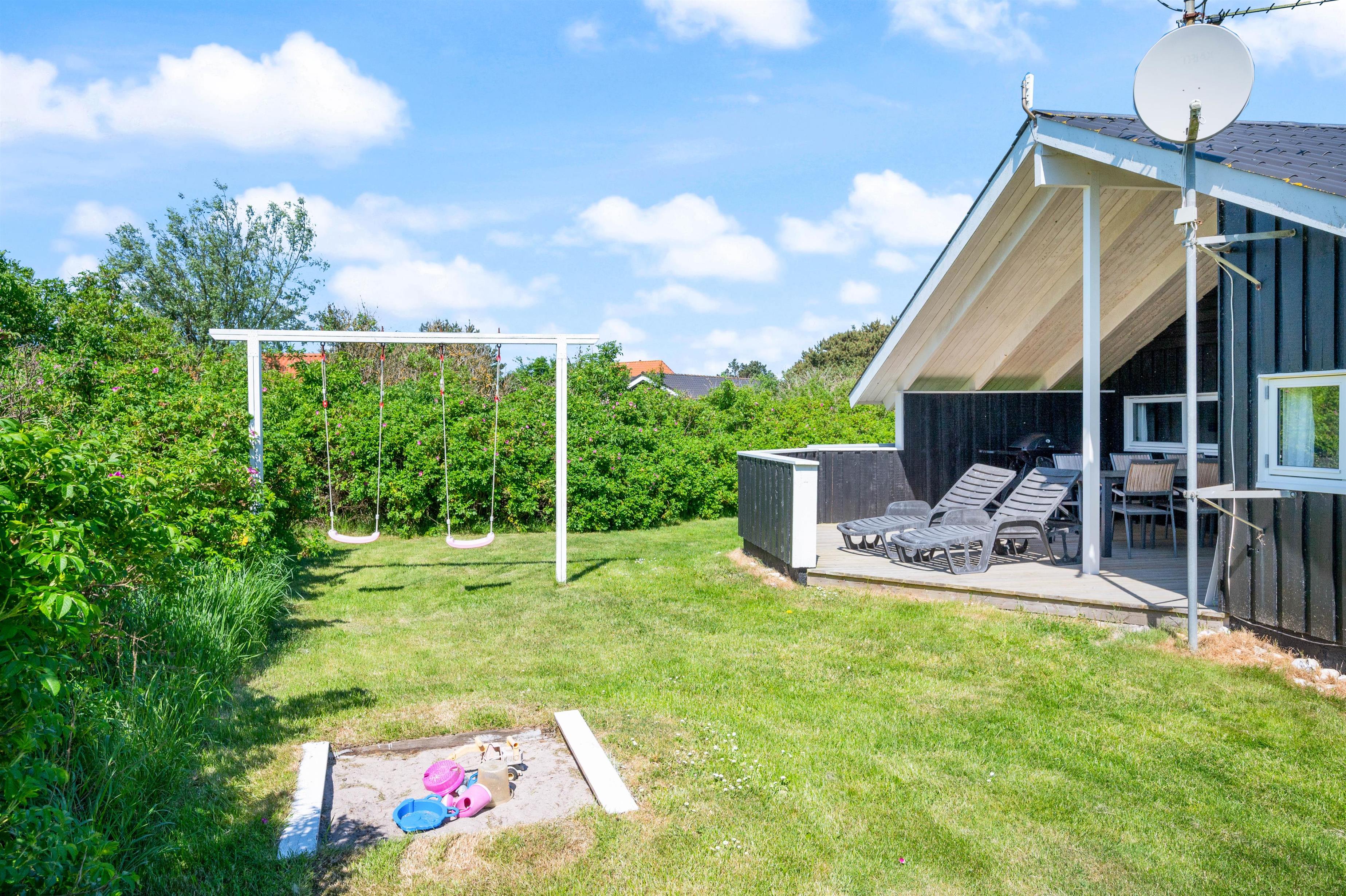 Den ca. 1200 kvm store plænegrund er omgivet af buske og har en dejlig, delvist afskærmet terrasse. Sæt dig til rette i de komfortable havemøbler med en frisk kop kaffe og slap af med din yndlingsbog. Imens kan børnene spille fodbold eller vikingeskak på plænen, lege i sandkassen eller gynge. Til en hyggelig grillaften er der også en gasgrill ved feriehuset. Med under 1 kilometer til Vesterhavet er det oplagt med en vandretur langs stranden med hund og børn. Så kan alle være tilpas afslappede ved sengetid. En solnedgang ved Vesterhavet er altid en oplevelse.
