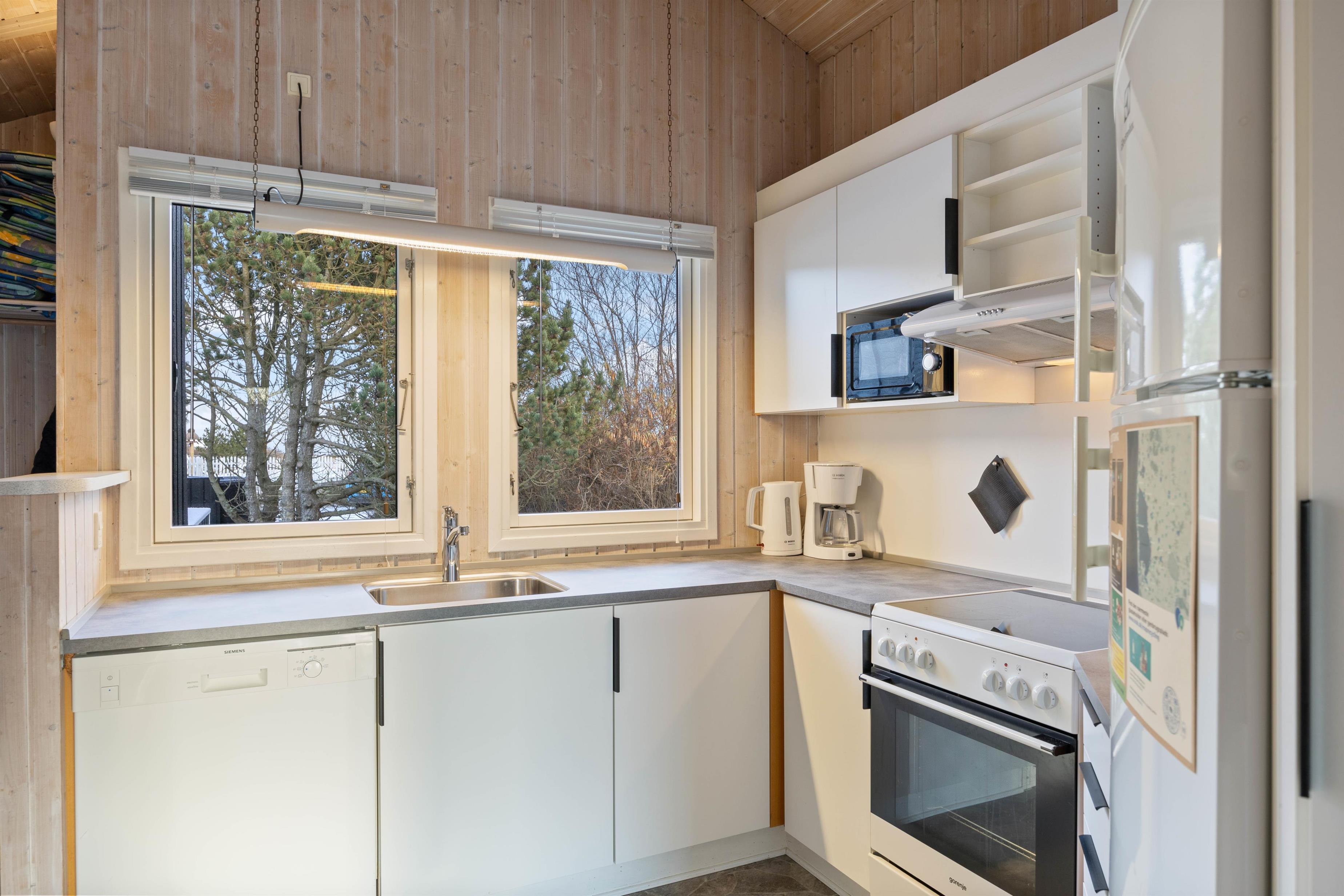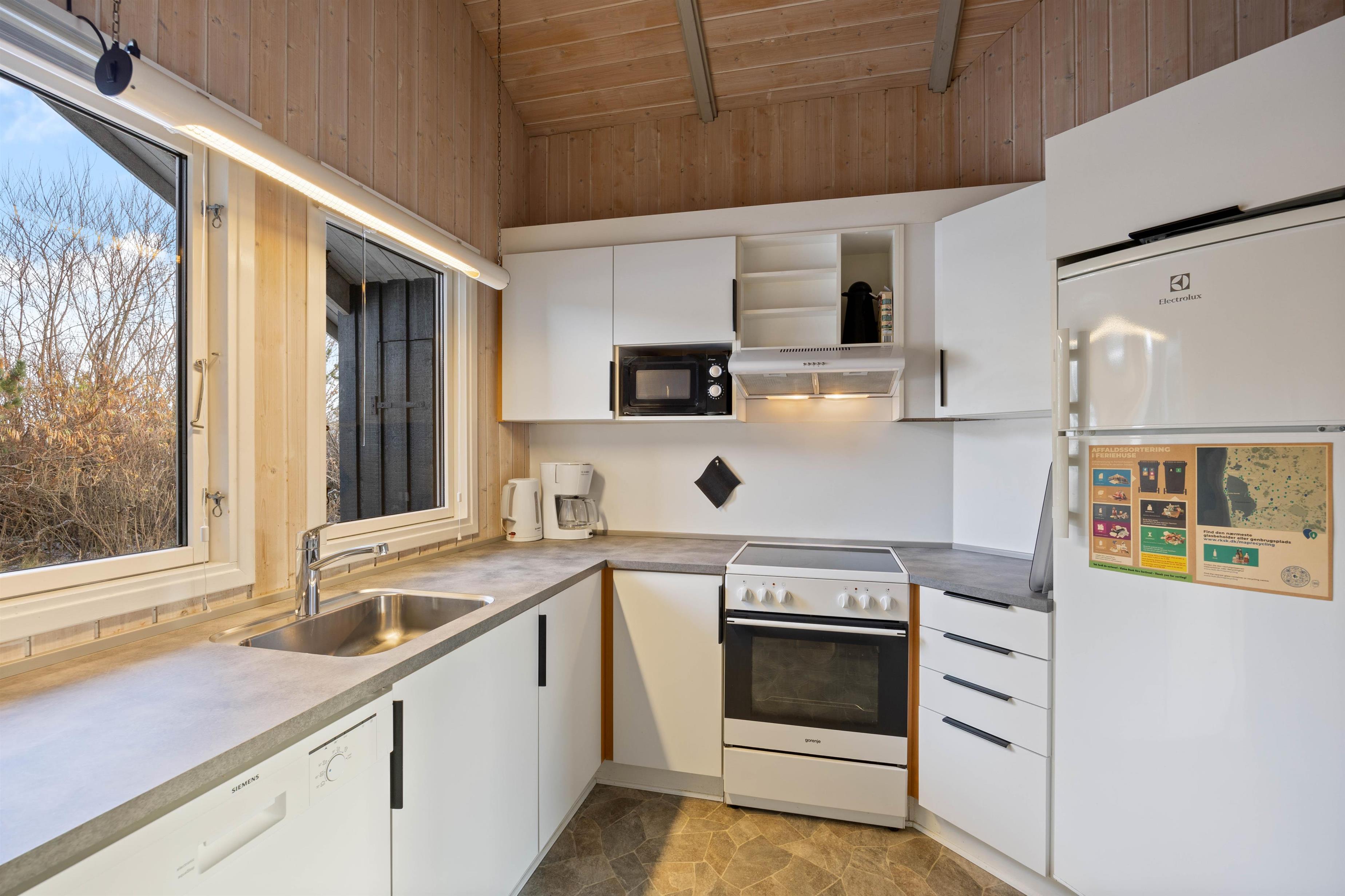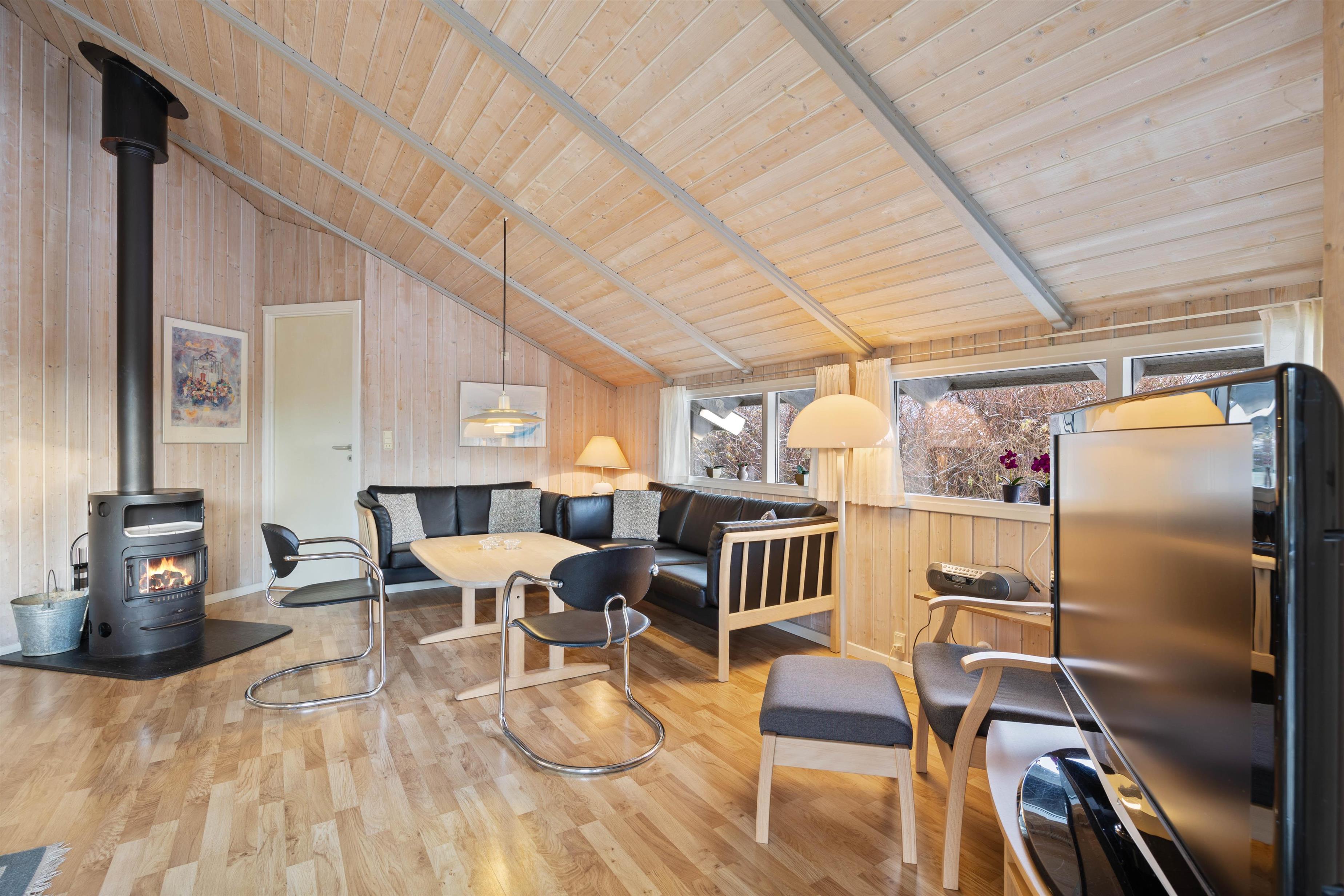 Man føler sig velkommen og godt tilpas straks, man træder ind i feriehuset. Den lyse og venlige indretning sammenholdt med et fint lysindfald fra vinduespartierne giver en rolig og dejlig feriestemning, som bare stiger, hvis I også tænder op i brændeovnen. Her kan I tilbringe aftenen sammen med at spille spil eller se en god film. Ved spisebordet er der plads til socialt samvær eller kreative ferieprojekter. Køkkenet indeholder alt, hvad I behøver for at forkæle hinanden med lækre, hjemmelavede måltider.