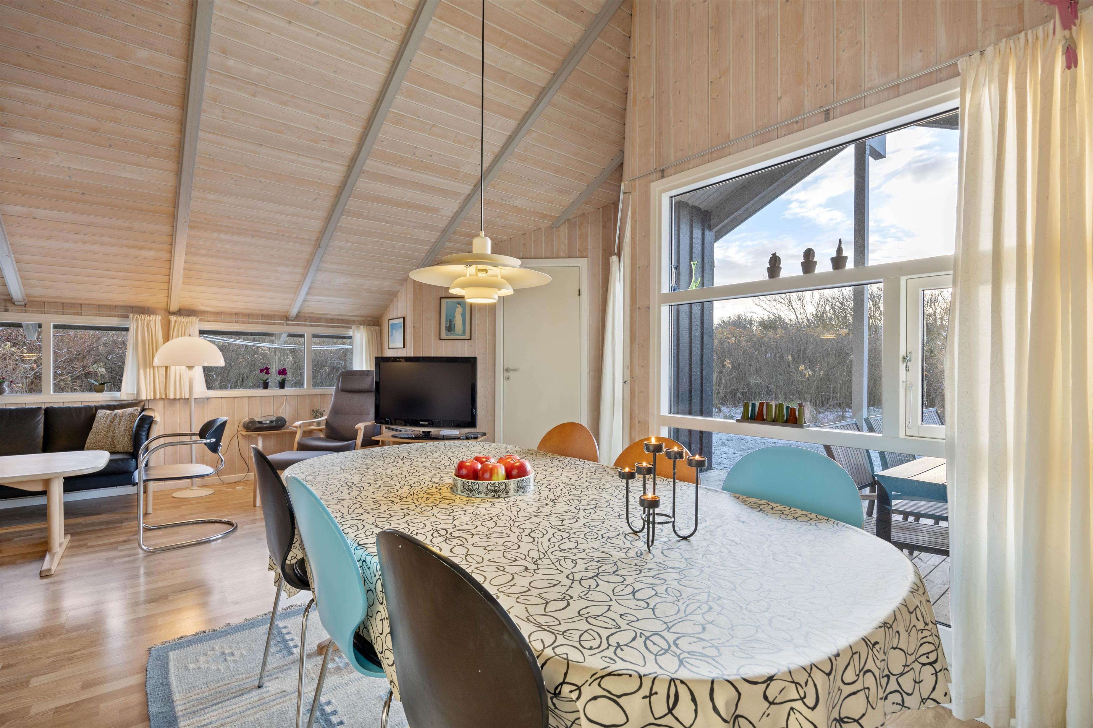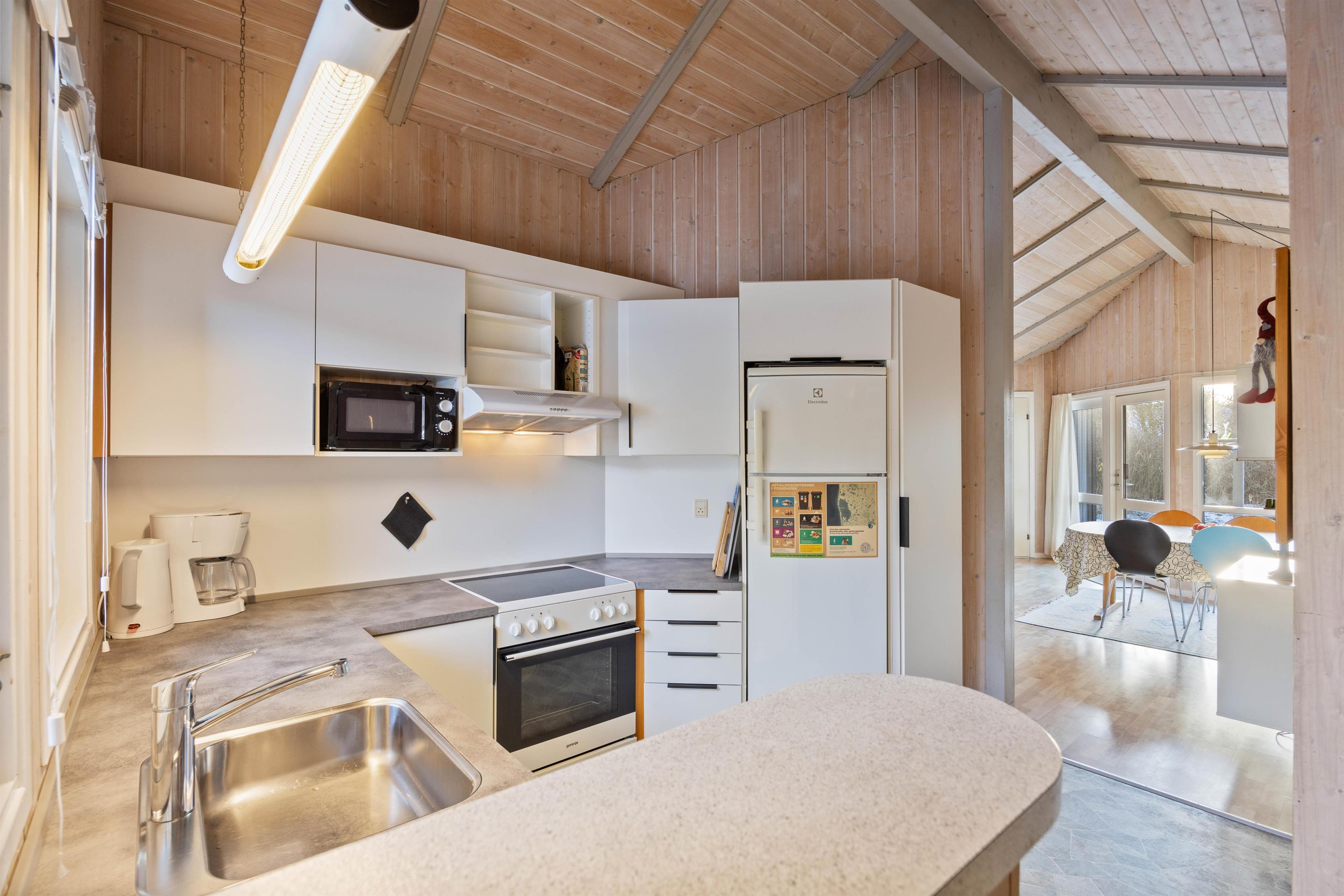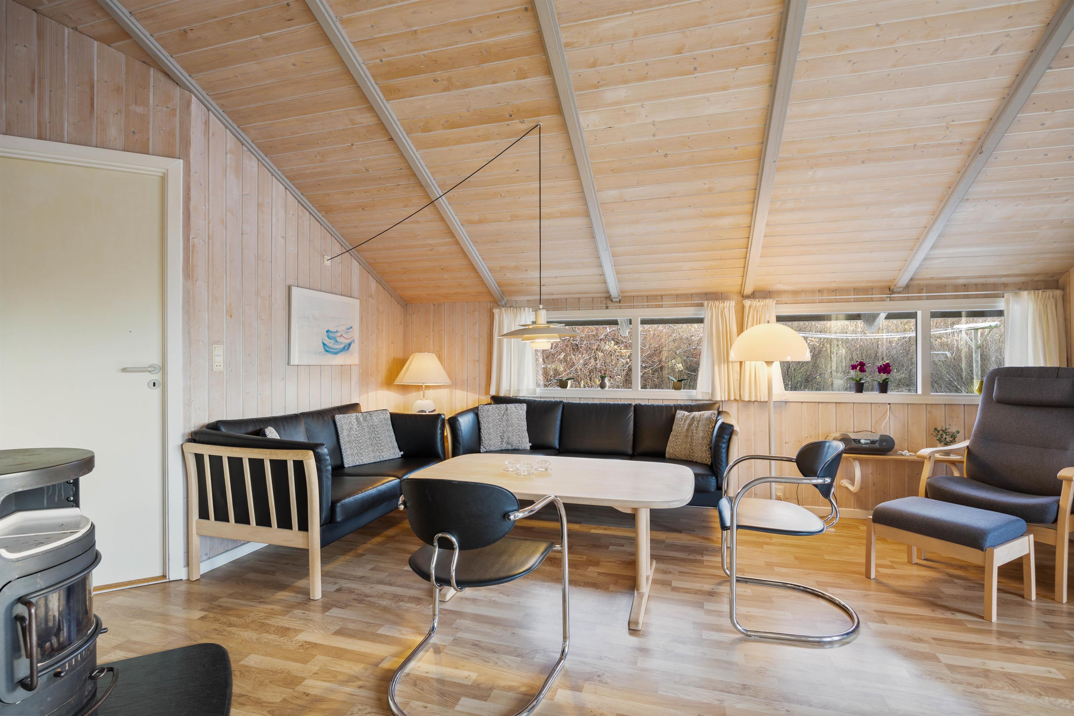 Man føler sig velkommen og godt tilpas straks, man træder ind i feriehuset. Den lyse og venlige indretning sammenholdt med et fint lysindfald fra vinduespartierne giver en rolig og dejlig feriestemning, som bare stiger, hvis I også tænder op i brændeovnen. Her kan I tilbringe aftenen sammen med at spille spil eller se en god film. Ved spisebordet er der plads til socialt samvær eller kreative ferieprojekter. Køkkenet indeholder alt, hvad I behøver for at forkæle hinanden med lækre, hjemmelavede måltider.