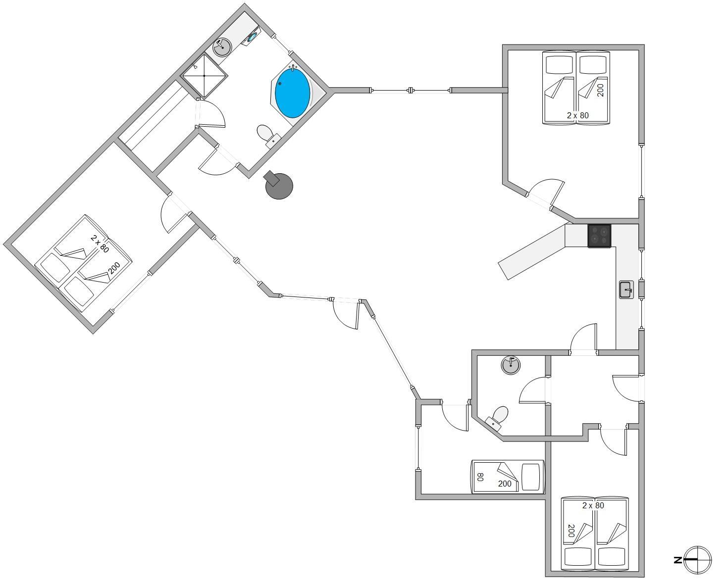 Sommerhusets 7 sovepladser fordeler sig på 4 værelser, hvoraf de 3 er indrettet med komfortable dobbeltsenge. På det sidste værelse finder I en enkeltseng til en god nats søvn.