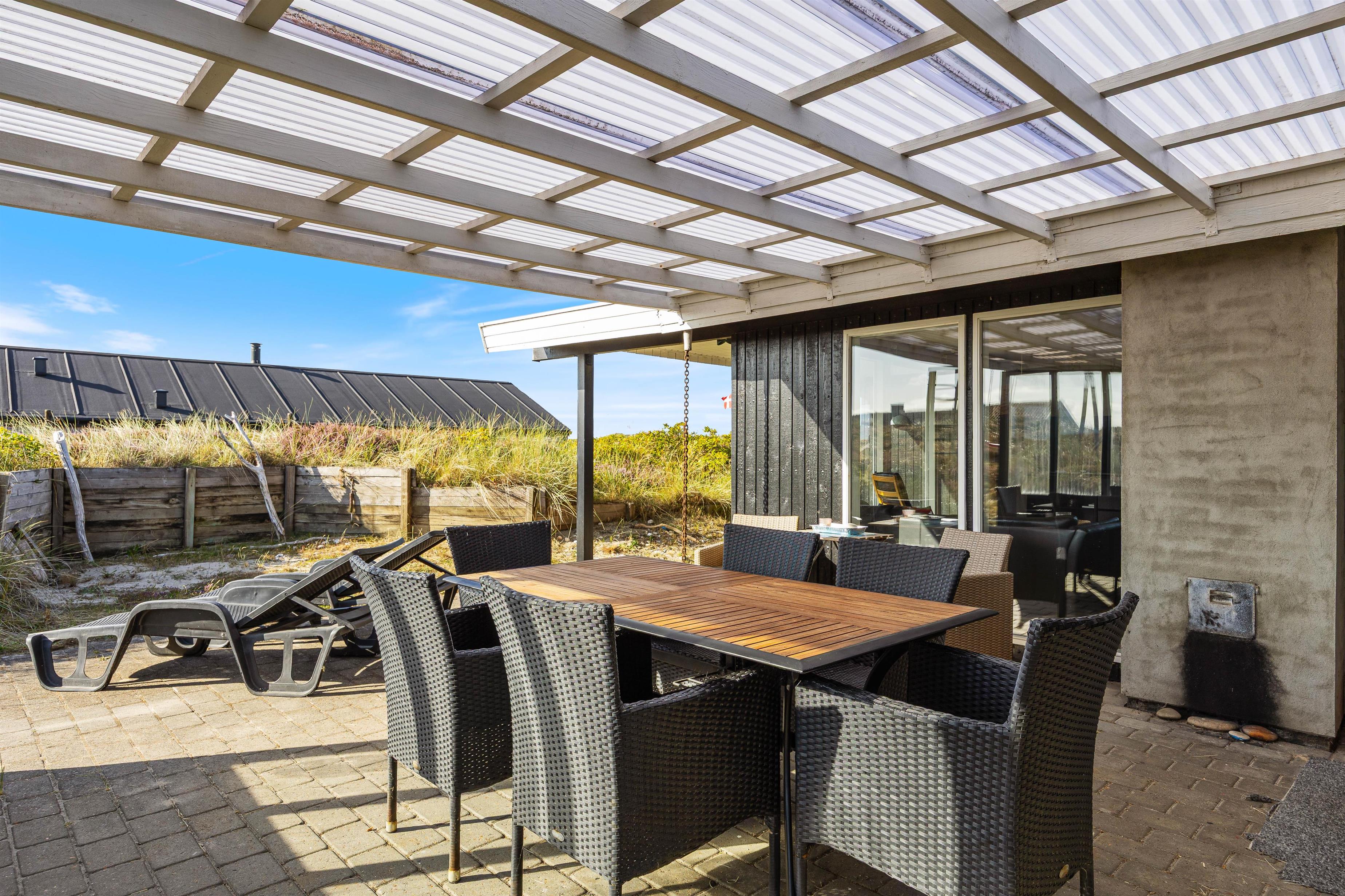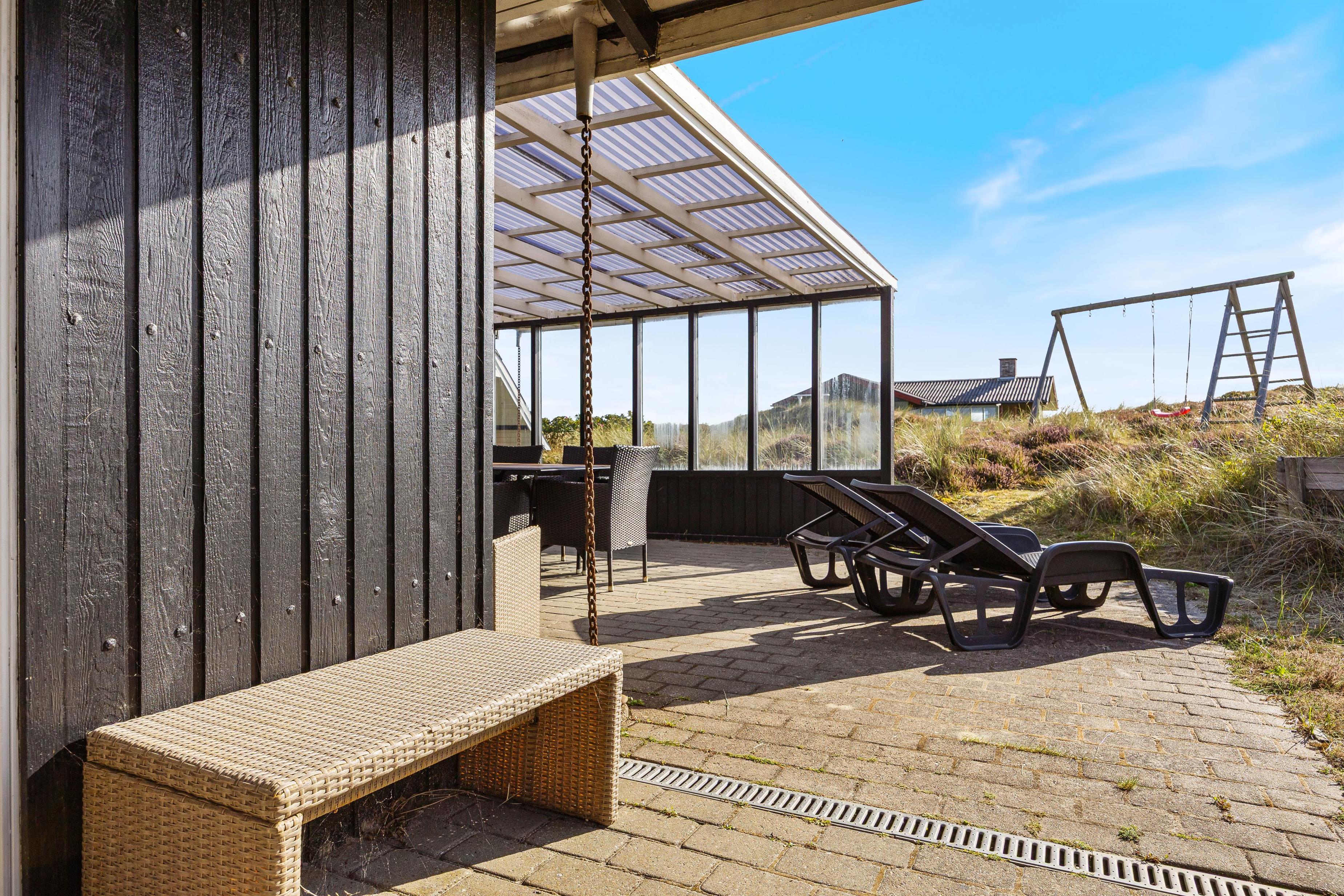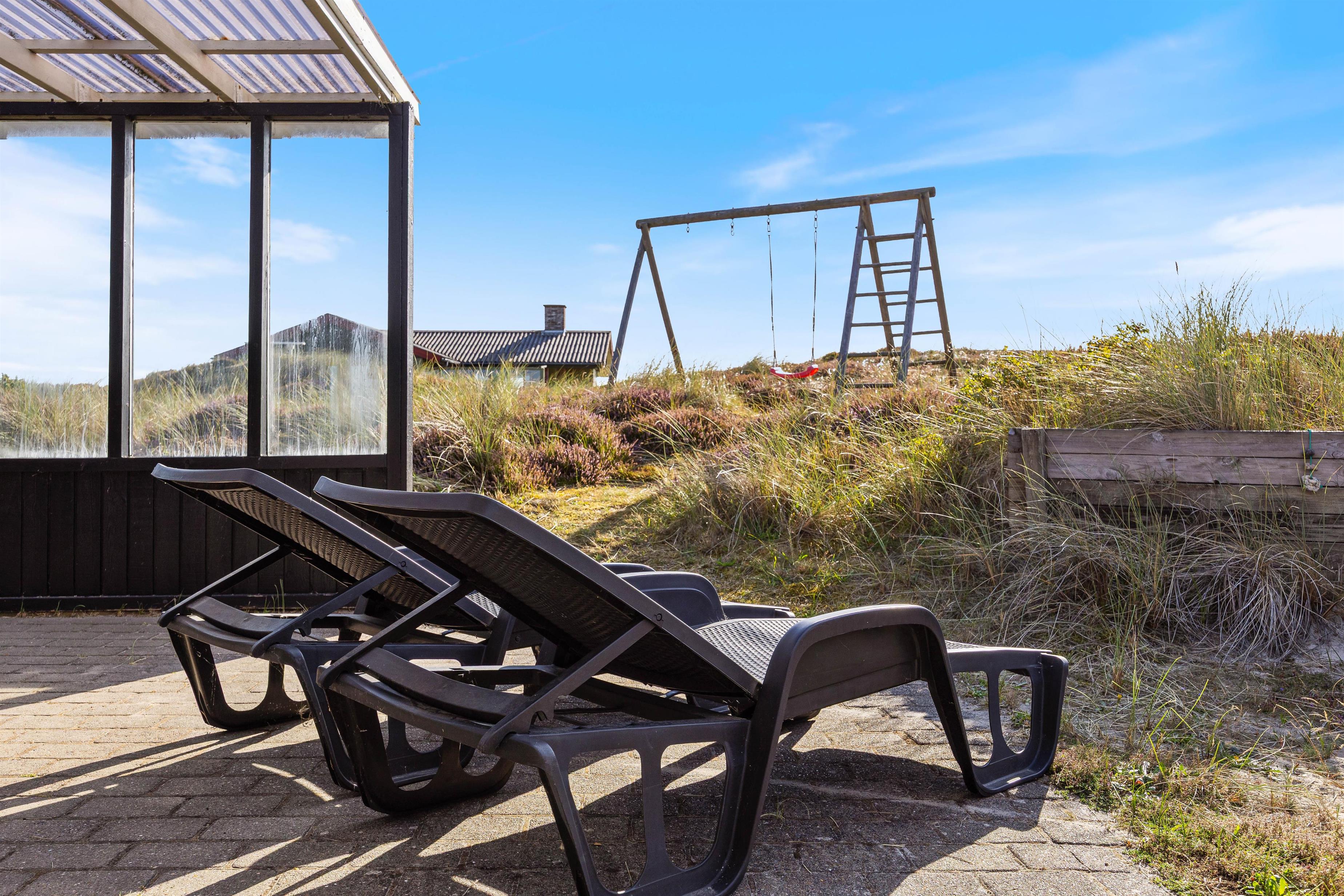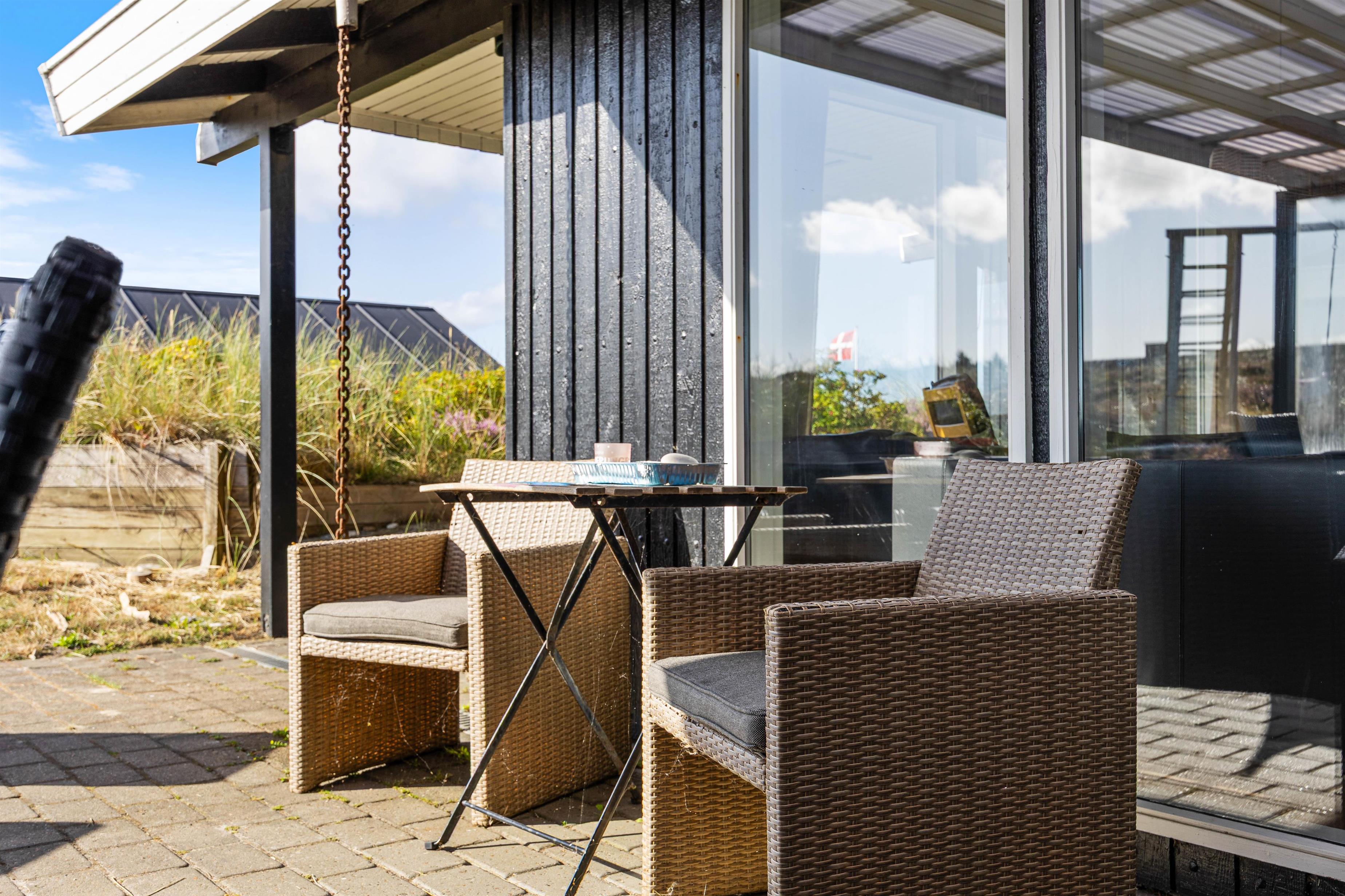 På sommerhusets både overdækkede og afskærmede terrasse kan I nyde en frisklavet kop kaffe, imens børnene slår sig løs på den store naturgrund med tilhørende gynger. Skinner solen, kan I trække jer ud og nyde strålerne derfra på sommerhusets havemøbler og liggestole.
