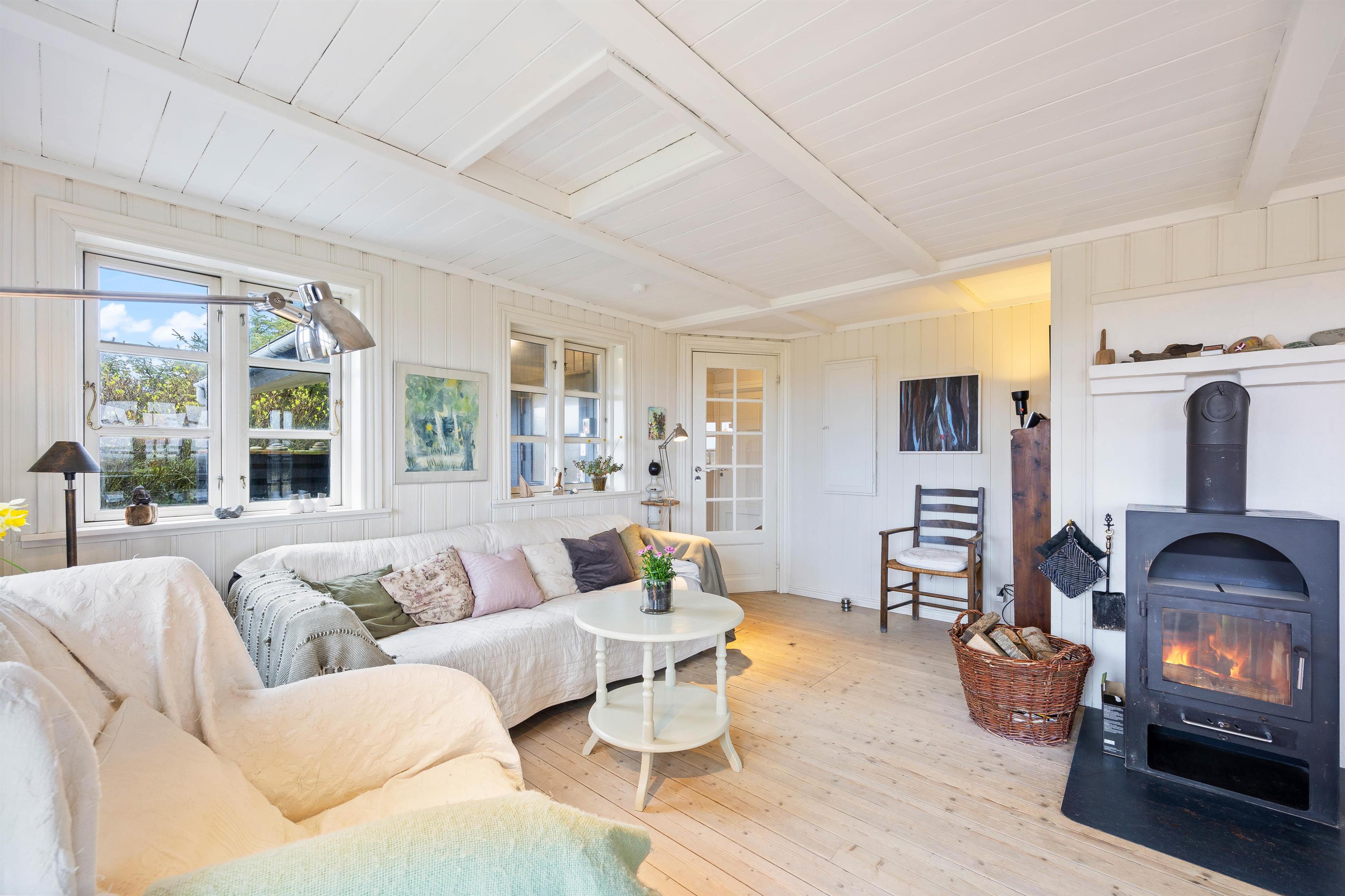 I det stemningsfyldte opholdsrum kan hver især finde sit yndlingshjørne, om det så er i sofaen, foran brændeovnen, i en lænestol eller på bænken ved spisebordet. Sommerhuset har også et hyggeligt alkoverum, hvor I kan trække jer tilbage og nyde en middagslur eller en afslappende stund.