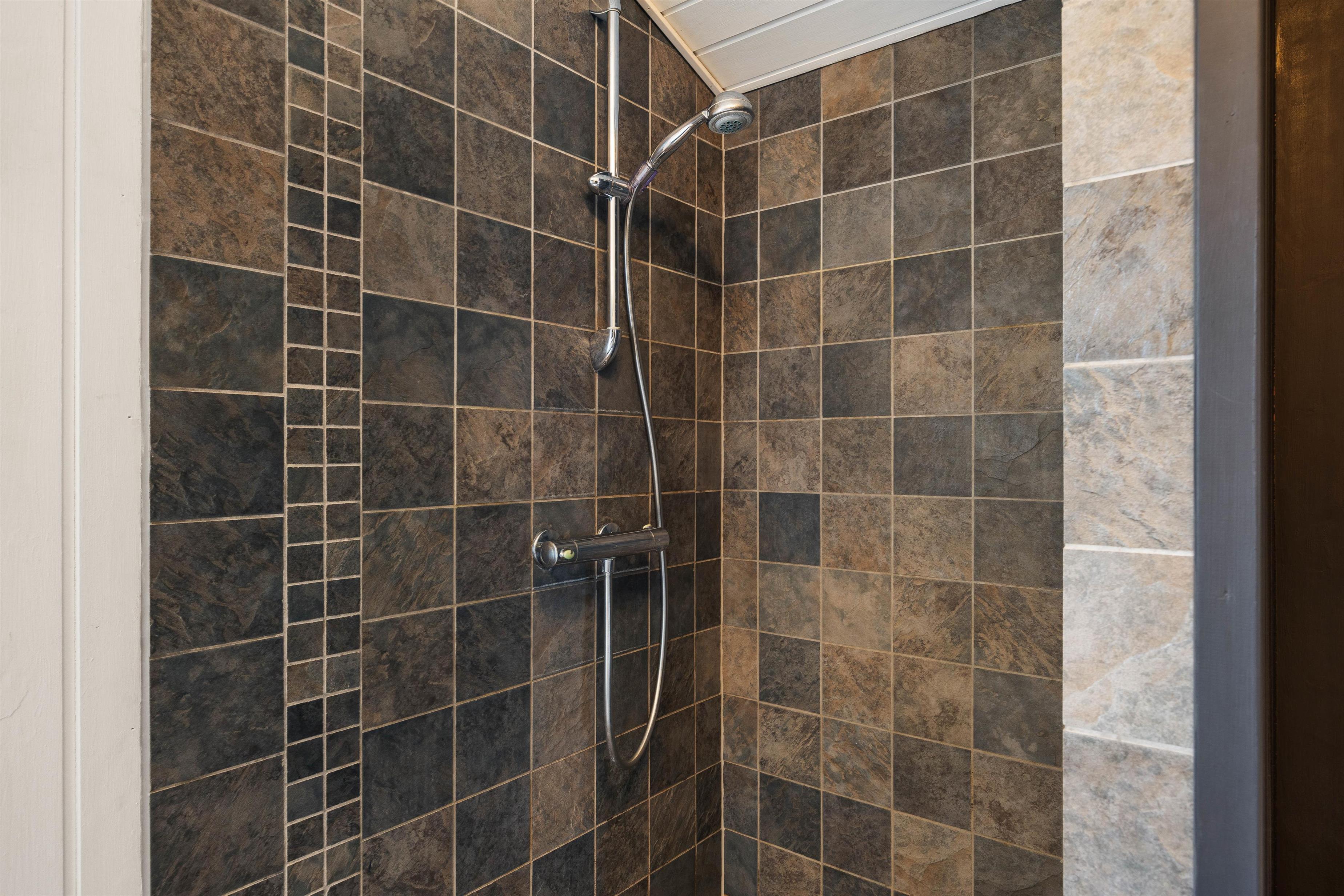 Sommerhusets rummelige badeværelse har gulvvarme og er derudover indrettet med en vaskemaskine.