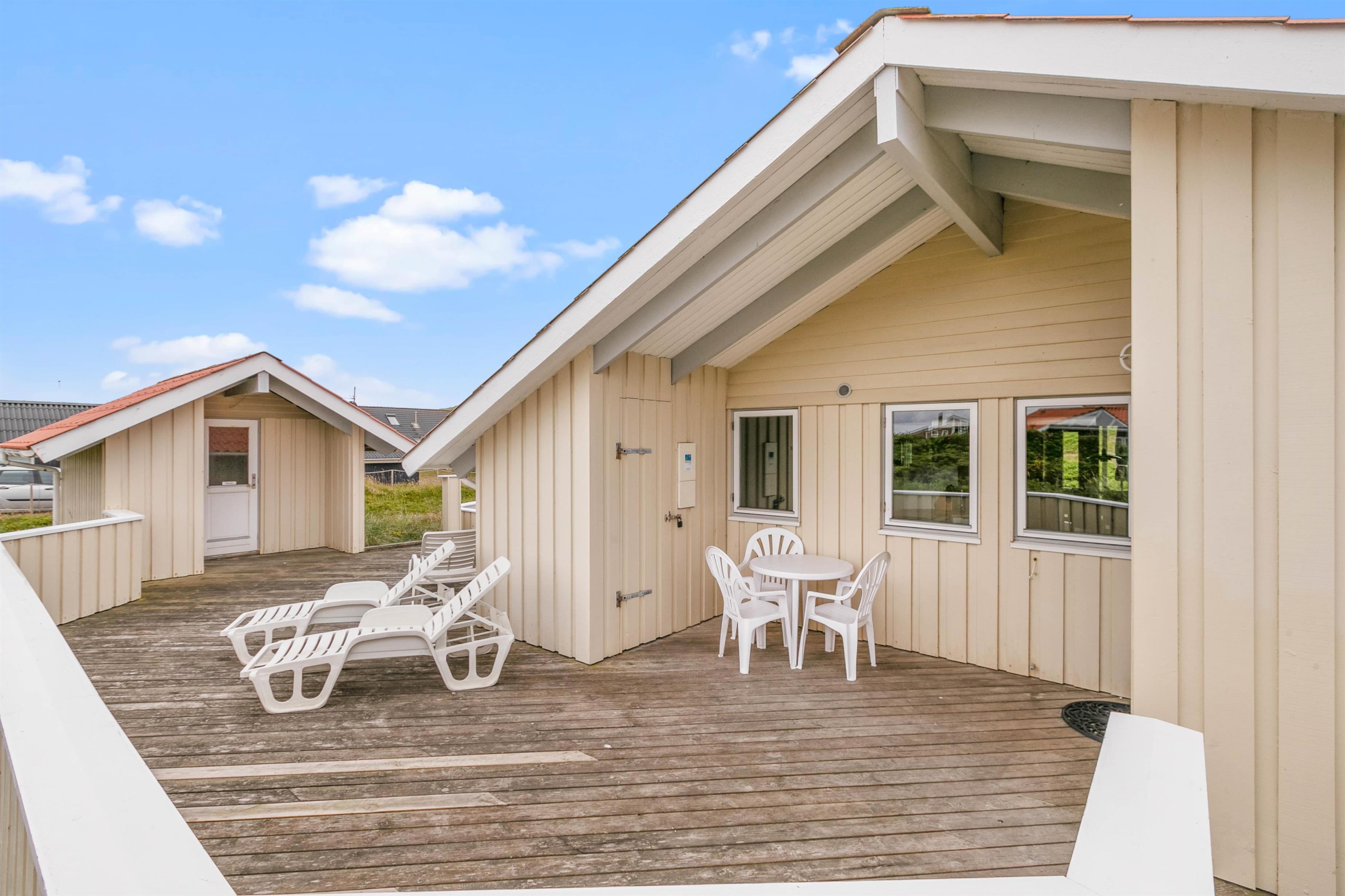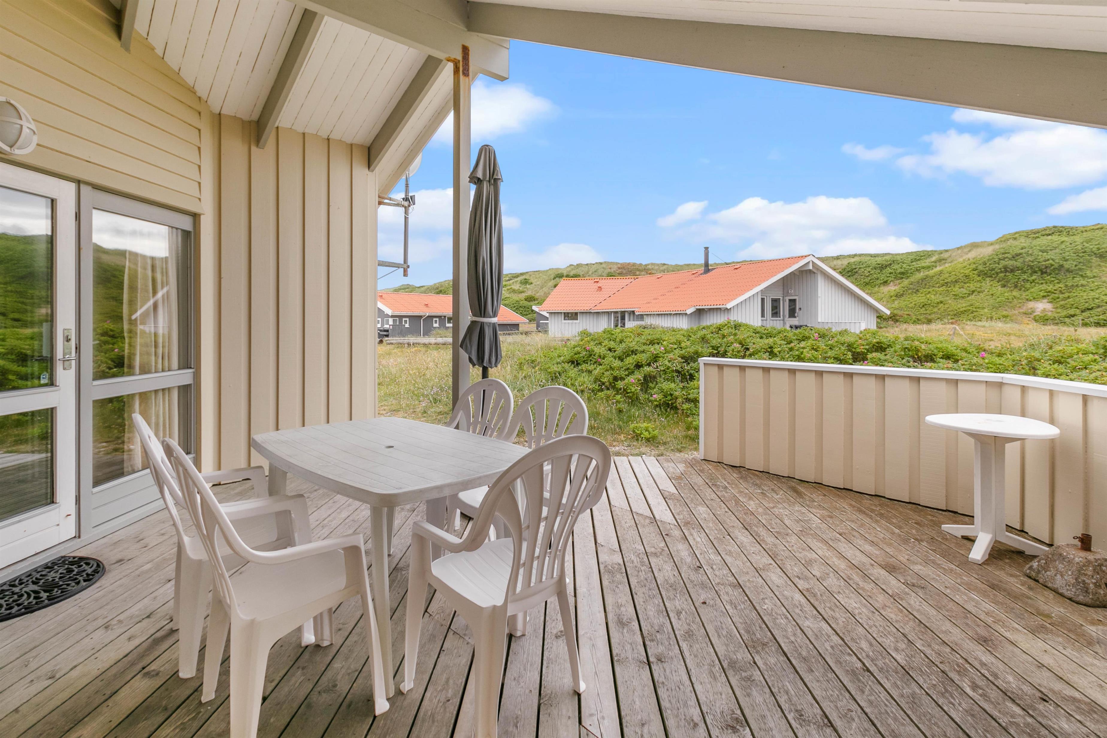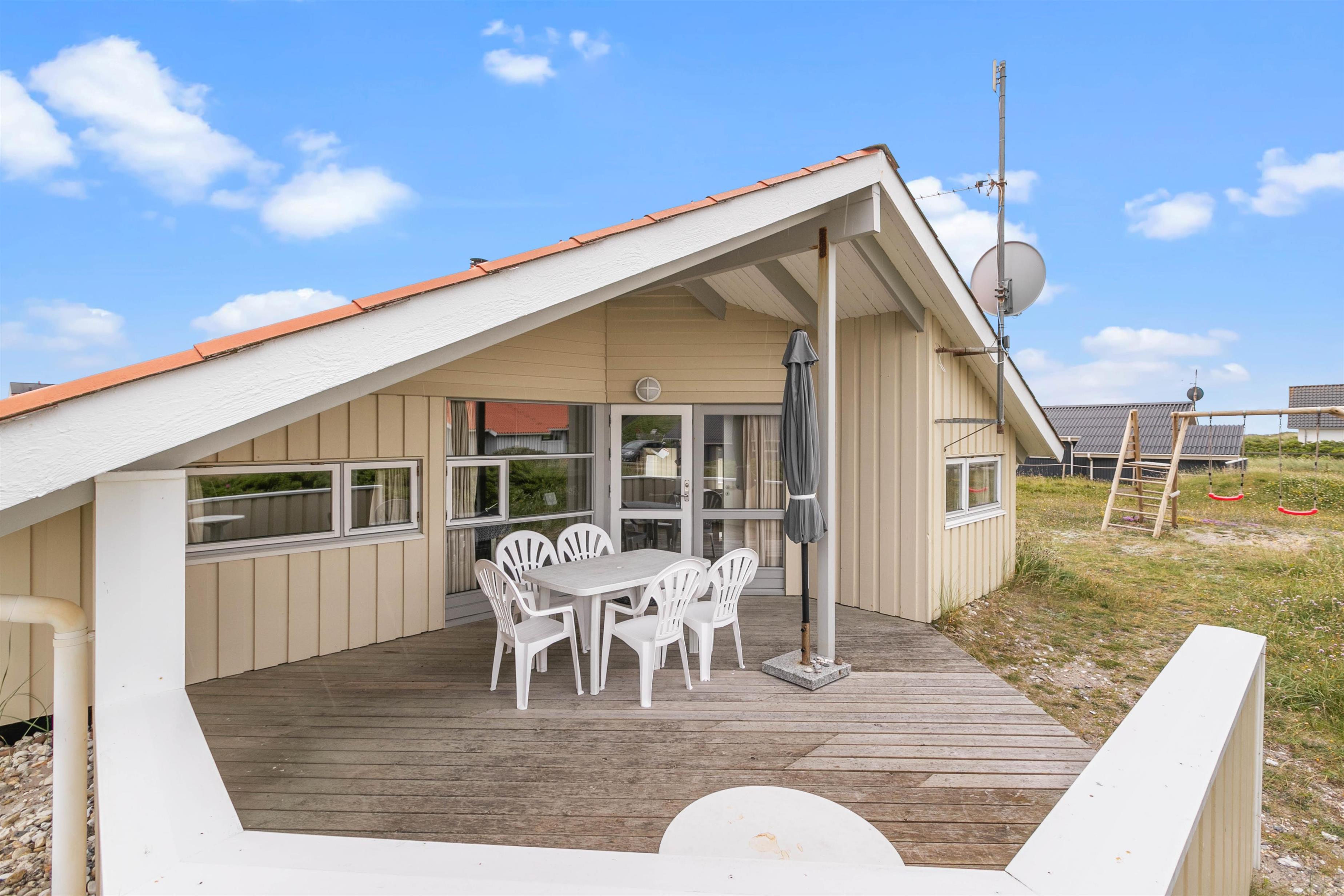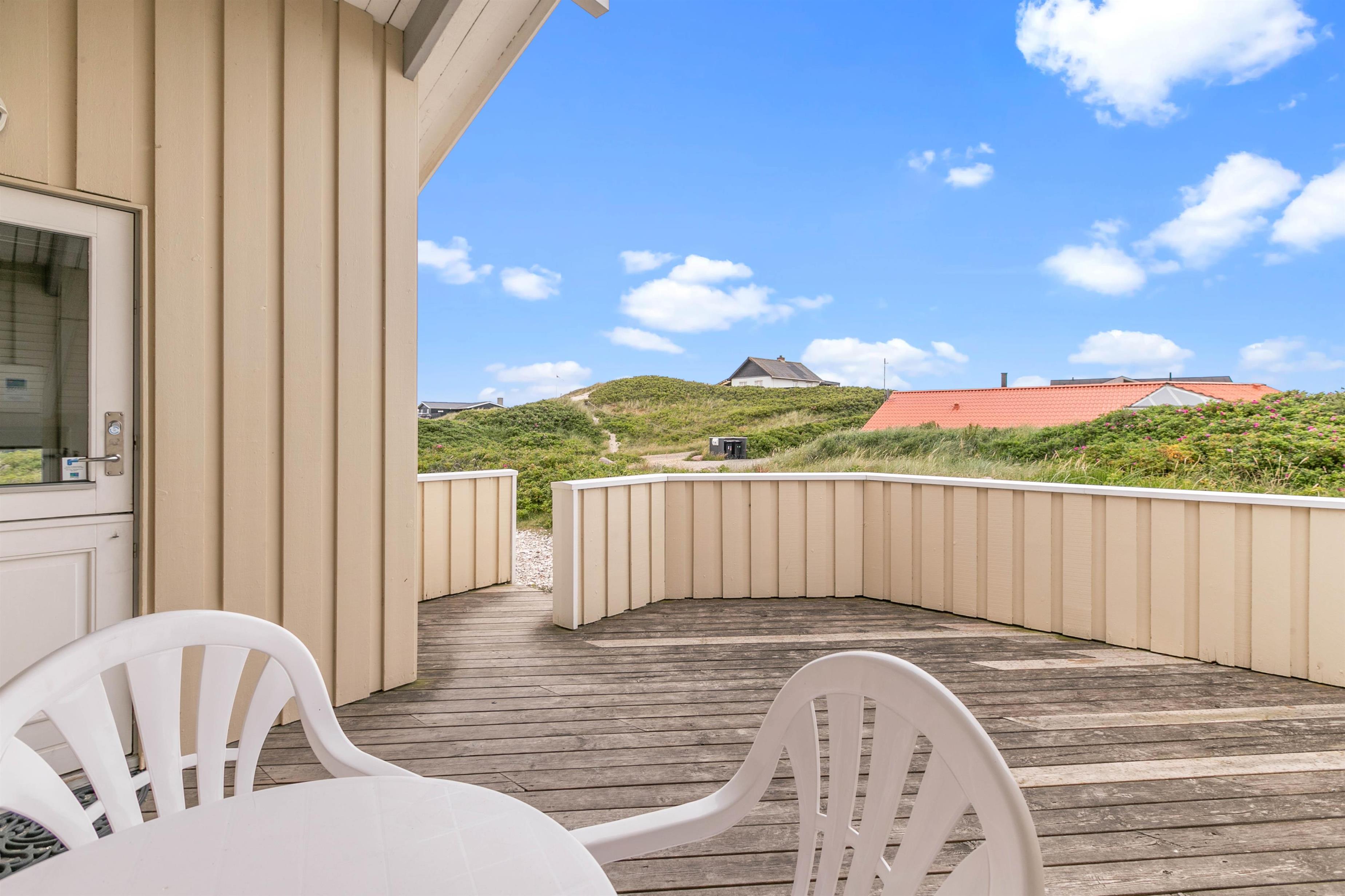 Feriehuset har to skønne træterrasser til solskinsdagene. Her står havemøbler og liggestol klar til jer, mens en stor sandkasse og gyngestativet venter på familiens mindste. Til de lune sommeraftener hører sig lækker grillmad til, så her er grillen parat. Mens I nyder morgenkaffen under den overdækkende del af terrassen, er der en enestående udsigt til klitterne ved Vesterhavet, hvor skønne vidtstrakte sandstrande indbyder til badning eller lange traveture med hundene.
