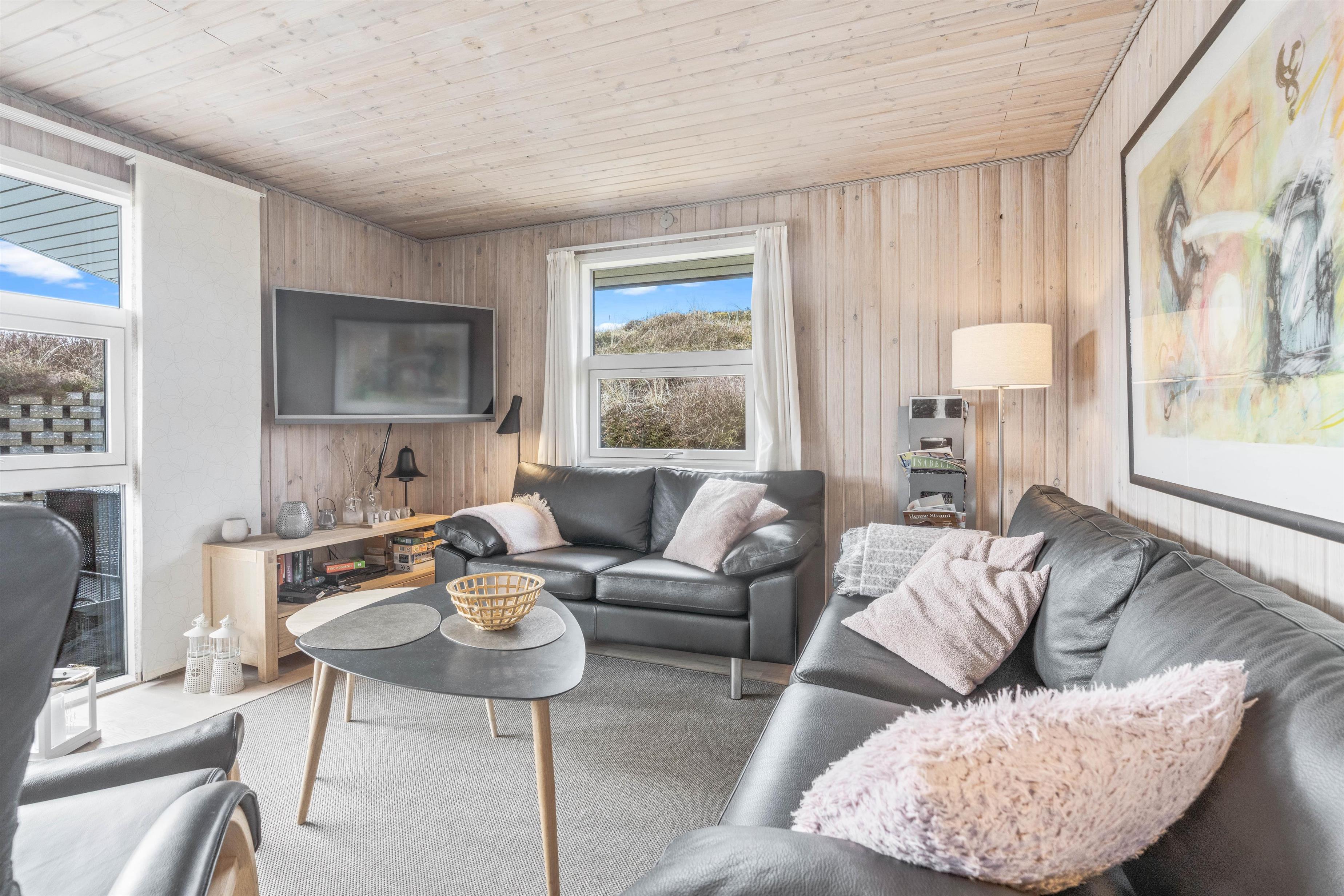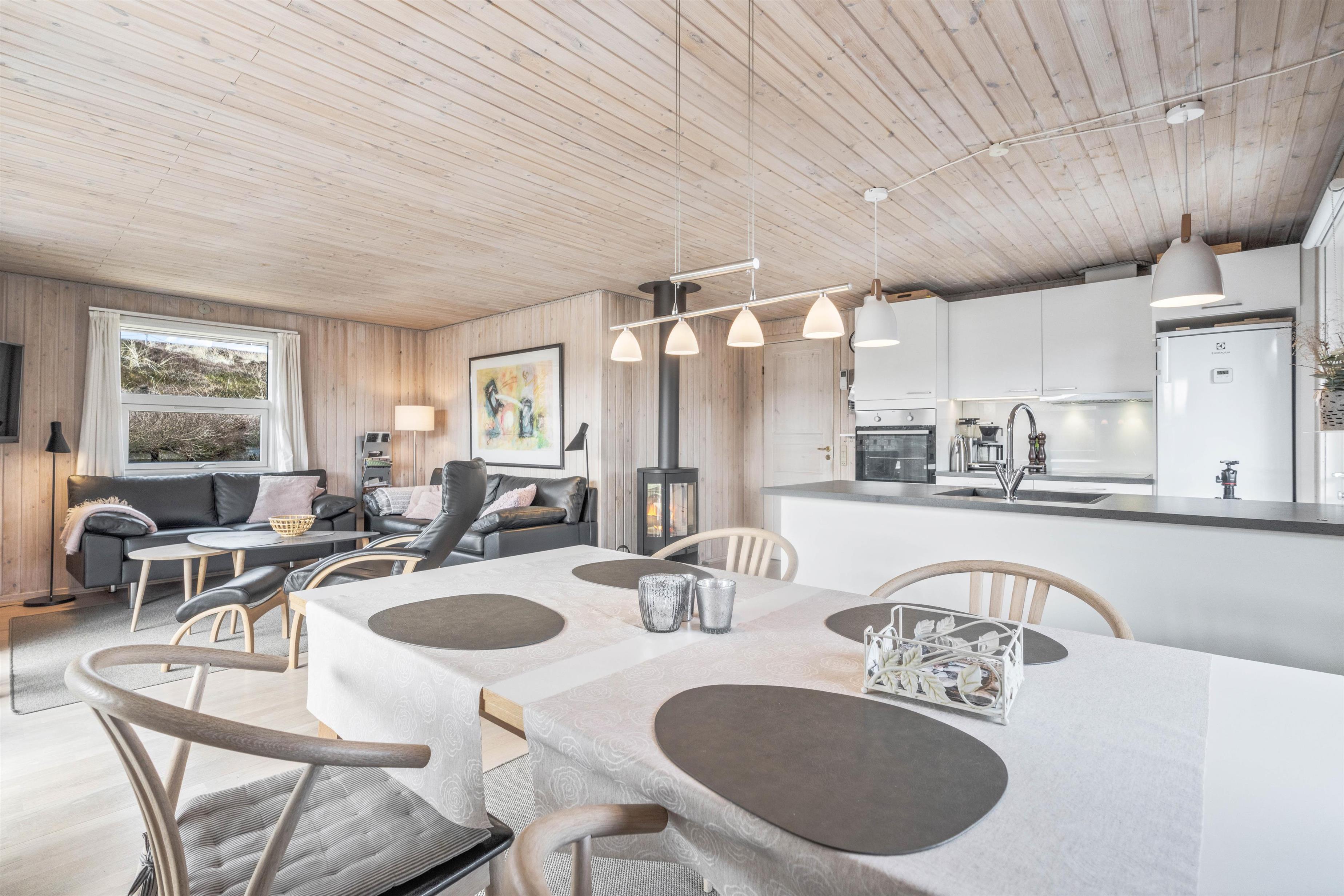 De 3 soveværelser har lyse trælofter og trævægge. 2 af værelserne har dobbeltsenge og det sidste har 2 enkeltsenge. Badeværelset byder på bruseniche, gulvvarme og sauna. Stuen er særdeles hyggelig og brændeovnens knitren kan nydes fra spisebordet.
