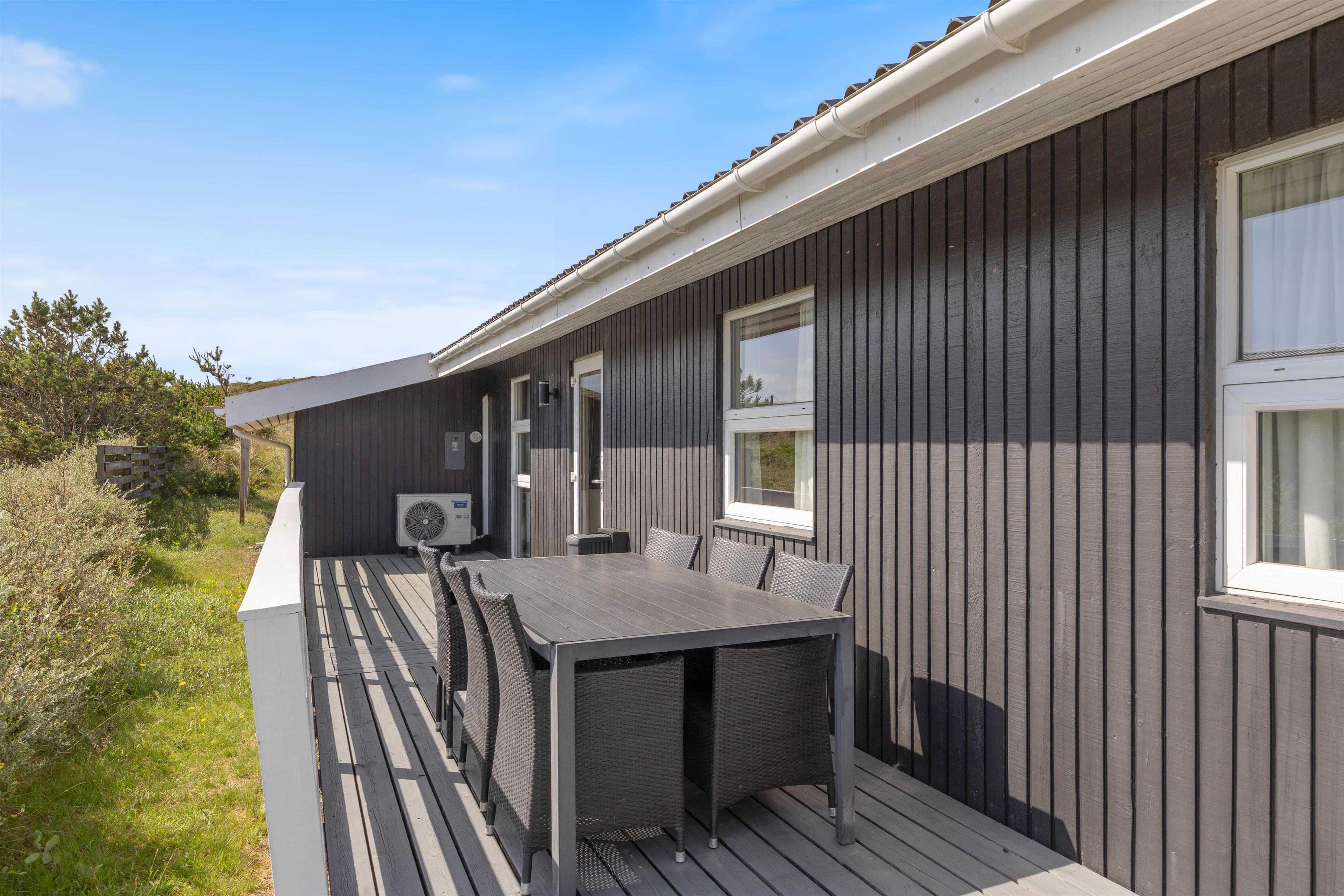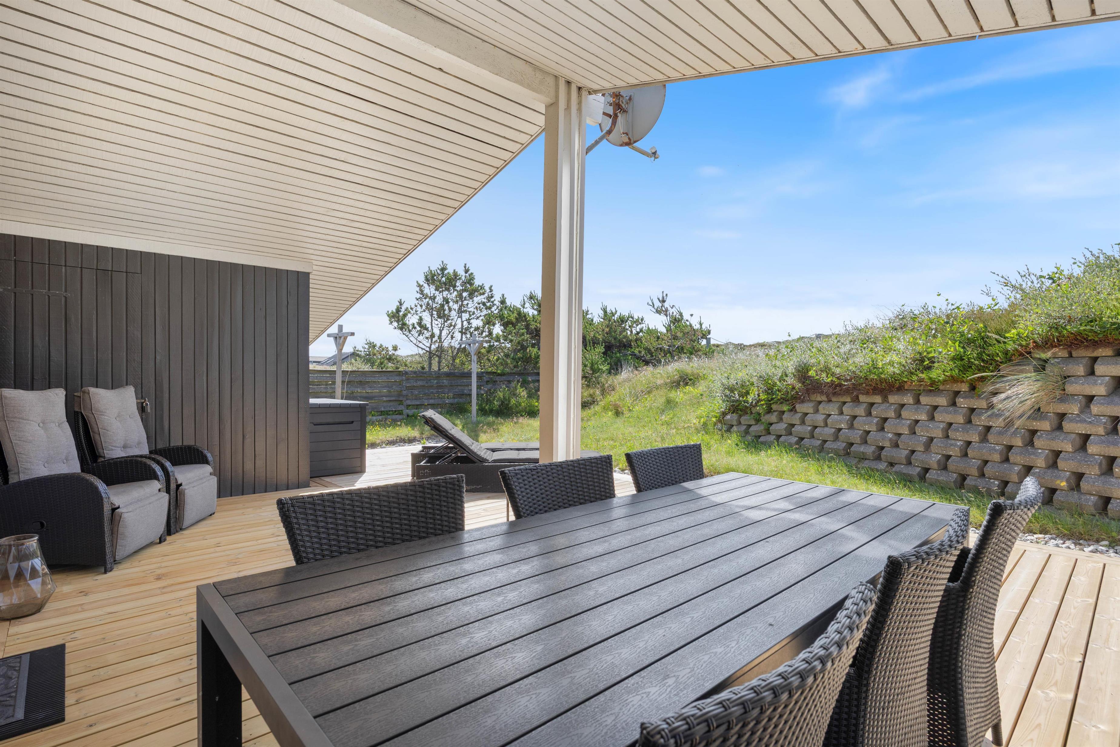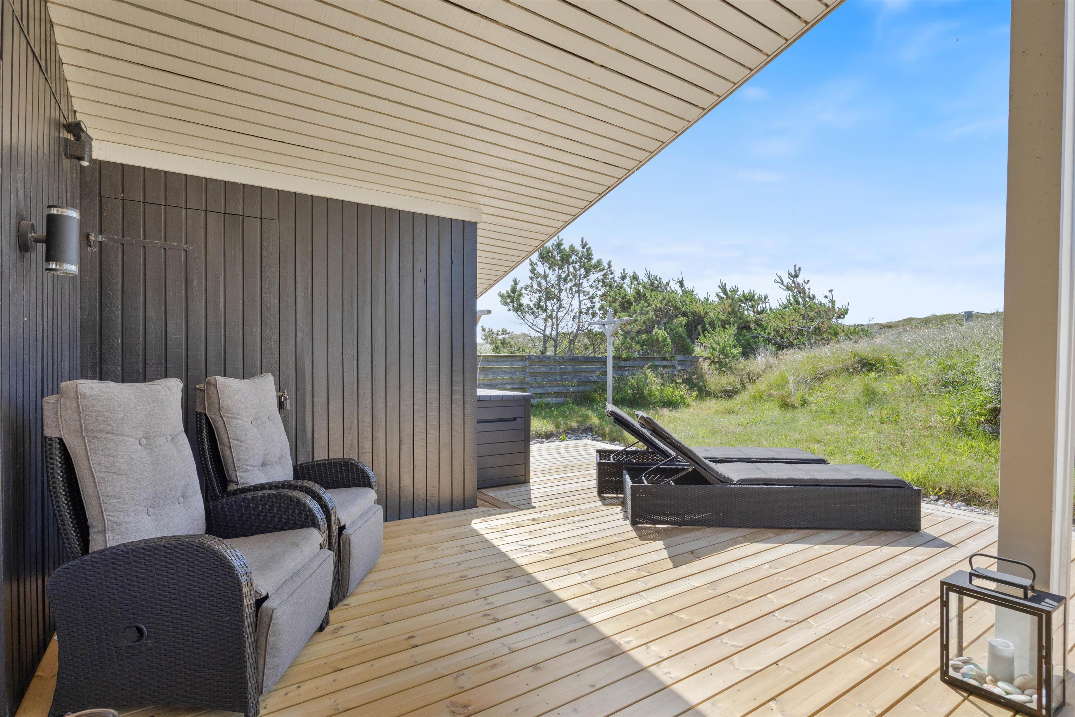 Få sommerhuse har en så skøn og aldeles uforstyrret terrasse som dette. En nærliggende klit danner både læ og giver privatliv der. Terrassen er desuden delvis overdækket, hvilket forlænger "ude-tiden". Den ultimative nydelse må være en skøn grill-middag, hvor man her vil have solnedengangen og det brusende Vesterhav i baggrunden. På en aften-tur over klitterne til stranden kan man rigtig nyde og mærke naturen.