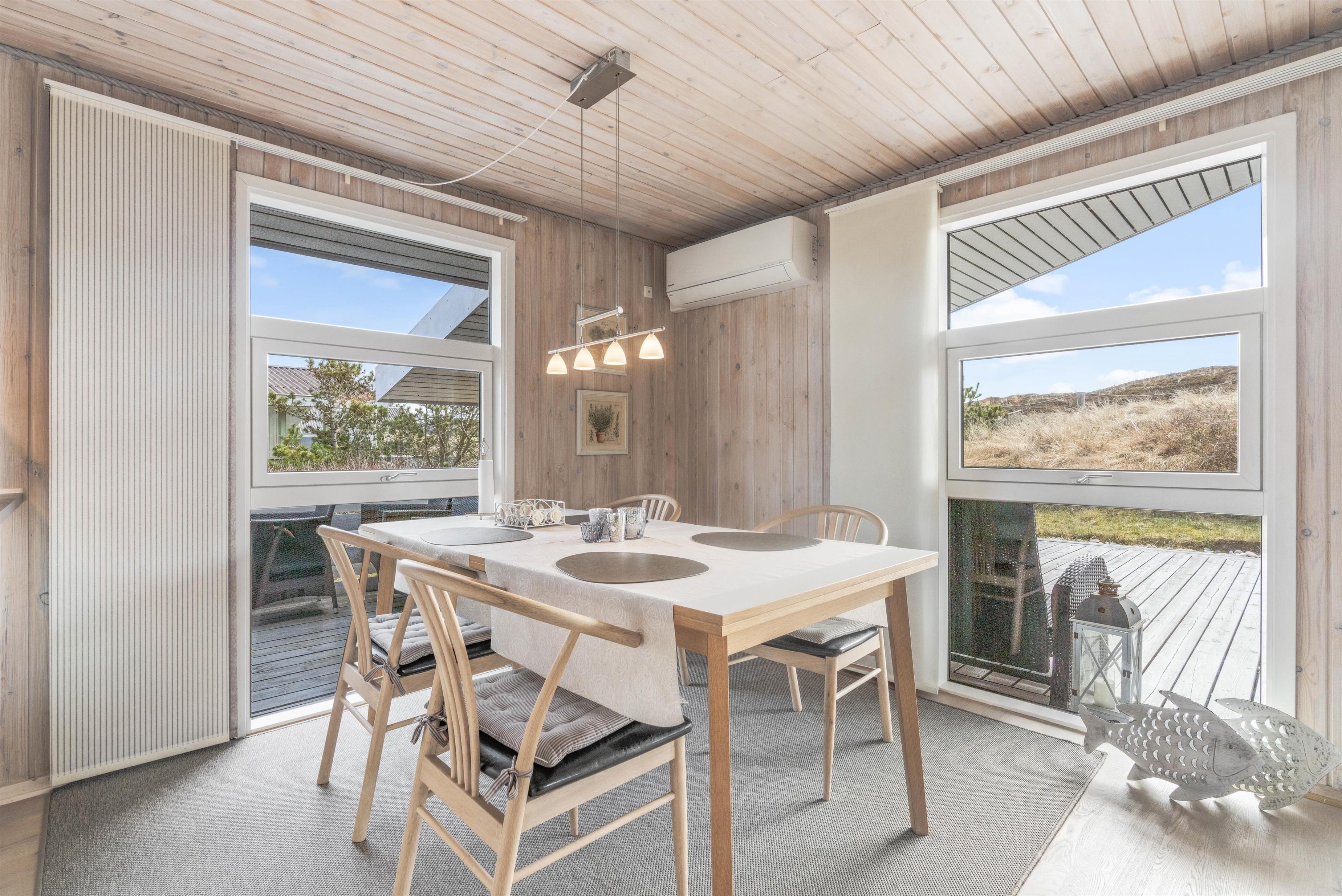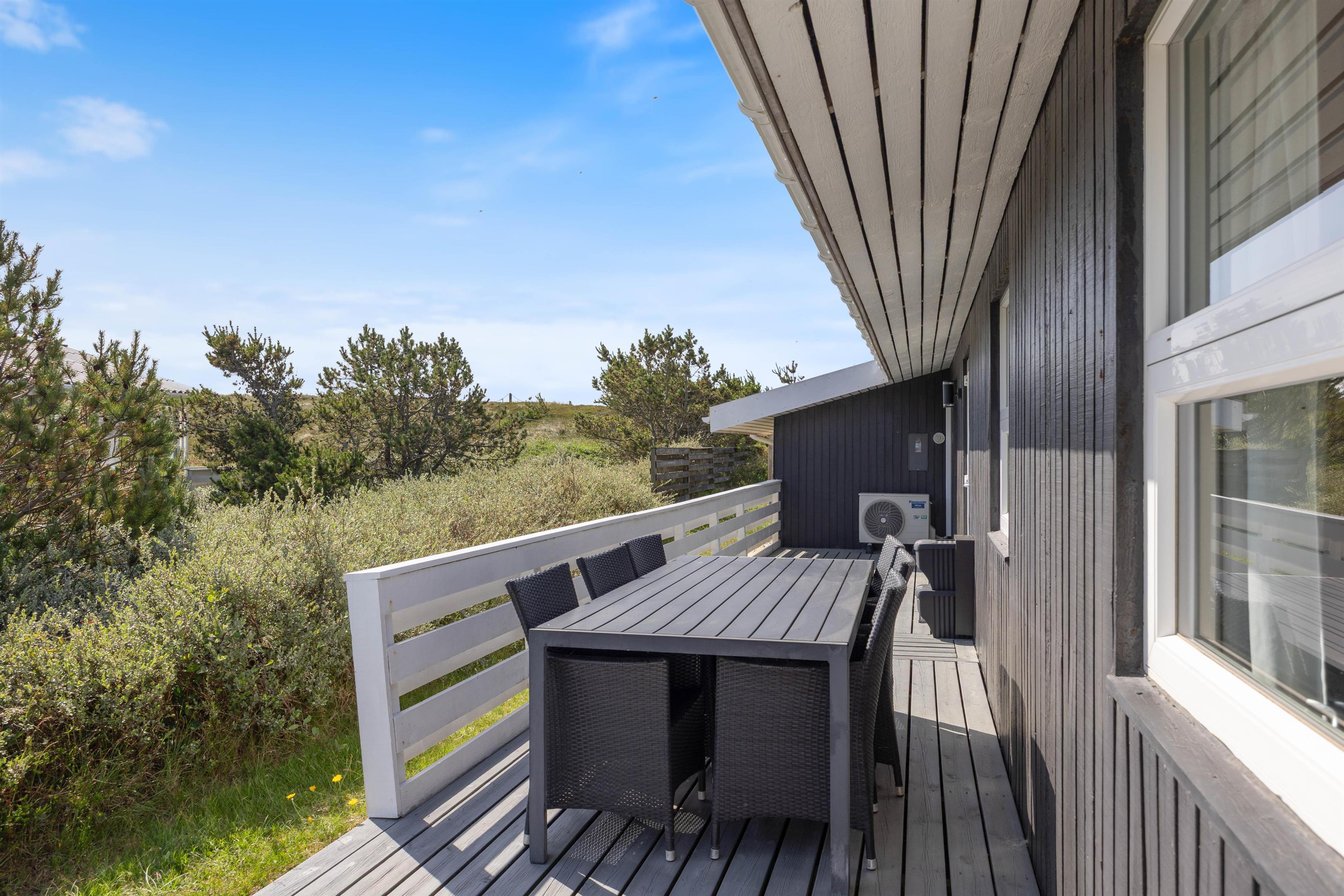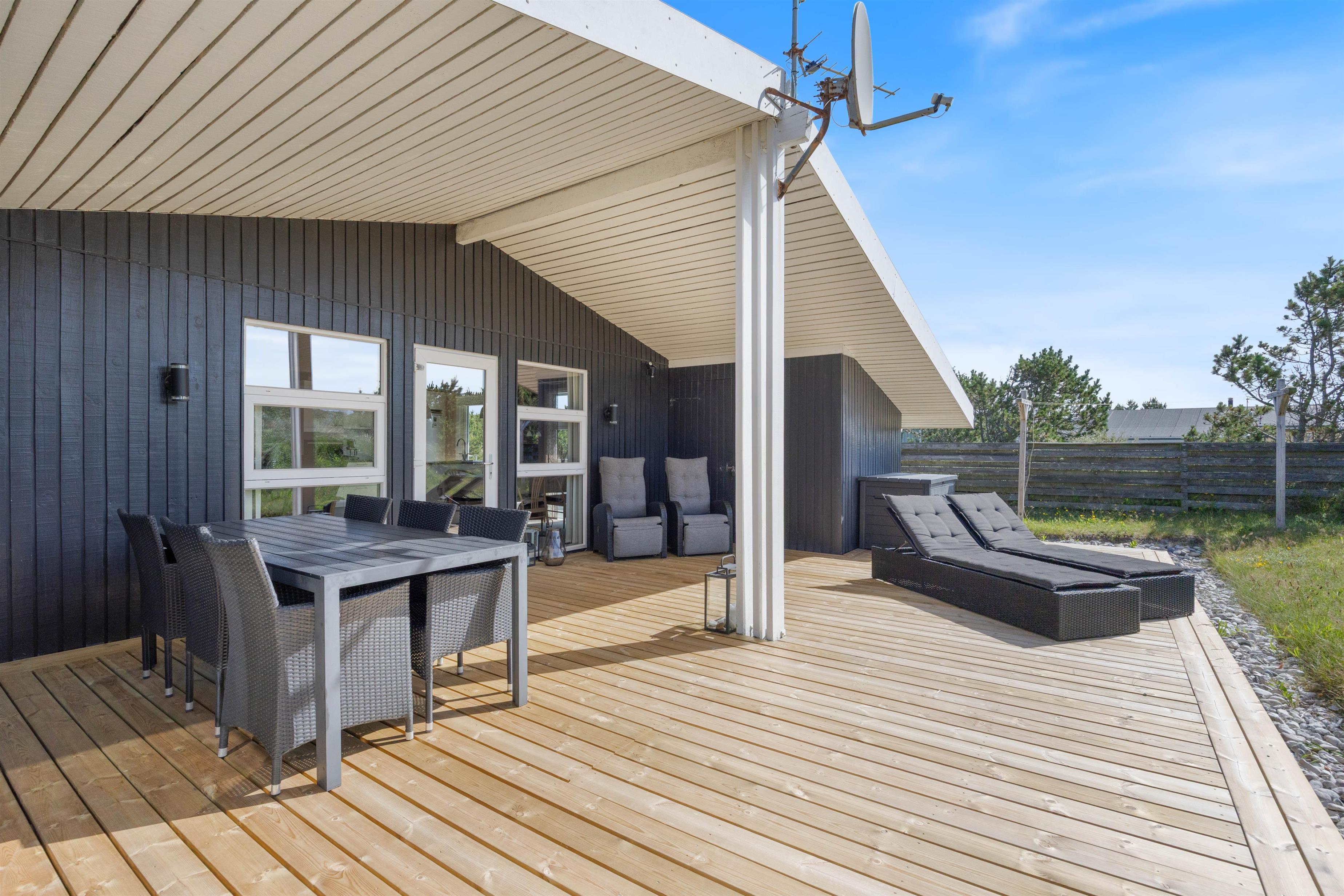 Få sommerhuse har en så skøn og aldeles uforstyrret terrasse som dette. En nærliggende klit danner både læ og giver privatliv der. Terrassen er desuden delvis overdækket, hvilket forlænger "ude-tiden". Den ultimative nydelse må være en skøn grill-middag, hvor man her vil have solnedengangen og det brusende Vesterhav i baggrunden. På en aften-tur over klitterne til stranden kan man rigtig nyde og mærke naturen.