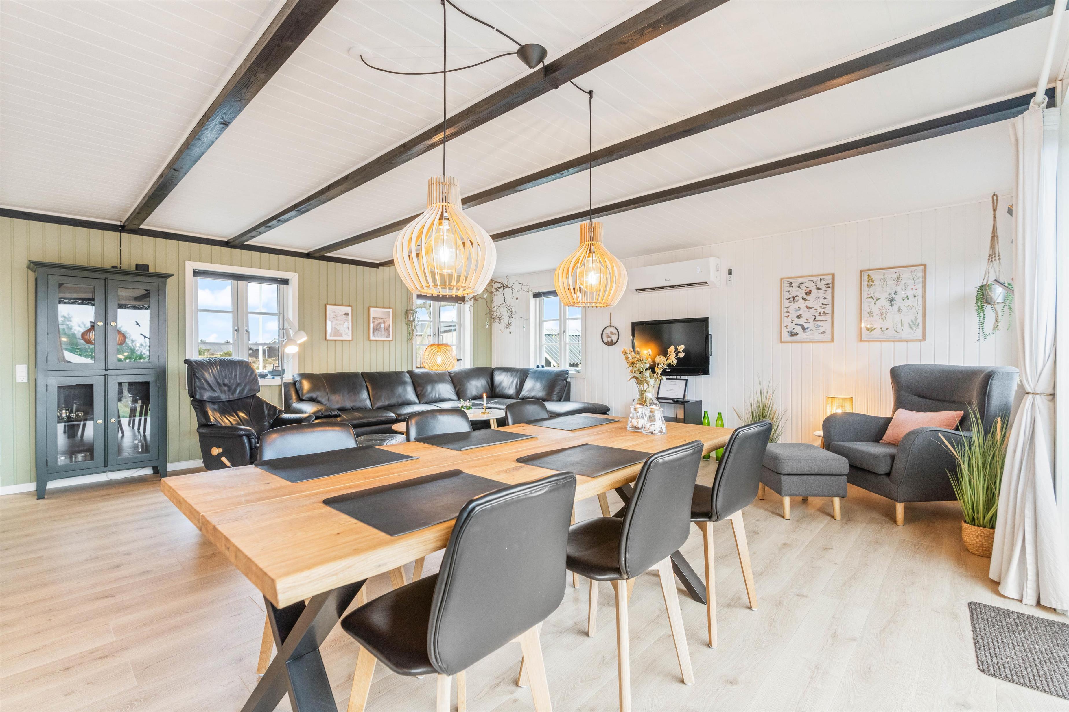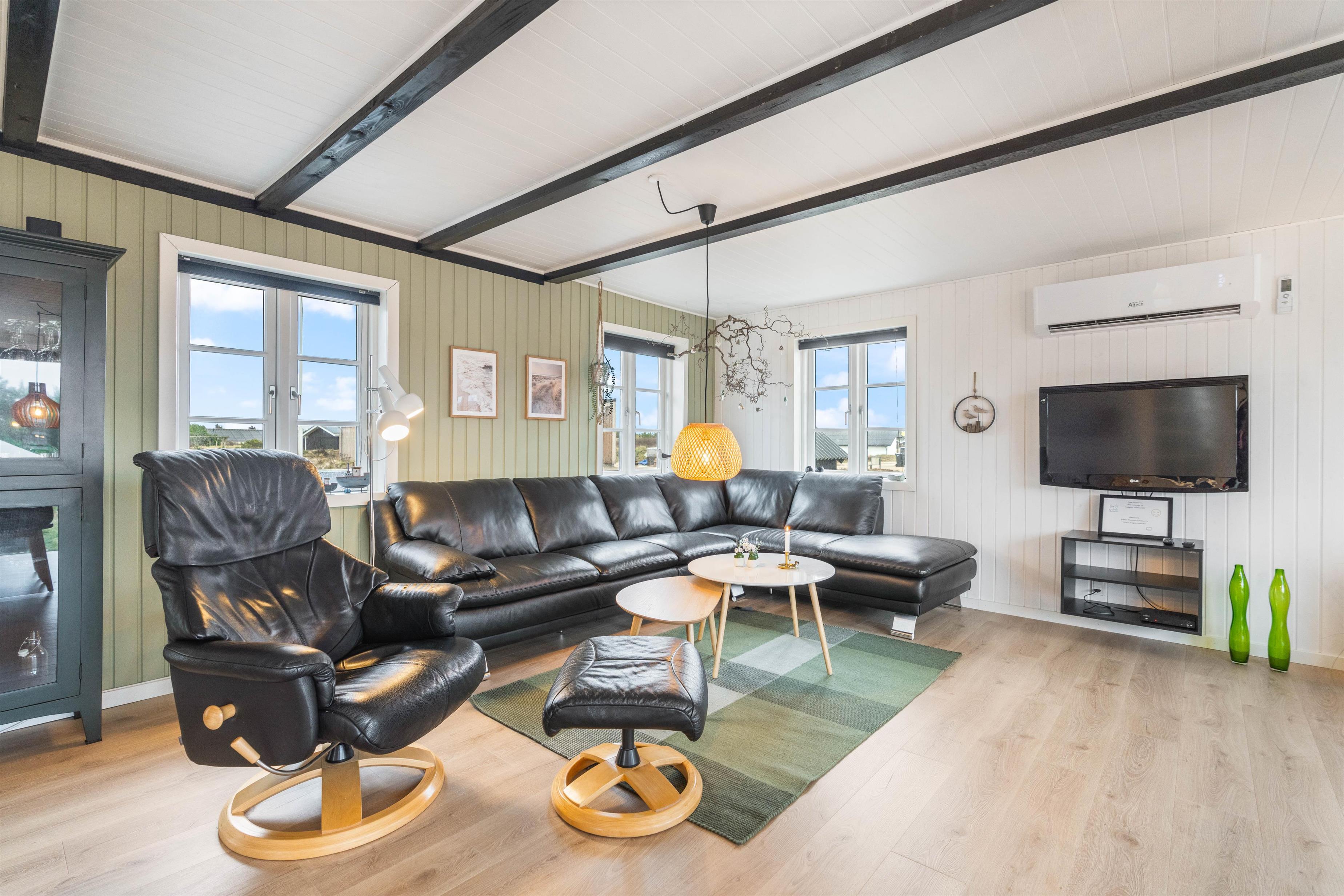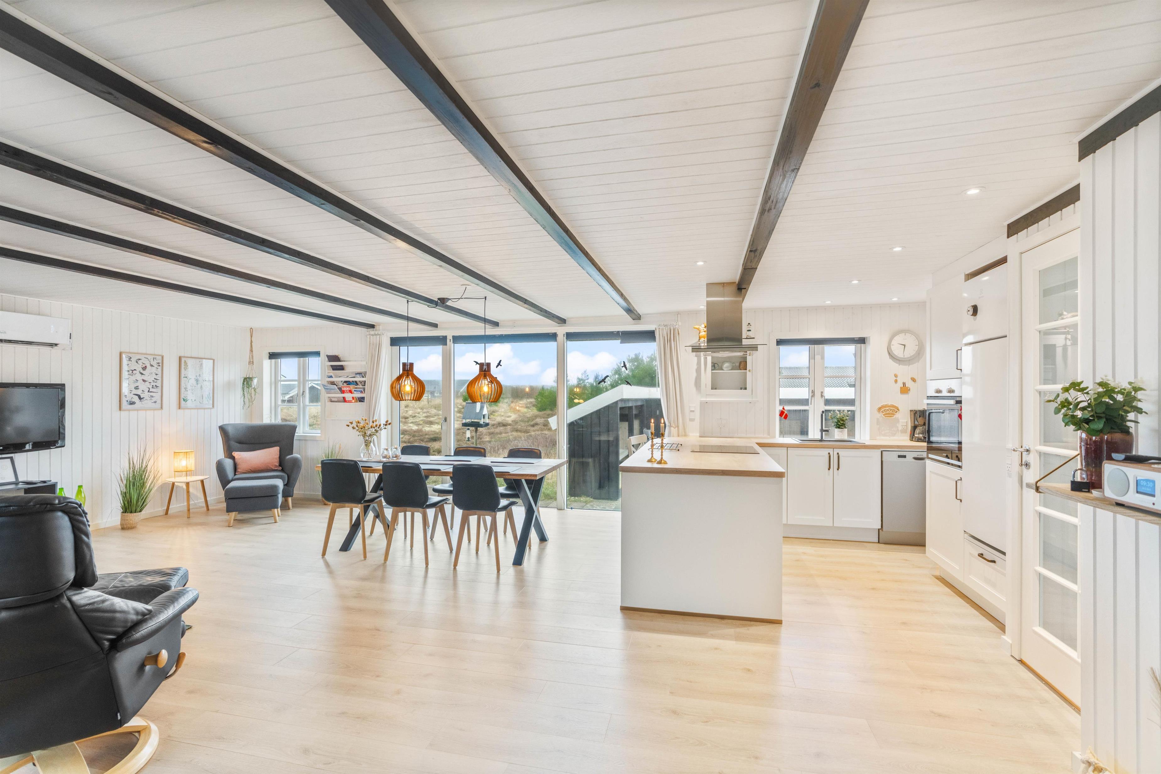 Samlingspunktet i feriehuset er det rummelige opholdsrum, der ligger i åben forbindelse med køkkenet. Her er der plads til hele familien, som kan samles til en hyggelig aften med et spil kort, mens brændeovnen knitrer i baggrunden. Her er også en varmepumpe, som I med fordel kan benytte jer af.